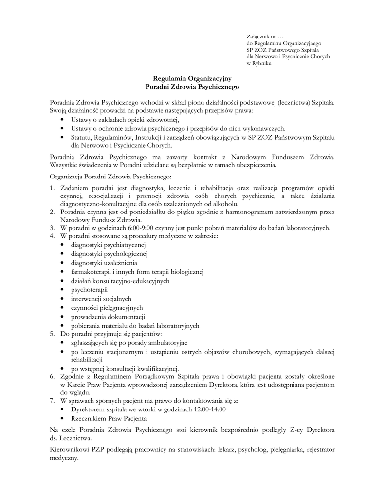 Załącznik nr … do Regulaminu Organizacyjnego SP ZOZ Państwowego Szpitala dla Nerwowo i Psychicznie Chorych w Rybniku Regulamin Organizacyjny Poradni Zdrowia Psychicznego Poradnia Zdrowia Psychicznego wchodzi w skład pionu działalności podstawowej (lecznictwa) Szpitala. Swoją działalność prowadzi na podstawie następujących przepisów prawa: • Ustawy o zakładach opieki zdrowotnej, • Ustawy o ochronie zdrowia psychicznego i przepisów do nich wykonawczych. • Statutu, Regulaminów, Instrukcji i zarządzeń obowiązujących w SP ZOZ Państwowym Szpitalu dla Nerwowo i Psychicznie Chorych. Poradnia Zdrowia Psychicznego ma zawarty kontrakt z Narodowym Funduszem Zdrowia. Wszystkie świadczenia w Poradni udzielane są bezpłatnie w ramach ubezpieczenia. Organizacja Poradni Zdrowia Psychicznego: 1. Zadaniem poradni jest diagnostyka, leczenie i rehabilitacja oraz realizacja programów opieki czynnej, resocjalizacji i promocji zdrowia osób chorych psychicznie, a także działania diagnostyczno-konultacyjne dla osób uzależnionych od alkoholu. 2. Poradnia czynna jest od poniedziałku do piątku zgodnie z harmonogramem zatwierdzonym przez Narodowy Fundusz Zdrowia. 3. W poradni w godzinach 6:00-9:00 czynny jest punkt pobrań materiałów do badań laboratoryjnych. 4. W poradni stosowane są procedury medyczne w zakresie: • diagnostyki psychiatrycznej • diagnostyki psychologicznej • diagnostyki uzależnienia • farmakoterapii i innych form terapii biologicznej • działań konsultacyjno-edukacyjnych • psychoterapii • interwencji socjalnych • czynności pielęgnacyjnych • prowadzenia dokumentacji • pobierania materiału do badań laboratoryjnych 5. Do poradni przyjmuje się pacjentów: • zgłaszających się po porady ambulatoryjne • po leczeniu stacjonarnym i ustąpieniu ostrych objawów chorobowych, wymagających dalszej rehabilitacji • po wstępnej konsultacji kwalifikacyjnej. 6. Zgodnie z Regulaminem Porządkowym Szpitala prawa i obowiązki pacjenta zostały określone w Karcie Praw Pacjenta wprowadzonej zarządzeniem Dyrektora, która jest udostępniana pacjentom do wglądu. 7. W sprawach spornych pacjent ma prawo do kontaktowania się z: • Dyrektorem szpitala we wtorki w godzinach 12:00-14:00 • Rzecznikiem Praw Pacjenta Na czele Poradnia Zdrowia Psychicznego stoi kierownik bezpośrednio podległy Z-cy Dyrektora ds. Lecznictwa. Kierownikowi PZP podlegają pracownicy na stanowiskach: lekarz, psycholog, pielęgniarka, rejestrator medyczny.