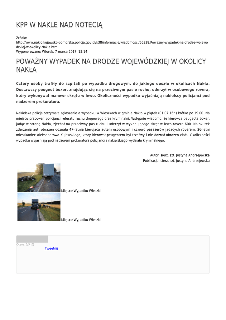 KPP W NAKLE NAD NOTECIĄ Źródło: http://www.naklo.kujawsko-pomorska.policja.gov.pl/k38/informacje/wiadomosci/66338,Powazny-wypadek-na-drodze-wojewo dzkiej-w-okolicy-Nakla.html Wygenerowano: Wtorek, 7 marca 2017, 15:14 POWAŻNY WYPADEK NA DRODZE WOJEWÓDZKIEJ W OKOLICY NAKŁA Cztery osoby trafiły do szpitali po wypadku drogowym, do jakiego doszło w okolicach Nakła. Dostawczy peugeot boxer, znajdując się na przeciwnym pasie ruchu, uderzył w osobowego rovera, który wykonywał manewr skrętu w lewo. Okoliczności wypadku wyjaśniają nakielscy policjanci pod nadzorem prokuratora. Nakielska policja otrzymała zgłoszenie o wypadku w Wieszkach w gminie Nakło w piątek (01.07.16r.) krótko po 19.00. Na miejscu pracowali policjanci referatu ruchu drogowego oraz kryminalni. Wstępnie wiadomo, że kierowca peugeota boxer, jadąc w stronę Nakła, zjechał na przeciwny pas ruchu i uderzył w wykonującego skręt w lewo rovera 600. Na skutek zderzenia aut, obrażeń doznała 47-letnia kierująca autem osobowym i czworo pasażerów jadących roverem. 26-letni mieszkaniec Aleksandrowa Kujawskiego, który kierował peugeotem był trzeźwy i nie doznał obrażeń ciała. Okoliczności wypadku wyjaśniają pod nadzorem prokuratora policjanci z nakielskiego wydziału kryminalnego. Autor: sierż. szt. Justyna Andrzejewska Publikacja: sierż. szt. Justyna Andrzejewska Miejsce Wypadku Wieszki Miejsce Wypadku Wieszki Ocena: 0/5 (0) Tweetnij