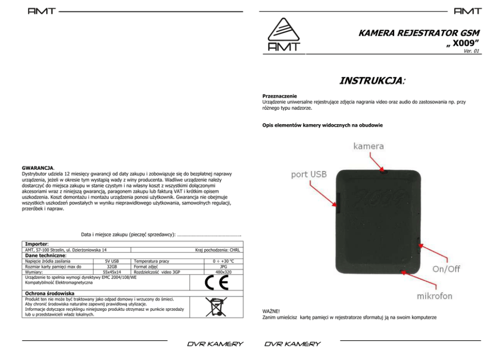 - KAMERA REJESTRATOR GSM „ X009” Ver. 01 INSTRUKCJA: Przeznaczenie Urządzenie uniwersalne rejestrujące zdjęcia nagrania video oraz audio do zastosowania np. przy różnego typu nadzorze. Opis elementów kamery widocznych na obudowie GWARANCJA. Dystrybutor udziela 12 miesięcy gwarancji od daty zakupu i zobowiązuje się do bezpłatnej naprawy urządzenia, jeżeli w okresie tym wystąpią wady z winy producenta. Wadliwe urządzenie należy dostarczyć do miejsca zakupu w stanie czystym i na własny koszt z wszystkimi dołączonymi akcesoriami wraz z niniejszą gwarancją, paragonem zakupu lub fakturą VAT i krótkim opisem uszkodzenia. Koszt demontażu i montażu urządzenia ponosi użytkownik. Gwarancja nie obejmuje wszystkich uszkodzeń powstałych w wyniku nieprawidłowego użytkowania, samowolnych regulacji, przeróbek i napraw. Data i miejsce zakupu (pieczęć sprzedawcy): …………………………………………. Importer: AMT, 57-100 Strzelin, ul. Dzierżoniowska 14 Kraj pochodzenia: CHRL Dane techniczne: Napięcie źródła zasilania 5V USB Temperatura pracy Rozmiar karty pamięci max do 32GB Format zdjęć Wymiary: 55x45x14 Rozdzielczość video 3GP Urządzenie to spełnia wymogi dyrektywy EMC 2004/108/WE Kompatybilność Elektromagnetyczna 0 ÷ +30 oC JPG 480x320 Ochrona środowiska Produkt ten nie może być traktowany jako odpad domowy i wrzucony do śmieci. Aby chronić środowiska naturalne zapewnij prawidłową utylizacje. Informacje dotyczące recyklingu niniejszego produktu otrzymasz w punkcie sprzedaży lub u przedstawicieli władz lokalnych. WAŻNE! Zanim umieścisz kartę pamięci w rejestratorze sformatuj ją na swoim komputerze DVR KAMERY DVR KAMERY - - Do urządzenia należy włożyć kartę SIM bez pinu, zainicjowaną (wykonane próbne połączenie w telefonie) z wyłączona pocztą głosową i włączoną usługą identyfikacji numeru oraz kartę micro sd o pojemności do 32GB. Przed korzystaniem z urządzenia zalecane jest dokładne zapoznanie się z poniższą instrukcją. 888#8# ustawienie czułości mikrofonu dla funkcji 888 możliwe jest w zakresie 8-255 Aby włączyć lub wyłączyć urządzenie należy przytrzymać przycisk funkcyjny z boku podsłuchu przez 3-5 sekund wtedy biała lampka zacznie migać i na koniec inicjacji zgaśnie. 999 Formatowanie karty pamięci micro SD Aby podsłuchiwać wystarczy zadzwonić na numer z włożonej karty SIM , w przypadku braku reakcji należy rozpocząć ładowanie. SOS123456789 uruchomienie połączenia przez naciśnięcie przyciski SOS do numeru 123456789 Urządzenie należy ładować 4-5 godzin aby osiągnąć najlepszą wydajność pracy przy włożonej karcie SIM , najlepiej 4-5 cykli rozładowania/ załadowania. QCSOS kasowanie numeru SOS FUNKCJE uruchamiane po odebraniu przez urządzenie X009 sms-a z odpowiednim kodem WAŻNE! Zanim rozpoczniesz korzystać z tego produktu upewnij się że jest to dozwolone przez prawo obowiązujące w miejscu gdzie zamierzasz je wykorzystywać 000 wykonanie zdjęcia i jego zapis na karcie pamięci Przybliżone czasy pracy dla nowej w pełni naładowanej baterii 111 wykonanie i zdjęcia i odesłanie go MMSem na numer z którego przyszedł kod Działa tylko przy za karcie SIM operatora PLAY, Orange, Plus lub T-mobile Czas nagrania wideo do 6 godzin lub non-stop przy podłączeniu do prądu Czas nagrania audio non-stop do 10 godzin lub non-stop przy podłączeniu do prądu Czas nasłuchu do 3 godzin w zależności od warunków pracy ( pokrycia sieci, zasięgu ) lub non-stop przy podłączeniu do prądu Czas czuwania do 7 dni w zależności od warunków pracy ( pokrycia sieci, zasięgu ) lub non-stop przy podłączeniu do prądu 222 Uruchomi nagrywanie video na karcie pamięci micro SD 333 Uruchomi nagrywanie dźwięku na karcie pamięci micro SD 444 Zakończy nagrywanie na karcie pamięci video lub dźwięku oraz zakończy działanie funkcji 777 i 888 666 Uruchomienie monitoringu stanu baterii 123 Wyłączenie monitoringu stanu baterii 777 Po przekroczeniu 60dB uruchomi nagrywanie dźwięku i prześle sms z informacją WARNING! Enyone entered następnie wyśle zapisaną wiadomość głosowa 777#8# ustawienie czułości mikrofonu dla funkcji 777 możliwe jest w zakresie 8-255 888 Po przekroczeniu 60dB rozpocznie połączenie z numerem który wysłał do niego komendę sms DVR KAMERY DVR KAMERY