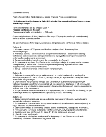 Szanowni Państwo, Polskie Towarzystwo Kardiologiczne, Sekcja Krążenia Płucnego organizuje: „V Ogólnopolską Konferencję Sekcji Krążenia Płucnego Polskiego Towarzystwa Kardiologicznego” . Termin konferencji: 18-19 listopad 2016 r Miejsce konferencji: Poznań Przewidywana liczba uczestników: ~ 250 osób Organizację konferencji Sekcji Krążenia Płucnego PTK pragnie powierzyć profesjonalnej firmie z dużym doświadczeniem. Do głównych zadań firmy odpowiedzialnej za zorganizowanie konferencji należeć będzie: Zadanie 1: 1. Wynajem na rzecz PTK przestrzeni i sal na miejsce obrad i wystawę firm farmaceutycznych. 2. Aranżacja obiektu i sali wykładowej dla potrzeb konferencji. Zapewnienie obsługi technicznej sali wykładowej i całego obiektu wraz z przygotowaniem pomieszczenia i systemu dla przyjmowania prezentacji. 3. Zapewnienie obsługi cateringowej dla uczestników konferencji. 4. Przygotowanie wystawy firm farmaceutycznych i produkujących sprzęt medyczny oraz korespondencja techniczna z firmami i zapewnienie pomocy wystawcom w czasie przygotowania stoisk wystawienniczych. 5. Zakup i spakowanie toreb z materiałami kongresowymi. Zadanie 2: 1. Rejestracja uczestników drogą elektroniczną i w czasie konferencji, z możliwością dokonywania płatności kartą płatniczą, obsługa recepcji z wydawaniem identyfikatorów i materiałów kongresowych. 2. Gromadzenie na specjalnie do tego celu utworzonym subkoncie opłat zjazdowych wpłacanych przez uczestników konferencji lub inne podmioty działające w ich imieniu, ich księgowanie oraz wystawianie odpowiednich dokumentów księgowych celem potwierdzenia wpływu ww. opłat zjazdowych. 3. Zorganizowanie zakwaterowania wraz z wyżywieniem dla uczestników konferencji, w tym rezerwacja hotelu dla wykładowców i zaproszonych Gości konferencji. Zadanie 3: 1. Zapewnienie informacji oraz korespondencji z zaproszonymi Gośćmi, wykładowcami i prezentującymi prace naukowe. 2. Przygotowanie i prowadzenie strony www konferencji (uruchomienie pierwszej wersji w ciągu miesiąca od podpisania umowy) 3. Szeroka informacja o konferencji (media, strona internetowa, czasopisma medyczne). 4. Przygotowanie i wydanie materiałów konferencyjnych, w tym programu konferencji. 5. Opracowanie logo konferencji (w ciągu 14 dni od podpisania umowy). 6. Ubezpieczenie konferencji. 7. Przygotowanie niezbędnych dokumentów księgowych i współpraca w rozliczeniu konferencji z Działem Finansowo-Księgowym PTK. Oferty w wersji papierowej, podpisane przez osoby umocowane do reprezentowania oferenta, należy składać w terminie do 31.12.2015 r. na adres: Prof. dr hab. Tatiana Mularek-Kubzdela I Klinika Kardiologii Uniwersytetu Medycznego im K. Marcinkowskiego w Poznaniu, Ul. Długa ½ Poznań z dopiskiem „VI Konferencja Sekcji Krążenia Płucnego PTK ”. oraz równolegle w wersji elektronicznej należy przesłać na adres: [email protected] Oferta winna zawierać informacje w/g wykazanej poniżej specyfikacji, niezbędnej w przypadku podjęcia decyzji o zawarciu umowy: 1. Firma, siedziba i adres oferenta oraz dokumenty potwierdzające status prawny oferenta (aktualny odpis z właściwego rejestru albo zaświadczenie o wpisie do ewidencji działalności gospodarczej). 2. Dokumenty stwierdzające, że osoby, które będą działać przy wykonaniu oferty (umowy) posiadają wymagane przepisami prawa uprawnienia. 3. Zaświadczenie z właściwego urzędu skarbowego oraz właściwego oddziału ZUS potwierdzające, że oferent nie zalega z opłacaniem podatków, opłat oraz składek na ubezpieczenie społeczne wystawione nie wcześniej niż na 3 miesiące przed upływem terminu składania ofert. 4. Oświadczenia oferenta, że nie wszczęto wobec niego postępowania upadłościowego ani nie ogłoszono upadłości oraz, że nie jest w stanie likwidacji; 5. Referencje świadczące o doświadczeniu oferenta w przeprowadzeniu przynajmniej trzech tego typu konferencji naukowych z udziałem środowiska medycznego. 6. Szczegółowe określenie przedmiotu oferty, 7. Wskazanie podwykonawców, jeśli oferent zamierza z nich skorzystać, 8. Określenie ceny wykonania zamówienia wraz ze sposobem obliczenia ceny oraz kosztorysem, 9. Oświadczenie oferenta o znajomości warunków uczestnictwa w niniejszym postępowaniu ofertowym i nie zgłaszaniu w stosunku do Polskiego Towarzystwa Kardiologicznego, żadnych roszczeń związanych z niniejszym postępowaniem oraz złożoną ofertą, w tym związanych z nie wybraniem oferty oferenta lub nie wybraniem żadnej oferty, a także związanych z ewentualnym unieważnieniem niniejszego postępowania. Szczegółowy zakres i warunki współpracy zostaną sprecyzowane przez strony w umowie. Komisja zastrzega sobie prawo swobodnego wyboru oferty lub jej elementów, jak również nie wybrania żadnej ze złożonych ofert bez konieczności uzasadnienia swojej decyzji i bez konieczności zawiadamiania o powziętej decyzji. Do niniejszego zaproszenia do składania ofert nie stosuje się przepisów art. 66-71 kodeksu cywilnego. Z tytułu nieprzyjęcia oferty oferentowi nie przysługują żadne roszczenia w stosunku do PTK. Oceny ofert dokona komisja złożona z członków Komitetu Organizacyjnego i Zarządu Sekcji Krążenia Płucnego. Powyższe postępowanie przebiegać będzie dwuetapowo: - I etap złożenie oferty; - II etap spotkanie z oferentami wybranymi w pierwszym etapie kwalifikacji. PTK może zrezygnować z II etapu postępowania bez podania przyczyny. Harmonogram: Termin składania ofert w formie pisemnej i elektronicznej: 31 grudnia 2015. Otwarcie ofert i rozstrzygnięcie: 15 stycznia 2016 Planowane podpisanie umowy: 10 lutego 2016. Michał Ciurzyński Tatiana Mularek-Kubzdela w imieniu Komitet Organizacyjny VI Ogólnopolskiej Konferencji Sekcji Krążenia Płucnego Polskiego Towarzystwa Kardiologicznego” . Jako załącznik do oferty, stanowiący jej część integralną, należy przedstawić koszty z uwzględni
