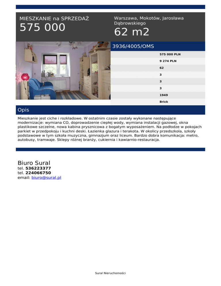 MIESZKANIE na SPRZEDAŻ 575 000 Warszawa, Mokotów, Jarosława Dąbrowskiego 62 m2 3936/4005/OMS 575 000 PLN 9 274 PLN 62 3 3 3 1949 Brick Opis Mieszkanie jest ciche i rozkładowe. W ostatnim czasie zostały wykonane następujące modernizacje: wymiana CO, doprowadzenie ciepłej wody, wymiana instalacji gazowej, okna plastikowe szczelne, nowa kabina prysznicowa z bogatym wyposażeniem. Na podłodze w pokojach parkiet w przedpokoju i kuchni deski. Łazienka glazura i terakota. W okolicy przedszkola, szkoły podstawowe w tym szkoła muzyczna, gimnazjum oraz liceum. Bardzo dobra komunikacja: metro, autobusy, tramwaje. Sklepy różnej branży, cukiernia i kawiarnio-restauracja. Biuro Sural tel. 536223377 tel. 224066750 email: [email protected] Sural Nieruchomości Powered by TCPDF (www.tcpdf.org)