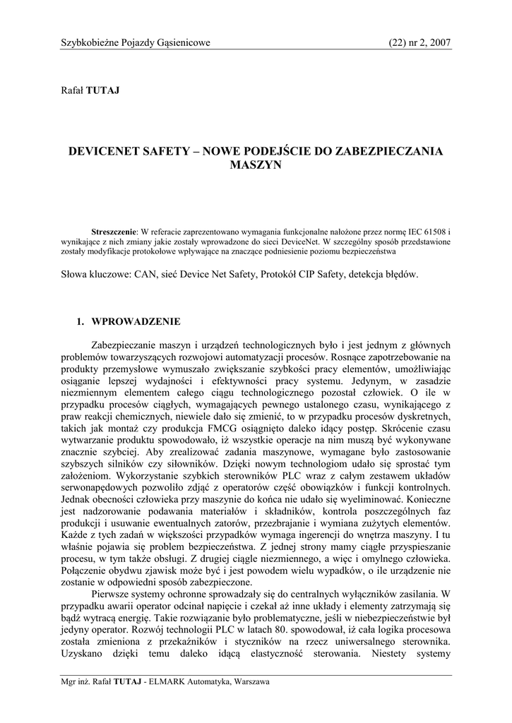 Szybkobieżne Pojazdy Gąsienicowe (22) nr 2, 2007 Rafał TUTAJ DEVICENET SAFETY – NOWE PODEJŚCIE DO ZABEZPIECZANIA MASZYN Streszczenie: W referacie zaprezentowano wymagania funkcjonalne nałożone przez normę IEC 61508 i wynikające z nich zmiany jakie zostały wprowadzone do sieci DeviceNet. W szczególny sposób przedstawione zostały modyfikacje protokołowe wpływające na znaczące podniesienie poziomu bezpieczeństwa Słowa kluczowe: CAN, sieć Device Net Safety, Protokół CIP Safety, detekcja błędów. 1. WPROWADZENIE Zabezpieczanie maszyn i urządzeń technologicznych było i jest jednym z głównych problemów towarzyszących rozwojowi automatyzacji procesów. Rosnące zapotrzebowanie na produkty przemysłowe wymuszało zwiększanie szybkości pracy elementów, umożliwiając osiąganie lepszej wydajności i efektywności pracy systemu. Jedynym, w zasadzie niezmiennym elementem całego ciągu technologicznego pozostał człowiek. O ile w przypadku procesów ciągłych, wymagających pewnego ustalonego czasu, wynikającego z praw reakcji chemicznych, niewiele dało się zmienić, to w przypadku procesów dyskretnych, takich jak montaż czy produkcja FMCG osiągnięto daleko idący postęp. Skrócenie czasu wytwarzanie produktu spowodowało, iż wszystkie operacje na nim muszą być wykonywane znacznie szybciej. Aby zrealizować zadania maszynowe, wymagane było zastosowanie szybszych silników czy siłowników. Dzięki nowym technologiom udało się sprostać tym założeniom. Wykorzystanie szybkich sterowników PLC wraz z całym zestawem układów serwonapędowych pozwoliło zdjąć z operatorów część obowiązków i funkcji kontrolnych. Jednak obecności człowieka przy maszynie do końca nie udało się wyeliminować. Konieczne jest nadzorowanie podawania materiałów i składników, kontrola poszczególnych faz produkcji i usuwanie ewentualnych zatorów, przezbrajanie i wymiana zużytych elementów. Każde z tych zadań w większości przypadków wymaga ingerencji do wnętrza maszyny. I tu właśnie pojawia się problem bezpieczeństwa. Z jednej strony mamy ciągłe przyspieszanie procesu, w tym także obsługi. Z drugiej ciągle niezmiennego, a więc i omylnego człowieka. Połączenie obydwu zjawisk może być i jest powodem wielu wypadków, o ile urządzenie nie zostanie w odpowiedni sposób zabezpieczone. Pierwsze systemy ochronne sprowadzały się do centralnych wyłączników zasilania. W przypadku awarii operator odcinał napięcie i czekał aż inne układy i elementy zatrzymają się bądź wytracą energię. Takie rozwiązanie było problematyczne, jeśli w niebezpieczeństwie był jedyny operator. Rozwój technologii PLC w latach 80. spowodował, iż cała logika procesowa została zmieniona z przekaźników i styczników na rzecz uniwersalnego sterownika. Uzyskano dzięki temu daleko idącą elastyczność sterowania. Niestety systemy Mgr inż. Rafał TUTAJ - ELMARK Automatyka, Warszawa Rafał TUTAJ bezpieczeństwa w tym okresie zostały rozbudowane jedynie o funkcję odcinania wyjść (sterownik mógł być dalej zasilany) oraz w wielu przypadkach dodawano czujniki zamknięcia osłon. Każda zmiana w układach zabezpieczeń wymagała w dalszym ciągu poprawek sprzętowych. Lata 90. przyniosły niemalże lawinowy rozwój technik sieciowych. Stworzenie takich systemów jak DeviceNet, Profibus czy ControlNet pozwoliło na rezygnację z doprowadzania wszystkich sygnałów do centralnego sterownika. Zastąpiono je modułami we/wy umieszczanymi blisko źródeł i odbiorców sygnałów połączonymi ze sterownikiem kablem magistralowym. Takie rozwiązanie po pierwsze znacznie obniżyło koszty całości, po drugie zwiększyło elastyczność i konfigurowalność systemu, i wreszcie pozwoliło na poprawienie mechanizmów diagnostycznych. Ciągle jednak technologia oraz przepisy nie pozwalały na zastosowanie tego pomysłu w układach bezpieczeństwa. Początek XXI wieku stał się przełomowym okresem dla zabezpieczeń. Wielu dostawców po ugruntowaniu właściwości sieci rozpoczęło prace nad stworzeniem rozwiązania przenoszącego wspomniane wyżej możliwości do systemów bezpieczeństwa. Wychodząc naprzeciw, organizacje normujące stworzyły międzynarodowy standard określany jako IEC 61508. Zawarta w nim treść definiowała m.in. generalne zasady zabezpieczania urządzeń przy pomocy programowalnych układów elektronicznych, a w szczególności połączonych za pomocą sieci. Jednym z jej elementów jest określenie wiarygodności systemu jako układu bezpieczeństwa. Wyraża się on klasą SIL (Safety Integrity Level) zależną od prawdopodobieństwa wystąpienia błędu wewnętrznego w czasie pracy systemu. Podstawowym zadaniem dla sieciowego systemu bezpieczeństwa nie jest to, by nie było żadnej awarii układu, ale to aby w przypadku ich wystąpienia wszystkie wskazane urządzenia zostały przełączone w odpowiedni znany stan bezpieczny. Dla zdecydowanej większości aplikacji przemysłowych zaleca się stosowanie klasy SIL 3, co oznacza, że w trakcie pracy w pełni obciążonego systemu niezauważony lub źle zidentyfikowany błąd może się pojawić raz na 150 lat ciągłej pracy. Spełnienie takiego warunku nie jest rzeczą łatwą, stąd większość dostawców zdecydowała się na stworzenie oddzielnych, dedykowanych sieci, wewnątrz których możliwa jest komunikacja wyłącznie z urządzeniami bezpieczeństwa. Dzięki uniwersalnemu protokołowi CIP, stanowiącemu definicję warstw wyższych sieci DeviceNet udało się dodać do istniejącej od 1994 roku koncepcji nowe funkcje, tworząc DeviceNet Safety. 2. DEVICENET SAFETY – NOWE ELEMENTY W STAREJ SIECI Podstawą do zapewnienia pełnej fukcjonalności wymaganej przez normę IEC 61508 było zbudowanie uniwersalnego protokołu CIPsafety. Common Industrial Protocol jest niezależną od warstwy fizycznej definicją właściwości urządzeń przemysłowych i metod ich komunikowania. Na 