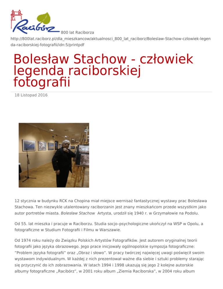 800 lat Raciborza http://800lat.raciborz.pl/dla_mieszkancow/aktualnosci_800_lat_raciborz/Boleslaw-Stachow-czlowiek-legen da-raciborskiej-fotografii/idn:5/printpdf Bolesław Stachow - człowiek legenda raciborskiej fotografii 18 Listopad 2016 kategoria: Wiadomości i wydarzenia 12 stycznia w budynku RCK na Chopina miał miejsce wernisaż fantastycznej wystawy prac Bolesława Stachowa. Ten niezwykle utalentowany raciborzanin jest znany mieszkańcom przede wszystkim jako autor portretów miasta. Bolesław Stachow Artysta, urodził się 1940 r. w Grzymałowie na Podolu. Od 55. lat mieszka i pracuje w Raciborzu. Studia socjo–psychologiczne ukończył na WSP w Opolu, a fotograficzne w Studium Fotografii i Filmu w Warszawie. Od 1974 roku należy do Związku Polskich Artystów Fotografików. Jest autorem oryginalnej teorii fotografii jako języka obrazowego. Jego prace inicjowały ogólnopolskie sympozja fotograficzne: ”Problem języka fotografii” oraz „Obraz i słowo”. W pracy twórczej najwięcej uwagi poświęcił swoim wystawom indywidualnym. W każdej z nich prezentował ważne dla siebie i sztuki problemy starając się przyczynić do ich zobrazowania. W latach 1994 i 1998 ukazują się jego 2 kolejne autorskie albumy fotograficzne „Racibórz”, w 2001 roku album „Ziemia Raciborska”, w 2004 roku album fotograficzno - poetycki „Poeta Ziemi Naszej”, w 2007 roku album „Racibórz - cztery pory roku” . W roku 2010 wydał albumy: „Obrazy z historii miasta Raciborza” oraz „Racibórz – inspiracje”. Pobieżny przegląd prac tego nietuzinkowanego artsty pokazuje, że w centrum jego zainteresowań zawsze leżało miasto. W rozmowie mistrz powiedział, że jego wystawa zorganizowana z okazji 800 lecia praw miejskich Raciborza pokazuje, jak ciekawa jest to przestrzeń i jak wiele jest sposobów, by odczytać miasto. Pierwsze zdjęcie pokazuje ziemię - podkreśla Bolesław Stachow -i Racibórz z tej właśnie perspektywy. Kolejne obrazy zdają się przybliżać miasto. Racibórz w dolinie Odry, konkretne budynki, ulice, obiekty, wreszcie to, co tak naprawdę buduje miasto - ludzi. Wystawa Bolesława Stachowa to nie tylko podróż od skali makro do skali mikro. To także podróż przez ludzkie emocje, dramaty, radości. To także fantastyczna przygoda z historią - obraz rynku przed I Wojną Światową robi imponujące wrażenie. Bolesław Stachow pokazał swoją wystawą, że Racibórz to najpiękniejsze miejsce na ziemi.