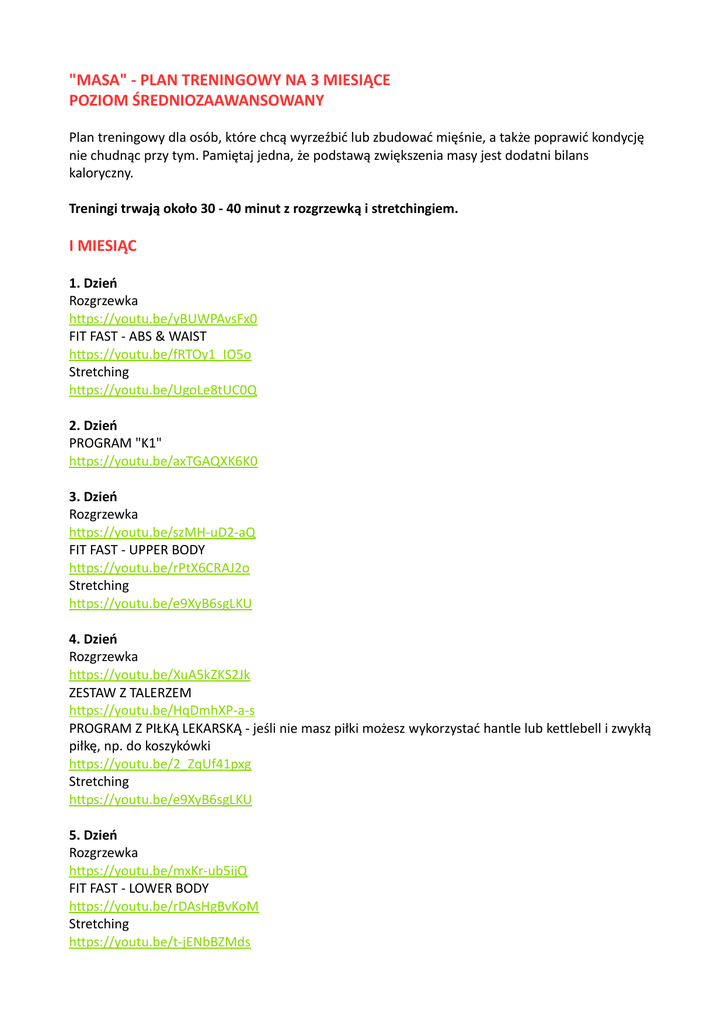 "MASA" - PLAN TRENINGOWY NA 3 MIESIĄCE POZIOM ŚREDNIOZAAWANSOWANY Plan treningowy dla osób, które chcą wyrzeźbić lub zbudować mięśnie, a także poprawić kondycję nie chudnąc przy tym. Pamiętaj jedna, że podstawą zwiększenia masy jest dodatni bilans kaloryczny. Treningi trwają około 30 - 40 minut z rozgrzewką i stretchingiem. I MIESIĄC 1. Dzień Rozgrzewka https://youtu.be/yBUWPAvsFx0 FIT FAST - ABS & WAIST https://youtu.be/fRTOy1_IO5o Stretching https://youtu.be/UgoLe8tUC0Q 2. Dzień PROGRAM "K1" https://youtu.be/axTGAQXK6K0 3. Dzień Rozgrzewka https://youtu.be/szMH-uD2-aQ FIT FAST - UPPER BODY https://youtu.be/rPtX6CRAJ2o Stretching https://youtu.be/e9XyB6sgLKU 4. Dzień Rozgrzewka https://youtu.be/XuA5kZKS2Jk ZESTAW Z TALERZEM https://youtu.be/HqDmhXP-a-s PROGRAM Z PIŁKĄ LEKARSKĄ - jeśli nie masz piłki możesz wykorzystać hantle lub kettlebell i zwykłą piłkę, np. do koszykówki https://youtu.be/2_ZqUf41pxg Stretching https://youtu.be/e9XyB6sgLKU 5. Dzień Rozgrzewka https://youtu.be/mxKr-ub5ijQ FIT FAST - LOWER BODY https://youtu.be/rDAsHgBvKoM Stretching https://youtu.be/t-jENbBZMds 6. Dzień Rozgrzewka https://youtu.be/jtg76pWijG8 HIIT "DEAD OR ALIVE" https://youtu.be/dCatIjblyLA Stretching https://youtu.be/t-jENbBZMds 7. Dzień WOLNE II MIESIĄC 1. Dzień Rozgrzewka https://youtu.be/yBUWPAvsFx0 HIIT "ABS STYLE" https://youtu.be/OHMBFhcSq-s Stretching https://youtu.be/UgoLe8tUC0Q 2. Dzień Rozgrzewka https://youtu.be/XuA5kZKS2Jk PROGRAM "PERFECT BUTT" https://youtu.be/Pvf4zxY9WCU Stretching https://youtu.be/e9XyB6sgLKU 3. Dzień Rozgrzewka https://youtu.be/mxKr-ub5ijQ HIIT "BAND WORK" https://youtu.be/jZl_tOeP71k PROGRAM "T - ARMS" - z hantlami, taśmą lub butelkami z wodą https://youtu.be/p7ImcQCgJt4 Stretching https://youtu.be/t-jENbBZMds 4. Dzień Rozgrzewka https://youtu.be/jSXQ1OuIIaQ HIIT "PLANK CHALLENGE" https://youtu.be/4SZxG0g_6qA Stretching https://youtu.be/UgoLe8tUC0Q 5. Dzień Rozgrzewka https://youtu.be/jtg76pWijG8 PROGRAM "T - ARMS" - z hantlami, taśmą lub butelkami z wodą https://youtu.be/p7ImcQCgJt4 WEWNĘTRZNA STRONA UD https://youtu.be/dOwT1OsLpD8 Stretching https://youtu.be/t-jENbBZMds 6. Dzień Rozgrzewka https://youtu.be/szMH-uD2-aQ HIIT "SIŁA" https://youtu.be/Fjg_katqi3o Stretching https://youtu.be/t-jENbBZMds 7. Dzień WOLNE III MIESIAC Przejdź do planu "MASA" - POZIOM ZAAWANSOWANY http://dds.fit/masa-plan-na-3-miesiace-poziom-zaawansowany/ Przeczytaj koniecznie: 10 TRENINGOWYCH ZASAD DLA DOBREGO SAMOPOCZUCIA: - Trenuj w butach sportowych - Nie dokładaj nic do planu, jest on kompletny - Zawsze ćwicz swoim tempem, nie moim - Najważniejsza podczas treningu jest technika, to dzięki niej nie ulegniesz kontuzji i osiągniesz upragnione efekty - Programy nie są łatwe i takie mają być. To trudne zestawy dla osób o poziomie średniozaawansowanym. NIE MUSISZ ich zrobić w 100%, ale masz dać z siebie 100%. Wykonanie połowy treningu to już ogromny sukces - Dieta stanowi 70% sukcesu - Do treningu przystąp po konsultacji ze swoim lekarzem - Jeśli źle się czujesz przerwij trening - Nie narażaj się na maksymalne zmęczenie, odpoczynek też jest elementem treningu - Dla kobiet: w trakcie cyklu menstruacyjnego wysiłek nie jest wskazany, unikaj też ćwiczeń na mięśnie brzucha i okolicę miednicy MIŁEGO TRENINGU!