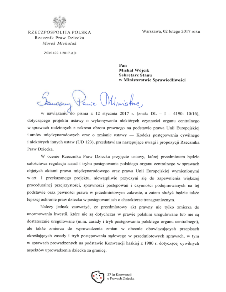 %ff ąí:ł.'},' Warszawa,02 lutego 20l7 ľoku RZECZPOSPOLITA POLSKA Rzecznik Praw Dziecka Marek Michalak ZsM.422.1 .201 7.AD Pan Michał Wójcik Sekretarz Stanu w Ministerstwie Spľawĺedliwości 0,Ĺ'^'"!- e) ą^^*'Ł w pisma nawrąZaruu dotyczącego projektu ustawy w sprawach rodzinnych z o z 12 stycznia 2017 r. (znak: DL - I- 10/16), wykonywaniu niektóľych czynnościoľganu centľalnego zakresu obrotu prawnego na podstawie prawa i umów międzynarodowych otaz 4190- o zmianie ustawy - Unii Euľopejskiej Kodeks postępowania cywilnego i niektórych innych ustaw (UD 123)' pľzedstawiam następujące uwagi i propozycji Rzecznika Praw Dziecka. W ocenie Rzecznika Praw Dziecka przyjęcie ustawy, któľej przedmiotem będzie całościowaľegulacja zasad i trybu postępowania polskiego oľganu centľalnego w spľawach Unii Europejskiej wymienionymi w art' I przekazanego pľojektu, niewątpliwie przyczyni się do zapewnienia większej objętych aktami prawa międzynarodowego oÍaz pra:wa proceduralnej przejrzystości, sprawnościpostępowan i czynności podejmowanych na tej podstawie oraz pewnościpľawa w przedmiotowym zakĺesie, a zatęm słuŻyć,będzie takŻe lepszej ochľonię praw dziecka w postępowaniach o charakterze transgľanicznym. Nalezy jednak zauwaŻyć,, Że pľzedmiotowy akt prawny nie tylko zmierza do unorľnowania kwestii' któľe nie są dotychczas w pľawie polskim uľegulowane lub nie są dostatecznie uregulowane (m.in. zasady i tryb postępowania polskiego organu centralnego), do wpľowadzenia zmian w obecnie obowiązujących przepisach okĺeślającychzasady i tryb postępowania sądowego w przedmiotowych spľawach, w tym ale takŻe zmierza w sprawach pľowadzonych na podstawie Konwencji haskiej z 1980 r. dotyczącej cywilnych aspektów uprowadzenia dziecka za granicę. at a a 27 lat Konwencji o Prawach Dziecka W tym zakľesie, w ocenie Rzecznika Pľaw Dziecka, ľozpoczynĄące się prace legislacyjne dają mozliwośćponownego przeanalizowania obecnie obowiązujących regulacji dotyczących postępowan toczących się w oparciu o przepisy Konwencji haskiej z l98O r. iRozporządzenia Rady (WE) nr 220112003 oraz wypracowaniarozwiązań, któľe przyczynią się do najpełniejszej realizacji zasady dobľa dziecka na gruncie tych postępowań. Jeślichodzi o przepisy regulujące tryb działania Ministra Spľawiedliwościjako oľganu centľalnego Wznaczonego celem wykonywania zadan okĺeślonychw aktach prawnych wymienionych w aľt. 1 projektowanej ustawy, Rzecznik Pruuĺ Dzięcka wskazuje na potrzebę zabezpieczenia realizacji pľaw dziecka poprzez sprawnośćpostępowania, ale takŻe poprzez wprowadzenie przejrzystych regulacji pozwalających stľonom postępowania na precyzyjne ustalenie pľzysługującychim uprawnień oraz zavłierających odpowiednie gwarancje tych pľaw. W tym zakľesie odnieśćsię należy do pľoponowanego brzmienia projektowanego aľt. 4 ust. 2 ustawy, zgodnie z ktőrym,,wniosek może być, złoŻony przez zagraniczne oľgany centralne lub podmioty okľeślonew przepisach (. ..), zwane dalej ,,wnioskodawcą", a takŻe przez Ministra Sprawiedliwości''. W ocenie Rzeczn|ka - celem usunięcia ewentualnych wątpliwoŚci co do zakľesu, w jakim w pľzedmiotowych sprawach może działać, Minister Spľawiedliwościzasadnym byłoby doprecyzowanie powyższego pľzepisu popÍzez odniesienie przedmiotowej kompetencji Ministra Sprawiedliwości do pełnionej przez Ministra roli organu centľalnego zgodnie z art. 3 projektowanej ustawy, np. poprzez wskazanie, że wniosek, o którym mowa w art.4 ust. 2 moŻe być, złoŻony pÍzez Ministľa Sprawiedliwości ,,działającego jako oľgan centľalny zgodnie z art' 3 ustawy''. Jeślichodzi o przepisy pľojektowanego aľt. 5 ust' 2-5 ustawy regulujące tryb postępowania Ministra Sprawiedliwości w razie stwieľdzenia bľaków formalnych wniosku, na|eży zauwaŻyć,, że - zgodnie zuzasadnieniem projektowanego akfu - skierowanie wezwania do uzupełnienia braków formalnych bezpośrednio do wnioskodawcy nawet w sýuacji, gdy wniosęk został złoŻony za pośľednictwemzagranicznego organu centralnego (projektowany art. 5 ust. 3), słuŻyć'ma wyeliminowaniu sytuacji gdy organy te odmawiały doręczania wezwania albo doľęczając je nie podawały daty doľęczenia. Zdanięm Rzecznika, wobec povĺyŻszego w treściust. 4, w którym mowa o nienadaniu biegu wnioskowi, gdy nie uzupełniono braków formalnych w terminie, naleŻałoby precyzyjnie wskazać podmioty, które Minister Spľawiedliwości informuje, czyli wnioskodawcę i zagraniczny organ centralny, jeŻeli za jego pośrednictwem złoŻono wniosek. Zdaniem Rzecznika jednoznaczne 2 zobowiązanie Ministľa Sprawiedliwoścido pľzekazania informacji o nienadaniu biegu wnioskowi ľównież zagľanicznemu oľganowi centralnemu (gdy wniosek był złoŻony za jego pośrednictwem), słuzyć, będzie zabezpieczeniu pľaw dziecka często podjęcia pilnych Konwencji haskiej z i w sytuacjach wymagających niezwłocznych działan a takŻe będzie zgodne z regulacją art.27 1980 r. (któľą uzupełnia pľojektowany art. 25 ustawy). Na maľginesie powyŻszych uwag naleŻy wskazać, Że w treściprojektowanego ust. 2 uŻyto omyłkowo sformułowania,'wskutek niezachowania braków formalnych''. Jeżeli chodzi o projektowany art. 25 ust. 1 ustawy, istotnym jest, aby odnieśćtľeść tego przepisu do art. 27 Konwencji haskiej z 1980 roku. Zgodnie z postanowieniami tego przepisu, oľgan centľalny nie jest zobowiązany do przyjęcia wniosku, jeŻelijest oczywiste, że warunki okľeśloneprzez Konwencję nie zostały spełnione lub wniosek nie jest wystaľczająco umotywowany. W związku z powyŻszym, wpľowadzenie w pľojektowanyn pľzepisie regulacji wskazującej, Że ,,w ruzie wątpliwości'' Ministeľ Spľawiedliwości moŻe wezwać wnioskodawcę do złożeniaokľeślonychdokumentów lub oświadczeń lub do uzasadnienia wniosku, a - złoŻenia gdy wniosek nie zostanie w taki