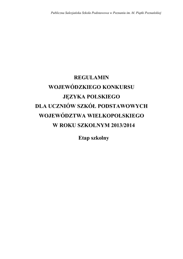 Publiczna Salezjańska Szkoła Podstawowa w Poznaniu im. bł. Piątki Poznańskiej REGULAMIN WOJEWÓDZKIEGO KONKURSU JĘZYKA POLSKIEGO DLA UCZNIÓW SZKÓŁ PODSTAWOWYCH WOJEWÓDZTWA WIELKOPOLSKIEGO W ROKU SZKOLNYM 2013/2014 Etap szkolny Publiczna Salezjańska Szkoła Podstawowa w Poznaniu im. bł. Piątki Poznańskiej ___________________________________________________________________________ Dział I Rozdział 1 INFORMACJE OGÓLNE §1. §2. §3. §4. §5. §6. §7. §8. Organizatorem konkursu jest Wielkopolski Kurator Oświaty. 1. Konkurs składa się z 3 etapów: 1) szkolnego, 2) rejonowego, 3) wojewódzkiego. Merytorycznie konkurs obejmuje wiedzę i umiejętności z języka polskiego zawarte w podstawie programowej kształcenia ogólnego w szkole podstawowej (Rozporządzenie Ministra Edukacji Narodowej z dnia 27 sierpnia 2012 r. – Dz. U. z 2012, poz. 977) poszerzone o zagadnienia szczegółowe omówione w § 47 niniejszego regulaminu. Na etapie szkolnym i rejonowym konkursu uczniowie rozwiązują test, który składa się z różnych typów zadań otwartych i zamkniętych. Udzielają odpowiedzi, wykorzystując swoje doświadczenia czytelnicze wynikające m.in. z przeczytanych lektur konkursowych. Na każdym etapie konkursu samodzielnie redagują dłuższą wypowiedź pisemną. Udział uczniów w eliminacjach konkursowych jest dobrowolny. Uczeń przystępujący do poszczególnych etapów konkursu zobowiązany jest do posiadania ważnej legitymacji szkolnej. Podczas trwania konkursu uczeń pracuje samodzielnie, zachowuje spokój i nie zakłóca w żaden inny sposób przebiegu konkursu (nie opuszcza wyznaczonego mu w sali miejsca, nie porozumiewa się z innymi uczestnikami, nie wypowiada uwag i komentarzy, nie zadaje pytań dotyczących zadań konkursowych, nie korzysta z żadnych niedozwolonych materiałów i środków łączności, w tym telefonów komórkowych). W szczególnych przypadkach uczeń może opuścić salę, w której rozwiązuje test konkursowy, w każdym czasie po poinformowaniu o swoim zamiarze komisji konkursowej i oddaniu pracy konkursowej przewodniczącemu komisji. Wydarzenie to zostaje odnotowane w protokole przeprowadzenia konkursu. §9. Uczestnik konkursu, który ukończył pracę przed wyznaczonym czasem, opuszcza salę za zgodą przewodniczącego komisji. §10. W przypadku stwierdzenia przez komisję naruszenia przez ucznia zasad regulaminu konkursu Przewodniczący Komisji Konkursowej przerywa jego pracę i nakazuje opuszczenie sali, co odnotowuje w protokole przeprowadzenia konkursu. Nie przewiduje się dodatkowego postępowania konkursowego dla uczestników, którzy w wyznaczonym terminie nie przystąpią do danego etapu konkursu. Za zapewnienie opieki i bezpieczeństwa uczniom/uczestnikom etapu szkolnego, rejonowego i wojewódzkiego odpowiada dyrektor szkoły, do której uczęszcza uczeń (w drodze na konkurs, w czasie jego trwania i w drodze powrotnej do szkoły). W pracach komisji etapu szkolnego, rejonowego i wojewódzkiego mogą uczestniczyć w charakterze obserwatorów wizytatorzy Kuratorium Oświaty w Poznaniu. Dokumentacja związana z przebiegiem poszczególnych etapów konkursów, po ich zakończeniu jest porządkowana, zabezpieczana i przechowywania przez 5 lat w szkole - miejscu przeprowadzenia danego etapu. Wielkopolski Kurator Oświaty wydaje laureatom i finalistom zaświadczenia zgodnie z § 5 ust. 1 rozporządzenia Ministra Edukacji Narodowej i Sportu z dnia 29 stycznia §11. §12. §13. §14. §15. 2 Publiczna Salezjańska Szkoła Podstawowa w Poznaniu im. bł. Piątki Poznańskiej ___________________________________________________________________________ 2002 r. w sprawie organizacji oraz sposobu przeprowadzania konkursów, turniejów i olimpiad (Dz. U. z 2002 r. Nr 13, poz. 125, z późn. zm.). §16. Wszelkie informacje na temat konkursów przedmiotowych organizowanych na terenie województwa wielkopolskiego, w szczególności zarządzenia Wielkopolskiego Kuratora Oświaty w sprawach konkursów, miejsca przeprowadzania etapu rejonowego i wojewódzkiego oraz wyniki etapu wojewódzkiego będą przekazywane zainteresowanym poprzez publikowanie ich na stronie internetowej Kuratorium Oświaty w Poznaniu w zakładce Konkursy. Rozdział 2 ETAP SZKOLNY §17. §18. §19. §20. §21. §22. Etap szkolny odbędzie się w 22 listopada 2013 r. (piątek) o godz. 1300 w szkołach, które zgłosiły do Kuratorium Oświaty w Poznaniu zamiar uczestnictwa w Konkursie do 4 października 2013r. poprzez wypełnienie formularza on-line. Za organizację i przeprowadzenie etapu szkolnego każdego z konkursów odpowiada dyrektor szkoły oraz powołana przez niego Szkolna Komisja Konkursowa, w której skład wchodzą przewodniczący i co najmniej dwóch nauczycieli, w tym przynajmniej jeden o specjalności zgodnej z przedmiotem konkursu. Szkolna Komisja Konkursowa wykorzystuje testy przygotowane przez osobę wyznaczoną przez Wielkopolskiego Kuratora Oświaty. Czas przeznaczony na rozwiązanie zadań wynosi 60 minut. Do etapu rejonowego konkursu kwalifikuje się uczeń, który na etapie szkolnym otrzymał minimum 30 na 40 możliwych punktów. 1. Do zadań dyrektora szkoły należy: 1) zapoznanie uczniów, rodziców i nauczycieli z Regulaminem Wojewódzkiego Konkursu Języka Polskiego dla uczniów szkół podstawowych województwa wielkopolskiego w roku szkolnym 2013/14, 2) zgłoszenie szkoły do udziału w konkursie, nie później niż do 4 października 2013r. poprzez wypełnienie formularza on-line. Adres dostępu do formularza zostanie wysłany na adresy e-mailowe szkół podstawowych województwa wielkopolskiego (podanych w SIO), na 7 dni wcześniej, tj. 27 września 2013r. 3) uzyskanie oświadczeń rodziców o akceptacji Regulaminu Wojewódzkiego Konkursu Języka Polskiego dla uczniów szkół podstawowych województwa wielkopolskiego w roku szkolnym 2013/2014 i wyrażeniu zgody na publikowanie danych osobowych dziecka (uczestnika konkursu) oraz jego wyników na 