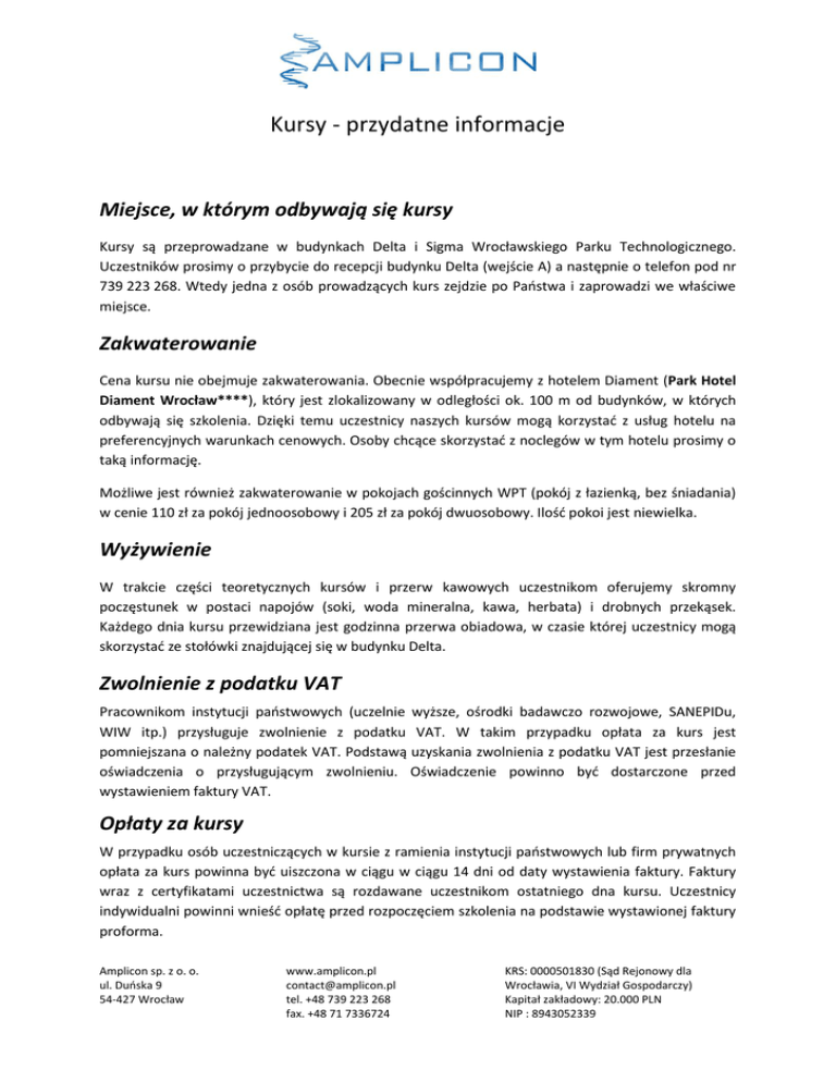 Kursy - przydatne informacje Miejsce, w którym odbywają się kursy Kursy są przeprowadzane w budynkach Delta i Sigma Wrocławskiego Parku Technologicznego. Uczestników prosimy o przybycie do recepcji budynku Delta (wejście A) a następnie o telefon pod nr 739 223 268. Wtedy jedna z osób prowadzących kurs zejdzie po Państwa i zaprowadzi we właściwe miejsce. Zakwaterowanie Cena kursu nie obejmuje zakwaterowania. Obecnie współpracujemy z hotelem Diament (Park Hotel Diament Wrocław****), który jest zlokalizowany w odległości ok. 100 m od budynków, w których odbywają się szkolenia. Dzięki temu uczestnicy naszych kursów mogą korzystać z usług hotelu na preferencyjnych warunkach cenowych. Osoby chcące skorzystać z noclegów w tym hotelu prosimy o taką informację. Możliwe jest również zakwaterowanie w pokojach gościnnych WPT (pokój z łazienką, bez śniadania) w cenie 110 zł za pokój jednoosobowy i 205 zł za pokój dwuosobowy. Ilość pokoi jest niewielka. Wyżywienie W trakcie części teoretycznych kursów i przerw kawowych uczestnikom oferujemy skromny poczęstunek w postaci napojów (soki, woda mineralna, kawa, herbata) i drobnych przekąsek. Każdego dnia kursu przewidziana jest godzinna przerwa obiadowa, w czasie której uczestnicy mogą skorzystać ze stołówki znajdującej się w budynku Delta. Zwolnienie z podatku VAT Pracownikom instytucji państwowych (uczelnie wyższe, ośrodki badawczo rozwojowe, SANEPIDu, WIW itp.) przysługuje zwolnienie z podatku VAT. W takim przypadku opłata za kurs jest pomniejszana o należny podatek VAT. Podstawą uzyskania zwolnienia z podatku VAT jest przesłanie oświadczenia o przysługującym zwolnieniu. Oświadczenie powinno być dostarczone przed wystawieniem faktury VAT. Opłaty za kursy W przypadku osób uczestniczących w kursie z ramienia instytucji państwowych lub firm prywatnych opłata za kurs powinna być uiszczona w ciągu w ciągu 14 dni od daty wystawienia faktury. Faktury wraz z certyfikatami uczestnictwa są rozdawane uczestnikom ostatniego dna kursu. Uczestnicy indywidualni powinni wnieść opłatę przed rozpoczęciem szkolenia na podstawie wystawionej faktury proforma. Amplicon sp. z o. o. ul. Duńska 9 54-427 Wrocław www.amplicon.pl [email protected] tel. +48 739 223 268 fax. +48 71 7336724 KRS: 0000501830 (Sąd Rejonowy dla Wrocławia, VI Wydział Gospodarczy) Kapitał zakładowy: 20.000 PLN NIP : 8943052339 Dojazd do Wrocławskiego Parku Technologicznego Z Dworca Głównego PKP do WPT można dojechać: pociągiem – należy wysiąść na stacji Wrocław-Muchobór (jeden przystanek od Dworca Głównego w kierunku Legnicy, Węglińca lub Zgorzelca) komunikacją miejską trasa 1: Na Dworcu Głównym PKP wsiadamy w tramwaj nr 32 jadący w kierunku ZAJEZDNIA BOREK. Wysiadamy na przystanku HALLERA i przesiadamy się do autobusu nr 132 jadącego w kierunku KOZANÓW. Wysiadamy na przystanku SZKOCKA. trasa 2: Na Dworcu Głównym PKP wsiadamy w tramwaj nr 31 jadący w kierunku STADION MIEJSKI. Wysiadamy na przystanku KWISKA i przesiadamy się w autobus nr 133 jadący w kierunku AUCHAN. Wysiadamy na przystanku SZKOCKA. Amplicon sp. z o. o. ul. Duńska 9 54-427 Wrocław www.amplicon.pl [email protected] tel. +48 739 223 268 fax. +48 71 7336724 KRS: 0000501830 (Sąd Rejonowy dla Wrocławia, VI Wydział Gospodarczy) Kapitał zakładowy: 20.000 PLN NIP : 8943052339