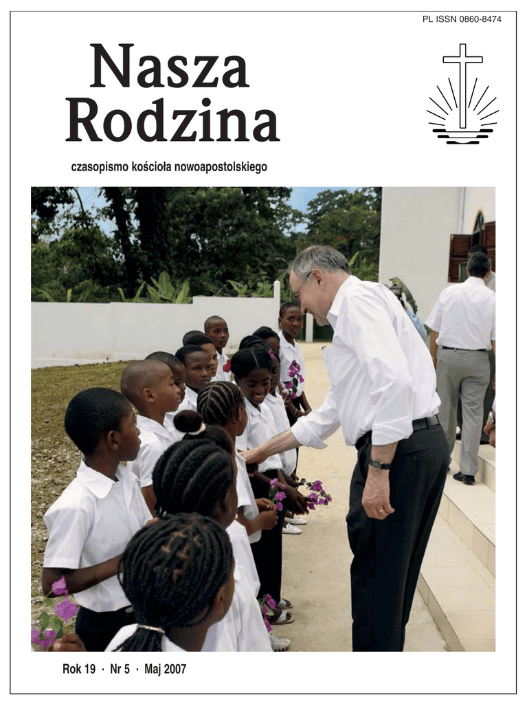 PL ISSN 0860-8474 Nasza Rodzina czasopismo kościoła nowoapostolskiego Rok 19 . Nr 5 . Maj 2007 S ¸ O W O W S T ¢ P N E Mili Bracia i Siostry, niniejszym listem chcia∏bym przedstawiç Wam kilka myÊli na temat urz´du apostolskiego. Wcià˝ na nowo wyst´pujà sytuacje, gdzie w rozmowach na tematy wiary i KoÊcio∏a Nowoapostolskiego niezb´dne sà wyjaÊnienia dotyczàce urz´du apostolskiego. Niechby niniejszy przekaz by∏ pomocny w takich sytuacjach. Urząd apostolski rzàd apostolski jest centralnym urz´dem w KoÊciele Jezusa Chrystusa. My, nowoapostolscy chrzeÊcijanie wierzymy, ˝e jest niezb´dnym i sta∏ym postanowieniem Bo˝ym. W Nowym Testamencie dominujàca pozycja aposto∏ów podkreÊlona jest te˝ relacjami o uzdrowieniach, a nawet wskrzeszeniach z martwych dokonanych przez Boga. Z jednej strony budzi si´ pytanie, dlaczego Bóg wówczas dokonywa∏ takich cudów przez aposto∏ów, a z drugiej, w jakiej relacji wzajemnej sà aposto∏owie KoÊcio∏a pierwotnego i czasu koƒcowego. Odpowiedê na pytanie dotyczàce uzdrowieƒ i wskrzeszeƒ mo˝e byç udzielona tylko w powiàzaniu historycznym. Ju˝ Jezus Chrystus umar∏ych przywraca∏ do ˝ycia, a tym samym pokazywa∏, ˝e jako Syn Bo˝y ma równie˝ moc nad Êmiercià. Jezus Chrystus jest zwyci´zcà nad Êmiercià. To dobre, radosne i pe∏ne nadziei poselstwo wymaga∏o rozszerzenia, a tak˝e rzeczà niezb´dnà by∏o zachowanie ˝ywej wiary. W tym celu te˝ przez pierwszych aposto∏ów w sporadycznych przypadkach dzia∏y si´ wskrzeszenia. Cuda uzdrowienia i wskrzeszenia nie by∏y celem samym w sobie, lecz znakiem zbawienia danym w czasach, w których ludzie prawie bezradnie nara˝eni byli na wszelkie mo˝liwe choroby. Wspó∏czesna sytuacja, w której dzia∏ajà aposto∏owie, zdecydowanie jest odmienna od tej, w jakiej dzia∏ali pierwsi aposto∏owie. Ewangelia zosta∏a rozszerzona na ca∏y Êwiat i nie musi ju˝ byç potwierdzana przez nadmienione cuda. W wieku medycyny wskrzeszenia i uzdrowienia nie s∏u˝y∏yby jako poÊwiadczenia mocy Syna Bo˝ego nad Êmiercià lub pe∏nomocnictwa aposto∏ów, ale odbierane by∏yby jako sensacyjne wydarzenia, które wnet posz∏yby w zapomnienie. Aposto∏owie czasu koƒcowego majà za zadanie zgromadzaç zbór Paƒski na Jego ponowne przyjÊcie. To jest legitymacja dzisiejszych aposto∏ów. Nie tylko zwiastujà Êmierç i zmartwychwstanie Jezusa Chrystusa, ale te˝ intensywnie przygotowujà wiernych na Jego ponowne przyjÊcie. Choç dziÊ równie˝ wyst´pujà przypadki cudownych czynów jako znaki, które towarzyszà dzia∏alnoÊci urz´du apostolskiego, to jednak tak bardzo nie sà te cuda uwypuklane; raczej pozostajà w skryciu. Widzimy zatem, ˝e mi´dzy aposto∏ami pierwotnego KoÊcio∏a, a aposto∏ami czasu koƒcowego istnieje ró˝nica zadaƒ. Wszyscy jednak sà pos∏aƒcami Jezusa Chrystusa. Wszyscy majà pe∏nomocnictwo do zwiastowania odpuszczenia grzechów, chrzczenia Duchem Âwi´tym i rozszerzania ewangelii na ca∏y Êwiat. Pod tym wzgl´dem nie ma wi´c ró˝nic mi´dzy pierwotnymi a wspó∏czesnymi aposto∏ami. Wasz U 2 N A B O ˚ E ¡ S T W O „Boca de Inferno” (Usta piekieł) Liczni niewolnicy skacząc z tych skał odbierali sobie życie, aby uniknąć pełnej męki drogi do Ameryki Grupa folklorystyczna zaskoczyła gości W trakcie swojej wizyty na Wyspach Âwi´tego Tomasza i Ksià˝´cej, w dniach 27 i 28 stycznia 2007 roku, G∏ówny Aposto∏ ustanowi∏ pierwszego rodzimego aposto∏a w tym kraju. Zosta∏ nim dotychczasowy biskup Massamba Diambu Tuku (50 l.) Ponadto starszy okr´gowy Jonas da Graça Cunha (61 l.) dostàpi∏ urz´du biskupa. G∏ówny Aposto∏ w São Tomé - Wyspa Âw. Tomasza Wyspy Âwi´tego Tomasza i Ksià˝´ca le˝à u zachodniego wybrze˝a Afryki i przez wieki s∏u˝y∏y jako punkt prze∏adunkowy niewolników. W sobot´, o godz. 5.40 rano w São Tomé, przy tropikalnej temperaturze i wysokiej wilgotnoÊci powietrza, wylàdowa∏ samolot z G∏ównym Aposto∏em i towarzyszàcymi mu osobami. Zaraz po wyjÊciu z samolotu G∏ówny Aposto∏ zosta∏ otoczony przez reporterów rodzimej stacji telewizyjnej i poproszony o wywiad. W dalszej cz´Êci dnia goÊcie zwiedzili niedawno wyÊwi´cony koÊció∏ w Monte Café. Tu˝ przed po˝egnaniem, na dziedziniec koÊcio∏a wbieg∏a zamaskowana grupa ludzi z w∏asnor´cznie wykonanymi instrumentami i b´benkami, muzykujàc i dziko taƒczàc. Jak si´ okaza∏o, by∏a to nieplanowana ceremonia powitalna sàsiedztwa. Po po∏udniu G∏ówny Aposto∏ s∏u˝y∏ oko∏o 700 s∏ugom Bo˝ym i ich ˝onom w Pantufo. S∏udzy ci obs∏ugujà 145 zbo3 rów, liczàcych oko∏o 20 000 wiernych. Przy niezmiennej, wysokiej temperaturze G∏ówny Aposto∏, w niedziel´ rano 28 stycznia br., przeprowadzi∏ nabo˝eƒstwo z udzia∏em oko∏o 2000 braci i sióstr w Santanie. Nabo˝eƒstwo to by∏o nagrywane i emitowane przez telewizj´ na ca∏y kraj. Na wyspie zasadniczo nie funkcjonuje komunikacja publiczna, stàd te˝ bracia i siostry wynaj´li wszystkie dost´pne ci´˝arówki, aby móc przybyç na nabo˝eƒstwo. Po ustanowieniu nowego aposto∏a, G∏ówny Aposto∏ podzi´kowa∏ aposto∏owi Antóniowi de Jesus Rocha Semedo z Wysp Kanaryjskich, który dotychczas obs∏ugiwa∏ braci i siostry na Wyspach Âwi´tego Tomasza i Ksià˝´cej. Po obiedzie podró˝ samolotem wiod∏a do Libreville/Gabon. Tam, na lotnisku, honorowi goÊcie zostali radoÊnie powitani przez aposto∏a Volkera Kühnle (Niemcy Po∏udniowe) oraz chór. Podró˝ powrotna do Europy mia∏a miejsce w poniedzia∏ek rano. N A B O ˚ E ¡ S T W O „A przeto i my dziękujemy Bogu nieustannie, że przyjęliście Słowo Boże, które od nas słyszeliście nie jako słowo ludzkie, ale, jak jest prawdziwie, jako Słowo Boże, które też w was wierzących skutecznie działa”. – 1. Tesaloniczan 2, 13 – oi serdecznie umi∏owani bracia i siostry, z wielkà radoÊcià przyby∏em do wa