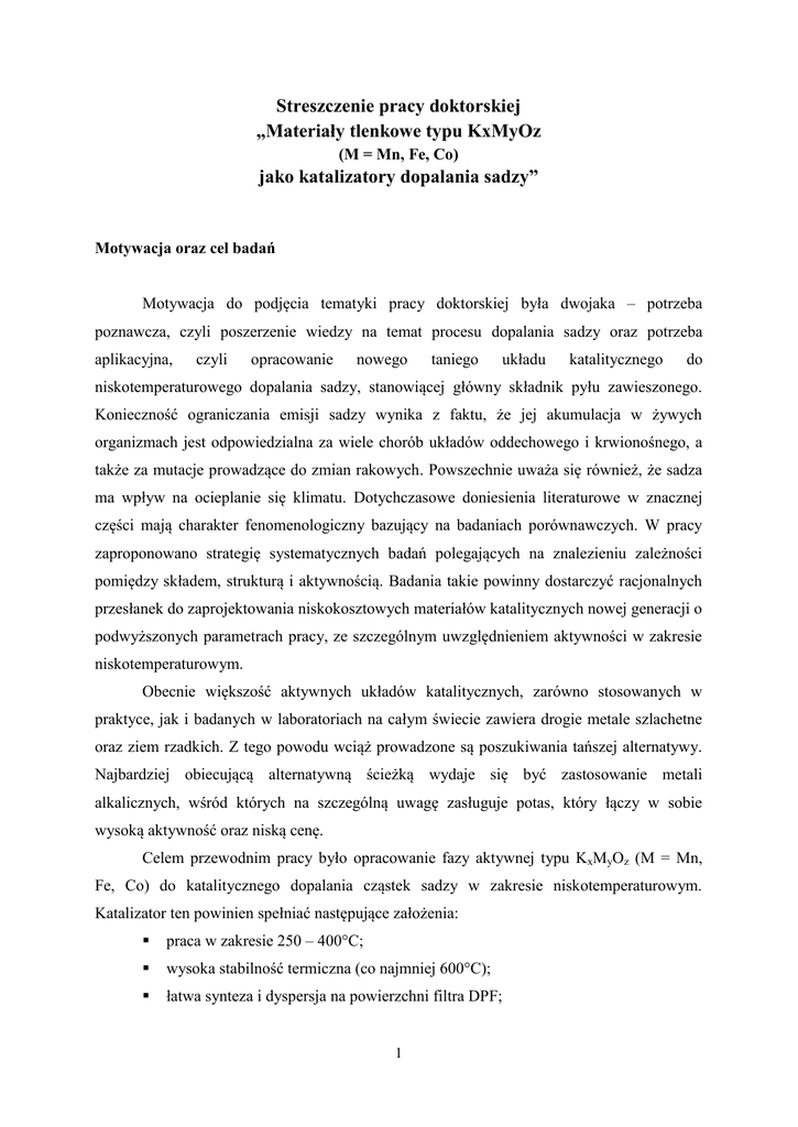 Streszczenie pracy doktorskiej „Materiały tlenkowe typu KxMyOz (M = Mn, Fe, Co) jako katalizatory dopalania sadzy” Motywacja oraz cel badań Motywacja do podjęcia tematyki pracy doktorskiej była dwojaka – potrzeba poznawcza, czyli poszerzenie wiedzy na temat procesu dopalania sadzy oraz potrzeba aplikacyjna, czyli opracowanie nowego taniego układu katalitycznego do niskotemperaturowego dopalania sadzy, stanowiącej główny składnik pyłu zawieszonego. Konieczność ograniczania emisji sadzy wynika z faktu, że jej akumulacja w żywych organizmach jest odpowiedzialna za wiele chorób układów oddechowego i krwionośnego, a także za mutacje prowadzące do zmian rakowych. Powszechnie uważa się również, że sadza ma wpływ na ocieplanie się klimatu. Dotychczasowe doniesienia literaturowe w znacznej części mają charakter fenomenologiczny bazujący na badaniach porównawczych. W pracy zaproponowano strategię systematycznych badań polegających na znalezieniu zależności pomiędzy składem, strukturą i aktywnością. Badania takie powinny dostarczyć racjonalnych przesłanek do zaprojektowania niskokosztowych materiałów katalitycznych nowej generacji o podwyższonych parametrach pracy, ze szczególnym uwzględnieniem aktywności w zakresie niskotemperaturowym. Obecnie większość aktywnych układów katalitycznych, zarówno stosowanych w praktyce, jak i badanych w laboratoriach na całym świecie zawiera drogie metale szlachetne oraz ziem rzadkich. Z tego powodu wciąż prowadzone są poszukiwania tańszej alternatywy. Najbardziej obiecującą alternatywną ścieżką wydaje się być zastosowanie metali alkalicznych, wśród których na szczególną uwagę zasługuje potas, który łączy w sobie wysoką aktywność oraz niską cenę. Celem przewodnim pracy było opracowanie fazy aktywnej typu KxMyOz (M = Mn, Fe, Co) do katalitycznego dopalania cząstek sadzy w zakresie niskotemperaturowym. Katalizator ten powinien spełniać następujące założenia: praca w zakresie 250 – 400°C; wysoka stabilność termiczna (co najmniej 600°C); łatwa synteza i dyspersja na powierzchni filtra DPF; 1 tanie i łatwo dostępne substraty; ekologiczny (eko-materiały, recykling). Cel główny podzielono na następujące zadania badawcze: zbadanie właściwości i podatności na utlenianie szeregu sadz modelowych; zbadanie wpływu modelowych katalizatorów na spalanie sadz modelowych; wyselekcjonowanie układów wyjściowych do dalszej optymalizacji; promocja powierzchniowa i strukturalna potasem układów wyjściowych; charakterystyka powierzchniowa i strukturalna katalizatorów promowanych potasem; zbadanie korelacji: skład – struktura – właściwości elektronowe – aktywność katalityczna; wyselekcjonowanie faz aktywnych i przygotowanie układów monolitycznych; zbadanie aktywności układów monolitycznych w dopalaniu sadzy rzeczywistej. Metodologia opracowania układu do katalitycznego dopalania sadzy W ramach niniejszej pracy zastosowano trójetapową strategię postępowania, polegającą na zastosowaniu trójetapowej strategii projektowania docelowego układu katalitycznego. Pierwszy etap stanowią badania modelowych materiałów węglowych i ich podatności na katalityczne spalanie na powierzchni układów modelowych. Sadze modelowe (koronen, węgiel grafityczny, Printex 80, Printex 85, Printex U, Vulcan XC-72) zostały scharakteryzowane strukturalnie (XRD, RS) i powierzchniowo (XPS, N2-BET, WF), a następnie zbadano ich podatność na spalanie (TPO-QMS, TGA/DTA). Dzięki sprzężeniu wyników uzyskanych za pomocą modelowania kwantochemicznego z wynikami eksperymentalnymi (SIMS, XPS) wykazano, że najważniejszym etapem w dopalaniu sadzy jest jego inicjacja. Wykazano również, że podatność sadz modelowych na spalanie nie zależy wprost od ich powierzchni właściwej, za to zależy od ich składu. Spalanie modelowych materiałów węglowych na katalizatorach modelowych (Fe2O3, CeO2, K2CO3) pozwoliło stwierdzić, że przesunięcie okna temperaturowego względem procesu niekatalitycznego zależy od rodzaju użytego katalizatora, wybranego typu kontaktu oraz sadzy modelowej. Sekwencja przesunięć okna temperaturowego spalania różnych sadz jest w dobrym przybliżeniu stała, niezależnie od zastosowanego katalizatora. Obserwacja ta pozwala na wybór jednej reprezentatywnej sadzy modelowej do dalszych badań: Printex 80. Wyniki tych 2 badań wstępnych dostarczyły przesłanek do postawienia hipotez badawczych i zaplanowania badań nad promocją potasem tlenków metali przejściowych. Drugi etap stanowi rozwinięcie tematyki promocyjnej, przy czym szczególną uwagę zwrócono na lokalizację promotora potasowego względem matrycy tlenkowej (Mn3O4, Fe3O4, Co3O4). Zbadano (XRD, RS, N2-BET, SEM/TEM, IR, WF, SR-TAD, TPO-QMS, TGA/DTA) szereg układów, w których sole potasu znajdowały się na powierzchni fazy aktywnej (promocja powierzchniowa) oraz tworzyły nowe fazy nanostrukturyzowanych tlenków mieszanych (promocja strukturalna) – KMn4O8, KMn8O16, KFeO2, K2Fe22O34, KCo4O8. W fazach tych jony potasu zajmowały pozycję w tunelach i płaszczyznach przewodnictwa. Badania na tym etapie doprowadziły do wyselekcjonowania najlepszych faz (KMn4O8, KMn8O16, KFeO2, K2Fe22O34), biorąc pod uwagę kryteria założone w celu pracy (aktywność katalityczną, stabilność, łatwość syntezy, dostępność i cena substratów, a także ekologiczność materiału). Trzeci etap badań ukierunkowany był na cel praktyczny, jakim było opracowanie fazy aktywnej typu KxMyOz (M = Mn, Fe, Co) do katalitycznego dopalania cząstek sadzy w zakresie niskotemperaturowym. Obejmował on kompleksowe badania aktywności wyselekcjonowanych układów katalitycznych w różnych warunkach prowadzenia procesu. Zwieńczeniem badań było wykonanie testów na układach monolitycznych w warunkach zbliżonych do rzeczywistych (filtr SiC-CDPF ładowany sadzą rzeczywistą z układu wydechowego s