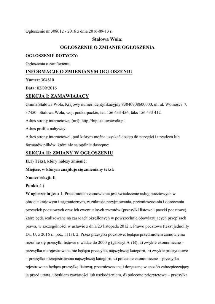 Ogłoszenie nr 308012 - 2016 z dnia 2016-09-13 r. Stalowa Wola: OGŁOSZENIE O ZMIANIE OGŁOSZENIA OGŁOSZENIE DOTYCZY: Ogłoszenia o zamówieniu INFORMACJE O ZMIENIANYM OGŁOSZENIU Numer: 304810 Data: 02/09/2016 SEKCJA I: ZAMAWIAJĄCY Gmina Stalowa Wola, Krajowy numer identyfikacyjny 83040908600000, ul. ul. Wolności 7, 37450 Stalowa Wola, woj. podkarpackie, tel. 156 433 456, faks 156 433 412. Adres strony internetowej (url): http://bip.stalowawola.pl Adres profilu nabywcy: Adres strony internetowej, pod którym można uzyskać dostęp do narzędzi i urządzeń lub formatów plików, które nie są ogólnie dostępne: SEKCJA II: ZMIANY W OGŁOSZENIU II.1) Tekst, który należy zmienić: Miejsce, w którym znajduje się zmieniany tekst: Numer sekcji: II Punkt: 4.) W ogłoszeniu jest: 1. Przedmiotem zamówienia jest świadczenie usług pocztowych w obrocie krajowym i zagranicznym, w zakresie przyjmowania, przemieszczania i doręczania przesyłek pocztowych oraz ich ewentualnych zwrotów (przesyłki listowe i paczki pocztowe), które będą realizowane na zasadach określonych w powszechnie obowiązujących przepisach prawa, w szczególności w ustawie z dnia 23 listopada 2012 r. Prawo pocztowe (tekst jednolity Dz. U. z 2016 r., poz. 1113). 2. Przez przesyłki pocztowe, będące przedmiotem zamówienia rozumie się przesyłki listowe o wadze do 2000 g (gabaryt A i B): a) zwykłe ekonomiczne – przesyłka nierejestrowana nie będąca przesyłką najszybszej kategorii, b) zwykłe priorytetowe – przesyłka nierejestrowana najszybszej kategorii, c) polecone ekonomiczne – przesyłka rejestrowana będąca przesyłką listową, przemieszczaną i doręczaną w sposób zabezpieczający ją przed utratą, ubytkiem zawartości lub uszkodzeniem, d) polecone priorytetowe – przesyłka rejestrowana najszybszej kategorii będąca przesyłką listową, przemieszczaną i doręczaną w sposób zabezpieczający ją przed utratą, ubytkiem zawartości lub uszkodzeniem, e) polecone ze zwrotnym poświadczeniem odbioru (ZPO) – przesyłka listowa przyjęta za potwierdzeniem nadania i doręczona za pokwitowaniem odbioru, f) polecone priorytetowe ze zwrotnym poświadczeniem odbioru (ZPO) – przesyłka najszybszej kategorii przyjęta za potwierdzeniem nadania i doręczona za pokwitowaniem odbioru, g) przesyłki listowe z zadeklarowaną wartością – przesyłka rejestrowana, za której utratę, ubytek zawartości lub uszkodzenie operator ponosi odpowiedzialność do wysokości wartości przesyłki podanej przez nadawcę. h) przesyłki bez adresowe i) przesyłki kurierskie z możliwością dostarczenia na drugi dzień od daty nadania Gabaryt A to przesyłka o wymiarach: Minimum – wymiary strony adresowej nie mogą być mniejsze niż 90 x140 mm, Maksimum – żaden z wymiarów nie może przekraczać wysokości 20 mm, długości 325 mm, szerokości 230 mm. Gabaryt B – to przesyłka o wymiarach: Minimum – jeśli choć jeden z wymiarów przekracza wysokość 20 mm lub długość 325 mm, szerokość 230 mm, Maksimum – suma długości, szerokości i wysokości nie może być większa niż 900 mm, przy czym największy z tych wymiarów (długość) nie może przekroczyć 600 mm. 3. Przez paczki pocztowe, będące przedmiotem zamówienia rozumie się paczki pocztowe o wadze do 10.000 g (gabaryt A i B): a) ekonomiczne – paczki rejestrowane nie będące paczkami najszybszej kategorii, b) priorytetowe – paczki rejestrowane najszybszej kategorii, c) paczki pocztowe z zadeklarowaną wartością – przesyłki rejestrowane nie będące przesyłkami najszybszej kategorii z zadeklarowaną wartością, d) ze zwrotnym poświadczeniem odbioru – paczki rejestrowane ekonomiczne i priorytetowe przyjęte za potwierdzeniem nadania i doręczone za pokwitowaniem odbioru. Gabaryt A – to przesyłka o wymiarach: Minimum – wymiary strony adresowej nie mogą być mniejsze niż 90 x 140 mm, Maksimum – żaden z wymiarów nie może przekroczyć długości 600 mm, szerokość 500 mm, wysokość 300 mm. Gabaryt B – to przesyłka o wymiarach: Minimum – jeśli choć jeden z wymiarów przekracza długość 600 mm, szerokość 500 mm, wysokość 300 mm, Maksimum – suma długości i największego obwodu mierzonego w innym kierunku niż długość nie może być większa niż 3000 mm, przy czym największy wymiar nie może przekroczyć 1500 mm 4. Nadanie przesyłek objętych przedmiotem zamówienia następować będzie w dniu ich przekazania przez Zamawiającego. W przypadku przesyłek priorytetowych przekazanych przez Zamawiającego do godz. 14.30- 15.00, ich nadanie następować będzie w tym samym dniu. Przyjęcie przesyłek do obrotu pocztowego przez Wykonawcę będzie każdorazowo dokumentowane pieczęcią, podpisem i datą w książce nadawczej (dla przesyłek rejestrowanych) oraz na zestawieniu ilościowym dla przesyłek nierejestrowanych. Wzór książki nadawczej oraz zestawienia ilościowego zostanie przedstawiony Zamawiającemu przez Wykonawcę w formie pisemnej w dniu zawarcia umowy i stanowić będzie załącznik do umowy. Wykonawca zobowiązuje się do przekazania Zamawiającemu wszelkich oznaczeń przesyłek rejestrowanych i priorytetowych. 5. Usługa będzie realizowana na rzecz Urzędu Miasta Stalowej Woli ul. Wolności 7 37 – 450 Stalowa Wola pok. 1. 6. Zamawiający zobowiązuje się do umieszczenia na przesyłce listowej i paczce nazwy odbiorcy wraz z jego adresem (podany jednocześnie w pocztowej książce nadawczej dla przesyłek rejestrowanych), określając rodzaj przesyłki (zwykła, polecona, priorytet, zadeklarowana wartość czy ze zwrotnym poświadczeniem odbioru – ZPO), umieszczania nadruku (pieczątki) określającej pełną nazwę i adres Zamawiającego na stronie adresowej każdej nadawanej przesyłki. 7. Zamawiający zobowiązuje się do nadawania przesyłek w stanie uporządkowanym tj. przekazaniu przesyłek ułożonych stroną adresową w tym samym kierunku: rejestrowanych wg. kolejno