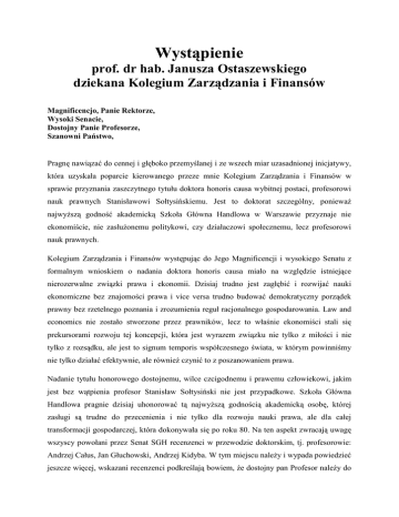 Wystąpienie prof. dr hab. Janusza Ostaszewskiego dziekana Kolegium Zarządzania i Finansów Magnificencjo, Panie Rektorze, Wysoki Senacie, Dostojny Panie Profesorze, Szanowni Państwo, Pragnę nawiązać do cennej i głęboko przemyślanej i ze wszech miar uzasadnionej inicjatywy, która uzyskała poparcie kierowanego przeze mnie Kolegium Zarządzania i Finansów w sprawie przyznania zaszczytnego tytułu doktora honoris causa wybitnej postaci, profesorowi nauk prawnych Stanisławowi Sołtysińskiemu. Jest to doktorat szczególny, ponieważ najwyższą godność akademicką Szkoła Główna Handlowa w Warszawie przyznaje nie ekonomiście, nie zasłużonemu politykowi, czy działaczowi społecznemu, lecz profesorowi nauk prawnych. Kolegium Zarządzania i Finansów występując do Jego Magnificencji i wysokiego Senatu z formalnym wnioskiem o nadania doktora honoris causa miało na względzie istniejące nierozerwalne związki prawa i ekonomii. Dzisiaj trudno jest zagłębić i rozwijać nauki ekonomiczne bez znajomości prawa i vice versa trudno budować demokratyczny porządek prawny bez rzetelnego poznania i zrozumienia reguł racjonalnego gospodarowania. Law and economics nie zostało stworzone przez prawników, lecz to właśnie ekonomiści stali się prekursorami rozwoju tej koncepcji, która jest wyrazem związku nie tylko z miłości i nie tylko z rozsądku, ale jest to signum temporis współczesnego świata, w którym powinniśmy nie tylko działać efektywnie, ale również czynić to z poszanowaniem prawa. Nadanie tytułu honorowego dostojnemu, wilce czcigodnemu i prawemu człowiekowi, jakim jest bez wątpienia profesor Stanisław Sołtysiński nie jest przypadkowe. Szkoła Główna Handlowa pragnie dzisiaj uhonorować tą najwyższą godnością akademicką osobę, której zasługi są trudne do przecenienia i nie tylko dla rozwoju nauki prawa, ale dla całej transformacji gospodarczej, która dokonywała się po roku 80. Na ten aspekt zwracają uwagę wszyscy powołani przez Senat SGH recenzenci w przewodzie doktorskim, tj. profesorowie: Andrzej Całus, Jan Głuchowski, Andrzej Kidyba. W tym miejscu należy i wypada powiedzieć jeszcze więcej, wskazani recenzenci podkreślają bowiem, że dostojny pan Profesor należy do grona jednych z najbardziej eminentnych przedstawicieli nauki prawa, która dała, między innymi, pionierski impuls dla rozwoju różnego rodzaju umów regulujących obrót gospodarczy. Na ten temat będzie miał okazję i zaszczyt wypowiedzieć się szerzej w swojej laudacji promotor pana prof. dr hab. Zygmunt Niewiadomski. Dziękując Jego Magnificencji i Senatowi SGH za poparcie inicjatywy, która uzyskała pozytywną opinię Kolegium Zarządzania i Finansów, a następnie za podjęcie przez Senat uchwały o przyznaniu panu profesorowi Stanisławowi Sołtysińskiemu doktoratu honoris causa wyrażam przekonanie i całkowitą pewność, że nasza Uczelnia nadając Profesorowi najwyższą godność akademicką jest z tego faktu dumna. Trudno bowiem byłoby sobie dzisiaj wyobrazić chociażby ochronę własności intelektualnych, ochronę praw konsumenta, uporządkowanie spraw związanych z konkurencją, wspomniany już współczesny, na miarę XXI wieku, obrót gospodarczy, funkcjonowanie spółek handlowych bez znaczącego wkładu intelektualnego Profesora, który ma ogromną intuicję i wyobraźnię prawniczą oraz niezwykłą umiejętność dostrzegania kwestii istotnych i oddzielenia ich od drugorzędnych. Pan profesor Stanisław Sołtysiński, wyróżniony tym najwyższym zaszczytem w środowisku akademickim, jest dla mnie nie tylko wzorem profesjonalisty, który jako przedstawiciel nauk prawnych jest jednym z najbardziej rozpoznawalnych polskich prawników na świecie, jest nie tylko wzorem nauczyciela – wychowawcy studentów, ale jest przede wszystkim wzorem Polaka, kierującego się dobrem państwa. Panie Profesorze, panie doktorze honoris causa Szkoły Głównej Handlowej w Warszawie jestem szczęśliwy i dumny, że mogę osobiście przedstawić pana osobę wszystkim uczestnikom naszej uroczystości. Powtarzam jeszcze raz, jest to dla mnie wielki honor i ogromna satysfakcja. W imieniu Kolegium Zarządzania i Finansów składam panu Profesorowi serdeczne gratulacje, znalazł się pan w gronie elit intelektualnych, które Szkoła Główna Handlowa w Warszawie wyróżnia nadając ten zaszczytny tytuł jako wyraz najwyższego uznania środowiska akademickiego.
