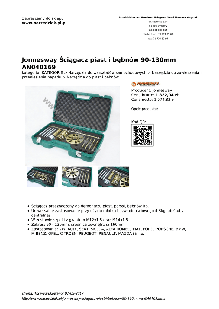 Przedsiębiorstwo Handlowo Usługowe Gaabi Sławomir Gagatek Zapraszamy do sklepu www.narzedziak.pl.pl ul. Legnicka 52A 54-204 Wrocław tel. 801 003 154 dla tel. kom.: 71 724 25 00 fax: 71 724 20 96 Jonnesway Ściągacz piast i bębnów 90-130mm AN040169 kategoria: KATEGORIE > Narzędzia do warsztatów samochodowych > Narzędzia do zawieszenia i przeniesienia napędu > Narzędzia do piast i bębnów Producent: Jonnesway Cena brutto: 1 322,04 zł Cena netto: 1 074,83 zł Opcje produktu: Kod QR: Ściągacz przeznaczony do demontażu piast, półosi, bębnów itp. Uniwersalne zastosowanie przy użyciu młotka bezwładnościowego 4,3kg lub śruby centralnej W zestawie szpilki z gwintem M12x1,5 oraz M14x1,5 Zakres: 90 - 130mm, średnica zewnętrzna 160mm Zastosowanie: VW, AUDI, SEAT, SKODA, ALFA ROMEO, FIAT, FORD, PORSCHE, BMW, M-BENZ, OPEL, CITROEN, PEUGEOT, RENAULT, MAZDA i inne. strona: 1/2 wydrukowano: 07-03-2017 http://www.narzedziak.pl/jonnesway-sciagacz-piast-i-bebnow-90-130mm-an040169.html strona: 2/2 wydrukowano: 07-03-2017 http://www.narzedziak.pl/jonnesway-sciagacz-piast-i-bebnow-90-130mm-an040169.html
