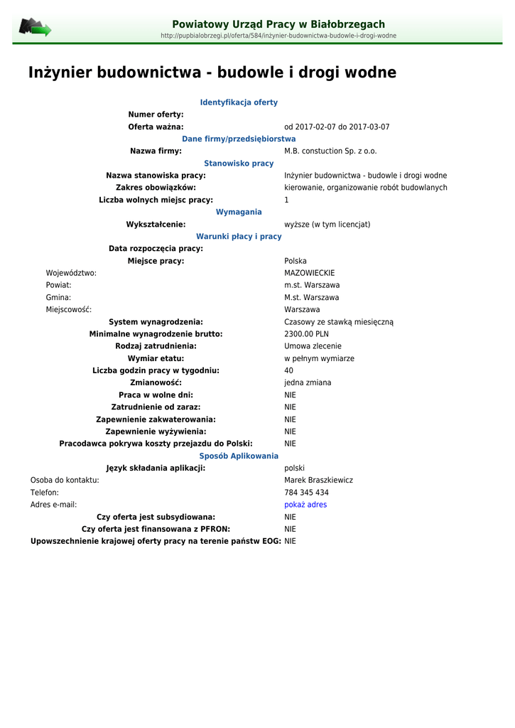Powiatowy Urząd Pracy w Białobrzegach http://pupbialobrzegi.pl/oferta/584/inżynier-budownictwa-budowle-i-drogi-wodne Inżynier budownictwa - budowle i drogi wodne Identyfikacja oferty Numer oferty: Oferta ważna: od 2017-02-07 do 2017-03-07 Dane firmy/przedsiębiorstwa Nazwa firmy: M.B. constuction Sp. z o.o. Stanowisko pracy Nazwa stanowiska pracy: Inżynier budownictwa - budowle i drogi wodne Zakres obowiązków: kierowanie, organizowanie robót budowlanych Liczba wolnych miejsc pracy: 1 Wymagania Wykształcenie: wyższe (w tym licencjat) Warunki płacy i pracy Data rozpoczęcia pracy: Miejsce pracy: Polska Województwo: MAZOWIECKIE Powiat: m.st. Warszawa Gmina: M.st. Warszawa Miejscowość: Warszawa System wynagrodzenia: Minimalne wynagrodzenie brutto: Rodzaj zatrudnienia: Czasowy ze stawką miesięczną 2300.00 PLN Umowa zlecenie Wymiar etatu: w pełnym wymiarze Liczba godzin pracy w tygodniu: Zmianowość: 40 jedna zmiana Praca w wolne dni: NIE Zatrudnienie od zaraz: NIE Zapewnienie zakwaterowania: NIE Zapewnienie wyżywienia: NIE Pracodawca pokrywa koszty przejazdu do Polski: NIE Sposób Aplikowania Język składania aplikacji: polski Osoba do kontaktu: Marek Braszkiewicz Telefon: 784 345 434 Adres e-mail: pokaż adres Czy oferta jest subsydiowana: NIE Czy oferta jest finansowana z PFRON: NIE Upowszechnienie krajowej oferty pracy na terenie państw EOG: NIE