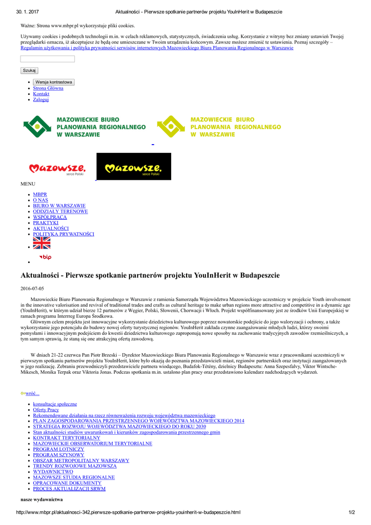 30. 1. 2017 Aktualności Pierwsze spotkanie partnerów projektu YouInHerit w Budapeszcie Ważne: Strona www.mbpr.pl wykorzystuje pliki cookies. Używamy cookies i podobnych technologii m.in. w celach reklamowych, statystycznych, świadczenia usług. Korzystanie z witryny bez zmiany ustawień Twojej przeglądarki oznacza, iż akceptujesz że będą one umieszczane w Twoim urządzeniu końcowym. Zawsze możesz zmienić te ustawienia. Poznaj szczegóły – Regulamin użytkowania i polityka prywatności serwisów internetowych Mazowieckiego Biura Planowania Regionalnego w Warszawie Szukaj Wersja kontrastowa Strona Główna Kontakt Zaloguj MENU MBPR O NAS BIURO W WARSZAWIE ODDZIAŁY TERENOWE WSPÓŁPRACA PRAKTYKI AKTUALNOŚCI POLITYKA PRYWATNOŚCI Aktualności Pierwsze spotkanie partnerów projektu YouInHerit w Budapeszcie 20160705 Mazowieckie Biuro Planowania Regionalnego w Warszawie z ramienia Samorządu Województwa Mazowieckiego uczestniczy w projekcie Youth involvement in the innovative valorisation and revival of traditional trades and crafts as cultural heritage to make urban regions more attractive and competitive in a dynamic age (YouInHerit), w którym udział bierze 12 partnerów z Węgier, Polski, Słowenii, Chorwacji i Włoch. Projekt współfinansowany jest ze środków Unii Europejskiej w ramach programu Interrreg Europa Środkowa. Głównym celem projektu jest innowacyjne wykorzystanie dziedzictwa kulturowego poprzez nowatorskie podejście do jego waloryzacji i ochrony, a także wykorzystanie jego potencjału do budowy nowej oferty turystycznej regionów. YouInHerit zakłada czynne zaangażowanie młodych ludzi, którzy swoimi pomysłami i innowacyjnym podejściem do kwestii dziedzictwa kulturowego zaproponują nowe sposoby na zachowanie tradycyjnych zawodów rzemieślniczych, a tym samym sprawią, że staną się one atrakcyjną ofertą zawodową. W dniach 2122 czerwca Pan Piotr Brzeski – Dyrektor Mazowieckiego Biura Planowania Regionalnego w Warszawie wraz z pracownikami uczestniczyli w pierwszym spotkaniu partnerów projektu YouInHerit, które było okazją do poznania przedstawicieli miast, regionów partnerskich oraz instytucji zaangażowanych w jego realizację. Zebraniu przewodniczyli przedstawiciele partnera wiodącego, BudafokTétény, dzielnicy Budapesztu: Anna Szepesfalvy, Viktor Wintsche Mikesch, Monika Terpak oraz Viktoria Jonas. Podczas spotkania m.in. ustalono plan pracy oraz przedstawiono kalendarz nadchodzących wydarzeń. wróć... konsultacje społeczne Oferty Pracy Rekomendowane działania na rzecz równoważenia rozwoju województwa mazowieckiego PLAN ZAGOSPODAROWANIA PRZESTRZENNEGO WOJEWÓDZTWA MAZOWIECKIEGO 2014 STRATEGIA ROZWOJU WOJEWÓDZTWA MAZOWIECKIEGO DO ROKU 2030 Stan aktualności studiów uwarunkowań i kierunków zagospodarowania przestrzennego gmin KONTRAKT TERYTORIALNY MAZOWIECKIE OBSERWATORIUM TERYTORIALNE PROGRAM LOTNICZY PROGRAM SZYNOWY OBSZAR METROPOLITALNY WARSZAWY TRENDY ROZWOJOWE MAZOWSZA WYDAWNICTWO MAZOWSZE STUDIA REGIONALNE OPRACOWANE DOKUMENTY PROCES AKTUALIZACJI SRWM nasze wydawnictwa http://www.mbpr.pl/aktualnosci342,pierwszespotkaniepartnerowprojektuyouinheritwbudapeszcie.html 1/2 30. 1. 2017 Aktualności Pierwsze spotkanie partnerów projektu YouInHerit w Budapeszcie mbpr aktualności o nas biuro w Warszawie oddziały terenowe opracowane dokumenty wydawnictwo współpraca kontakt książka teleadresowa © 1999 2017 Mazowieckie Biuro Planowania Regionalnego w Warszawie wykonanie Conor.pl http://www.mbpr.pl/aktualnosci342,pierwszespotkaniepartnerowprojektuyouinheritwbudapeszcie.html 2/2