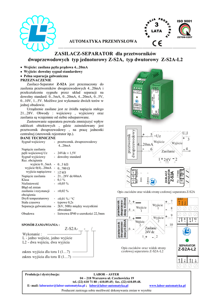 ISO 9001 3 LATA ZETOM-CERT AUTOMATYKA PRZEMYSŁOWA ZASILACZ-SEPARATOR dla przetworników dwuprzewodowych typ jednotorowy Z-S2A, typ dwutorowy Z-S2A-L2 Obudowa Wejście Wyjście -4 Zasilanie -4 -2 +1 Z-S2A Zakre s Wy- 2 4V -2 ZASILACZ SEPARATOR 1 + 24V Zero 0...3 kΩ 0...700 Ω ≥2 kΩ 21...28V dc/60mA 0,1 % ±0,05 % +3 -6 +5 - U,I + 3 5 +Uz 4...20mA - 6 Wy+ We jści e - 24Vdc ± 1,5V - dowolny standard + - ±0,02 % Opis zacisków oraz widok strony czołowej separatora Z-S2A - ±0,01 % / °C - typowe 0,2s - 2kV, 50Hz między wszystkimi obwodami - listwowa IP40 o szerokości 22,5mm przetwornik dwuprzewodowy 4-20mA Napięcie zasilania pętli wejściowej Uz Sygnał wyjściowy Rez. obciążenia wyjście 0...5mA wyjście 0(4)...20mA wyjścia napięciowe Napięcie zasilania Klasa Nieliniowość Błąd od zmian zasilania i rezystancji obciążenia Dryft temperaturowy Stała czasowa Separacja galwaniczna - przetwornik. dwuprzewodowy 4...20mA SPOSÓB ZAMAWIANIA : Z-S2A- Wykonanie : L - jedno wejście, jedno wyjście L2 - dwa wejścia, dwa wyjścia zakres wyjścia dla toru I (1...7) zakres wyjścia dla toru II (1...7) Produkcja i dystrybucja: - / przetwornik dwuprzewodowy 4-20mA Sygnał wejściowy przetwornik dwuprzewodowy • Wejście: zasilana pętla prądowa 4...20mA • Wyjście: dowolny sygnał standardowy • Pełna separacja galwaniczna PRZEZNACZENIE Zasilacz-Separator Z-S2A jest przeznaczony do zasilenia przetworników dwuprzewodowych 4...20mA i przekształceniu sygnału przez układ separacji na dowolny standard: 0...5mA, 0...20mA, 4...20mA, 0...5V, 0...10V, 1...5V. Możliwe jest wykonanie dwóch torów w jednej obudowie. Urządzenie zasilane jest ze źródła napięcia stałego 21...28V. Obwody : wejściowy , wyjściowy oraz zasilania są wzajemnie od siebie odseparowane. Zastosowanie separatora pozwala zmniejszyć wpływ zakłóceń obiektowych , gdzie zainstalowany jest przetwornik dwuprzewodowy , na pracę jednostki centralnej (sterownik rejestrator itp.). DANE TECHNICZNE 3 + 4 - 5 + 6 - Wejście 1 Wejście 2 1 Wyjście 1 Wyjście 2 Zasilanie 24V dc + - + 7 - + - 1 2 7 8 8 + 9 - 24V 10 + - 9 10 + - 2 Opis zacisków oraz widok strony czołowej separatora Z-S2A-L2 SEPARATOR Z-S2A-L2 +3 - 4 LABOR – ASTER 04 – 218 Warszawa ul. Czechowicka 19 tel. (22) 610 71 80 ; 610.89.45; fax. (22) 610.89.48. E- mail: [email protected] ; [email protected] www.labor-automatyka.pl Producent zastrzega sobie możliwość dokonywania zmian w wyrobie +5 6-
