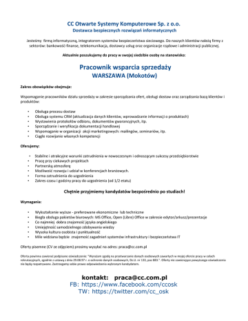 CC Otwarte Systemy Komputerowe Sp. z o.o. Dostawca bezpiecznych rozwiązań informatycznych Jesteśmy firmą informatyczną, integratorem systemów bezpieczeństwa sieciowego. Do naszych klientów należą firmy z sektorów: bankowość-finanse, telekomunikacja, dostawcy usług oraz organizacje rządowe i administracji publicznej. Aktualnie poszukujemy do pracy w swojej siedzibie osoby na stanowisko: Pracownik wsparcia sprzedaży WARSZAWA (Mokotów) Zakres obowiązków obejmuje: Wspomaganie pracowników działu sprzedaży w zakresie sporządzania ofert, obsługi dostaw oraz zarządzania bazą klientów i produktów: Obsługa procesu dostaw Obsługa systemu CRM (aktualizacja danych klientów, wprowadzanie informacji o produktach) Wystawienia protokołów odbioru, dokumentów gwarancyjnych, itp. Sporządzanie i weryfikacja dokumentacji handlowej Wspomaganie w organizacji akcji marketingowych: mailingów, seminariów, itp. Ciągłe rozwijanie własnych kompetencji • • • • • • Oferujemy: • • • • • • Stabilne i atrakcyjne warunki zatrudnienia w nowoczesnym i odnoszącym sukcesy przedsiębiorstwie Pracę przy ciekawych projektach Partnerską atmosferę Możliwość rozwoju i udział w konferencjach branżowych. Forma zatrudnienia do uzgodnienia Zakres czasu i godziny pracy do uzgodnienia (od 1/2 etatu) Chętnie przyjmiemy kandydatów bezpośrednio po studiach! Wymagania: • • • • • • Wykształcenie wyższe - preferowane ekonomiczne lub techniczne Biegła obsługa pakietów biurowych: MS Office, Open (Libre) Office w zakresie edytor/arkusz/prezentacje Co najmniej dobra znajomość języka angielskiego Umiejętność samodzielnego zdobywania wiedzy Wysoka kultura osobista i punktualność Mile widziana będzie znajomość zagadnień systemów infrastruktury i bezpieczeństwa IT Oferty pisemne (CV ze zdjęciem) prosimy wysyłać na adres: [email protected] Oferta powinna zawierać podpisane oświadczenie: "Wyrażam zgodę na przetwarzanie danych osobowych zawartych w mojej ofercie pracy w celach rekrutacyjnych, zgodnie z ustawą z dnia 29.08.97 r. o ochronie danych osobowych, Dz.U. nr 133, poz 883.". Oferty nie zawierające powyższego oświadczenia nie będą rozpatrywane. Zastrzegamy sobie prawo odpowiedzenia wybranym kandydatom. kontakt: [email protected] FB: https://www.facebook.com/ccosk TW: https://twitter.com/cc_osk
