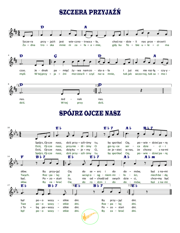 SZCZERA PRZYJAŹŃ D 4 4 Szcze ra Ża dna 4 A przy tro jaźń ska jest wie czno mnie ni za D trwa a ła a ła, mie, G choć roz gdy ku li nas prze bie u le strzeń i ci ma dzie To D A nic nie roz łą wczo raj, tak sa czy y mo i czas. myśl. 8 Je dnak W tej przy pa ja mięć ży wa nam zo źni mo żesz li czyć 1.D sta a na a ła mnie, i już tak jak 2.D nas. dziś. Jed W tej nak przy nas. dziś. SPÓJRZ OJCZE NASZ E♭ 10 44 dziś przy przy nie dzię ku dziś przy szli śli je szli tu, Ci Ci, tu, E♭ 7 A♭ B♭ 7 Cię, ser w nas, Cię, po ca że po Spójrz, Oj cze Dziś, Oj cze Dziś, Oj cze Spójrz, Oj cze 14 F B♭ 7 E♭ słów. Twych. być. słów. 17 nasz, nasz, nasz, nasz, By Roz Po By E♭ był Twe z To był przy pa zo za Cię je tu, Cię B♭ 7 do se wciąż o nie od do ro 1.E ♭ po po bą po stkie stkie stkie stkie dni. dni. dni. dni. o o po o wszy wszy wszy wszy by spo tkać go rą ce że je steś by spo tkać E♭ 7 jąć laj stań brać śmy śmy my śmy A♭ do mi swych do do ło dzie do mów, ści, ci, mów, B♭ 7 C wie dzieć pa rę dzie ci i chcesz z na mi wie dzieć pa rę A♭ m erc i og niem chodź od dzin i byś z na niech be chce my byś z na 2.E ♭ By Roz Po By przy pa zo za jąć laj stań brać dni. dni. dni. dni. mi dą być mi