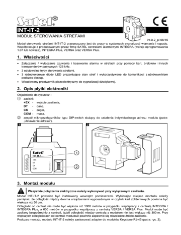 INT-IT-2 MODUŁ STEROWANIA STREFAMI int-it-2_pl 08/15 Moduł sterowania strefami INT-IT-2 przeznaczony jest do pracy w systemach sygnalizacji włamania i napadu. Współpracuje z produkowanymi przez firmę SATEL centralami alarmowymi INTEGRA (wersja oprogramowania 1.07 lub nowsza), INTEGRA Plus, VERSA oraz VERSA Plus. 1. Właściwości • Załączanie / wyłączanie czuwania i kasowanie alarmu w strefach przy pomocy kart, breloków i innych transponderów pasywnych 125 kHz. • 3 edytowalne tryby sterowania strefami. • 3 różnokolorowe diody LED prezentujące stan stref i wykorzystywane do komunikacji z użytkownikiem podczas obsługi. • Wbudowany przetwornik piezoelektryczny do sygnalizacji dźwiękowej. 2. Opis płytki elektroniki Objaśnienia do rysunku1: zaciski: +EX - wejście zasilania, DT - dane, CK - zegar, COM - masa. zespół mikroprzełączników typu DIP-switch służący do ustalenia indywidualnego adresu modułu (patrz: „Ustawienie adresu”). 3. Montaż modułu Wszystkie połączenia elektryczne należy wykonywać przy wyłączonym zasilaniu. Moduł INT-IT-2 powinien być instalowany wewnątrz pomieszczeń. Wybierając miejsce montażu należy pamiętać, że odległość między dwoma urządzeniami wyposażonymi w czytnik kart zbliżeniowych powinna być większa niż 50 cm. Odległość od centrali nie może być większa niż 1000 metrów w przypadku współpracy z centralą INTEGRA / INTEGRA Plus, a 600 metrów w przypadku współpracy z centralą VERSA / VERSA Plus. Moduł może być zasilany bezpośrednio z centrali, jeżeli odległość między centralą a modułem nie jest większa niż 300 m. Przy większych odległościach od centrali modułowi powinno zapewnić się niezależne źródło zasilania. Podczas montażu modułu INT-IT-2 należy zastosować adapter do modułów Keystone RJ-45 (patrz: rys. 2). 2 INT-IT-2 SATEL 3.1 Ustawianie adresu Przełączniki od 1 do 5 służą do ustawienia adresu. Każdemu przełącznikowi przypisana jest wartość liczbowa. W pozycji OFF jest to 0. Wartości liczbowe przypisane do poszczególnych przełączników w pozycji ON prezentuje tabela 1. Po zsumowaniu wartości liczbowych przypisanych do przełączników 1-5 otrzymamy adres ustawiony w module. Położenie przełącznika 6 nie ma znaczenia. 1 2 3 4 5 Numer przełącznika Wartość liczbowa 1 2 4 8 16 Tabela 1. Wartości liczbowe przypisane do mikroprzełączników w pozycji ON. Współpraca z centralą INTEGRA / INTEGRA Plus Można ustawić dowolny, niewykorzystany adres od z zakresu od 0 do 31. Współpraca z centralą VERSA / VERSA Plus Należy ustawić adres z zakresu od 16 (10h) do 21 (15h). 4. Programowanie modułu Programowanie odbywa się za pośrednictwem centrali alarmowej, przy pomocy manipulatora lub komputera z zainstalowanym programem DLOADX. 4.1 Ustawienia modułu Ustawienia modułu można skonfigurować: • moduł podłączony do centrali INTEGRA / INTEGRA Plus: − manipulator: TRYB SERWISOWY STRUKTURA SPRZĘT EKSPANDERY USTAWIENIA [wybrać moduł z listy urządzeń]; − program DLOADX: okno „Struktura” zakładka „Sprzęt” gałąź ”Ekspandery” [kliknąć na moduł na liście urządzeń]. • moduł podłączony do centrali VERSA / VERSA Plus: − manipulator: TRYB SERWISOWY 2. SPRZĘT 1. MANIP. I EKSP. 2. USTAWIENIA [wybrać moduł z listy urządzeń]; − program DLOADX: okno „Versa / Versa Plus – Struktura” zakładka „Sprzęt” [kliknąć na moduł na liście urządzeń]. 4.2 Parametry i opcje Nazwy parametrów i opcji dostępnych tylko w przypadku podłączenia modułu do centrali INTEGRA lub INTEGRA Plus zostały wyróżnione białym tekstem na czarnym tle. W nawiasach kwadratowych podane zostały nazwy parametrów i opcji prezentowane na wyświetlaczu manipulatora systemu alarmowego INTEGRA / INTEGRA Plus. Nazwa – indywidualna nazwa urządzenia (do 16 znaków). Strefa [Sabotaż w str.] (INTEGRA / INTEGRA Plus) / Sabotaż alarmuje w strefie (VERSA / VERSA Plus) – strefa, w której wywołany zostanie alarm w przypadku odłączenia modułu od centrali. LED R [Strefy LED R ] – sposób reakcji stref po odsunięciu karty, gdy czerwona dioda jest zapalona. W strefie może zostać załączone pełne czuwanie lub stan strefy się nie zmieni. LED G [Strefy LED G ] / LED Y [Strefy LED Y] – sposób reakcji stref po odsunięciu karty, gdy zielona (tryb A) / żółta dioda (tryb B) jest zapalona. W strefie może zostać załączony jeden z dostępnych w centrali typów czuwania lub stan strefy nie ulegnie zmianie. W przypadku centrali VERSA / VERSA Plus, może także zostać wyłączone czuwanie. Sygnalizacja sprzętowa odczytu [Sygn. sprzęt.] – moduł może sygnalizować pojedynczym dźwiękiem odczytanie kodu karty lub zapalenie diody LED (kod przesyłany jest do centrali po odsunięciu karty i dopiero wtedy sygnalizowana jest dźwiękiem reakcja na odczytany kod). Sygnalizacja alarmu [Alarm na czas] – moduł może sygnalizować dźwiękiem alarmy przez CZAS ALARMU W MANIPULATORACH [VERSA / VERSA Plus] / GLOBALNY CZAS ALARMU [INTEGRA / INTEGRA Plus]. Sygnalizacja alarmu do skasowania [Alarm do skas.] – moduł może sygnalizować dźwiękiem pamięć alarmu. Sygnalizacja czasu na wejście [Czas na wej.] – moduł może sygnalizować dźwiękiem odliczanie czasu na wejście. Sygnalizacja czasu na wyjście [Czas na wyj.] – moduł może sygnalizować dźwiękiem odliczanie czasu na wyjście, a w przypadku centrali VERSA / VERSA Plus także opóźnienia autouzbrojenia. SATEL INT-IT-2 3 Sygnalizacja opóźnienia autouzbrojenia [Odl. autouzbr.] – moduł może sygnalizować dźwiękiem odliczanie opóźnienia autouzbrojenia. Bez blokady po trzech sabotażach [Bez blok. 3 sab.] – możliwe jest wyłączenie mechanizmu ograniczającego liczbę alarmów sabotażowych z ekspandera do trzech. Alarm: 3 błędne karty [Al. 3 bł. karty] – trzykrotne odczytanie nieznanej karty wywoła alarm. Sygnalizuje oczekiwanie na drugi