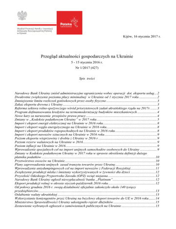 Kijów, 16 stycznia 2017 r. Przegląd aktualności gospodarczych na Ukrainie 5 - 15 stycznia 2016 r. Nr 1/2017 (427) Spis treści Narodowy Bank Ukrainy zniósł administracyjne ograniczenia wobec operacji dot. eksportu usług ... 2 Dwukrotne zwiększenie poziomu płacy minimalnej w Ukrainie od 1 stycznia 2017 roku .................... 2 Zmniejszenie limitu rozliczeń gotówkowych przez osoby fizyczne ......................................................... 3 Zakaz eksportu drewna z Ukrainy .......................................................................................................... 3 Reforma sektora rolno-spożywczego wśród priorytetowych zadań ukraińskiego rządu na 2017r. ....... 3 Program dofinansowania kredytów na termomodernizację budynków mieszkaniowych ...................... 4 Nowe kary za naruszenia przepisów prawa pracy ................................................................................ 4 Zmiany w „Kodeksie podatkowym Ukrainy” w 2017 roku .................................................................... 5 Import i eksport energii elektrycznej na Ukrainie w 2016 roku............................................................. 8 Import i eksport węgla energetycznego na Ukrainie w 2016 roku......................................................... 8 Import i eksport produktów ropopochodnych na Ukrainie w 2016 roku ............................................... 8 Import i eksport nawozów sztucznych na Ukrainie w 2016 roku ........................................................... 9 Poziom eksportu wieprzowiny i drobiu z Ukrainy w 2016 r. ................................................................. 9 Poziom rezerw walutowych na Ukrainie w 2016 ................................................................................... 9 Poziom inflacji na Ukrainie w 2016 ....................................................................................................... 9 Wprowadzenie specjalnych ceł na import unijnych samochodów osobowych do Ukrainy ................... 9 Zmiany w Kodeksie podatkowym Ukrainy w 2017 roku w sprawie określenia definicji dużego płatnika podatków ................................................................................................................................ 10 Przetwórstwo owoców na Ukrainie...................................................................................................... 10 Plany zaprowadzenia unijnych zasad tranzytu towarów przez Ukrainę ............................................. 10 Wprowadzenie antydumpingowych ceł na import nawozów z Federacji Rosyjskiej............................ 11 Zwiększenie produkcji mleka i śmietany wykorzystywanych w żywności dla dzieci ............................ 12 Przyszłość Odeskiego Pryportvoho Zavodu (OPZ) wciąż niejasna ..................................................... 12 Narodowy Bank Ukrainy ogłosił niewypłacalność banku „Platinum”................................................ 12 Eksport produkcji rolnej w okresie styczeń-październik 2016 roku ..................................................... 12 Od połowy grudnia 2016 r. swoją działalność oficjalnie zakończyło około 140 tysięcy przedsiębiorców.................................................................................................................................... 13 Osłabienie waluty ukraińskiej .............................................................................................................. 13 Wykorzystanie kontyngentów przez Ukrainę na bezcłowy eksport towarów do UE w 2016 roku ....... 14 Ministerstwo Sprawiedliwości Ukrainy udostępniło rejestr dłużników ............................................... 15 Zestawienie wybranych ogłoszeń o zamówieniach publicznych na Ukrainie ...................................... 15 *** Uwaga: wszelkie załączniki do informacji prezentowanych poniżej znaleźć można na stronie internetowej Wydziału Promocji Handlu i Inwestycji Ambasady RP w Kijowie (https://ukraine.trade.gov.pl) w informacjach z danego dnia, zamieszczonych w zakładce „Aktualności”. Narodowy Bank Ukrainy zniósł administracyjne ograniczenia wobec operacji dot. eksportu usług Kijów, 4 stycznia 2017 r. Narodowy Bank Ukrainy zniósł administracyjne ograniczenia w odniesieniu do operacji dot. eksportu usług zgodnie z zapisami Ustawy Ukrainy Nr 1724-VII „O wniesieniu zmian do niektórych aktów prawnych Ukrainy (w zakresie usunięcia administracyjnych barier przy eksporcie usług). Zgodnie z wytycznymi w/w ustawy Narodowy Bank Ukrainy wniósł zmiany do „Instrukcji dot. trybu przeprowadzania kontroli operacji eksportowych i importowych” wprowadzając uproszczenia w odniesieniu do transakcji z eksportu usług. Wprowadzone zmiany zakładają: wprowadzenie 120-dniowego terminu rozliczeń transakcji handlu zagranicznego przez rezydentów ukraińskich, którzy dokonują eksportu usług (nie dotyczy eksportu usług transportowych i ubezpieczeniowych), sprzedaży za granicę praw aktorskich, pokrewnych i praw własności intelektualnej; zniesienie obowiązku przekazywania do banku przez eksporterów usług przetłumaczonych na język ukraińskich dokumentów handlowych (kontrakt, faktura) w przypadku, gdy dokumenty te są sporządzone są w języku angielskim lub w innym języku obcym i języku angielskim (dwujęzyczne); możliwość wykorzystania przez banki rezydentów w ramach przeprowadzania walutowej kontroli transakcji handlu zagranicznego kopii dokumentów handlowych w formie elektronicznej (w tym kopii faktury). W powyższym przypadku rezydent powinien zeskanować oryginał dokumentu i zaświadczyć go elektronicznym cyfrowym podpisem (w przypadku osób prawnych – podpisem upoważnionej osoby). Wyżej opisane zmiany weszły w życie z dniem 3 stycznia 2017 roku na mocy Decyzji NBU Nr 419 z dn. 30 grudnia 2016 roku. *** Przypominamy, iż stosowna ustawa uproszczająca eksport u