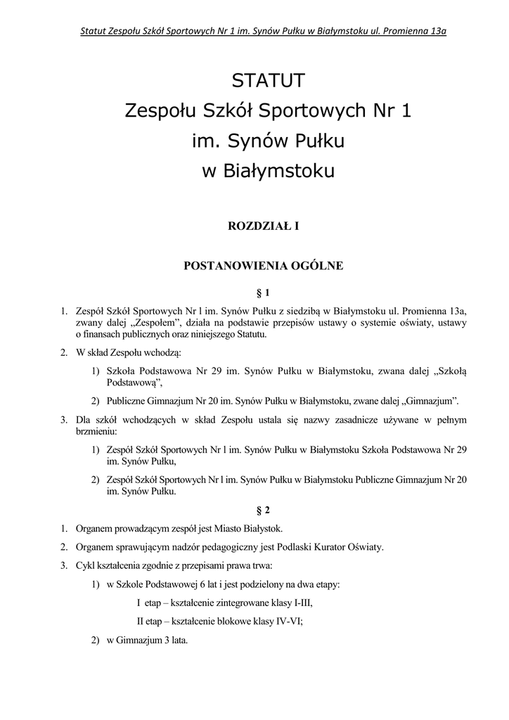 STATUT Zespołu Szkół Sportowych Nr 1 im. Synów Pułku w