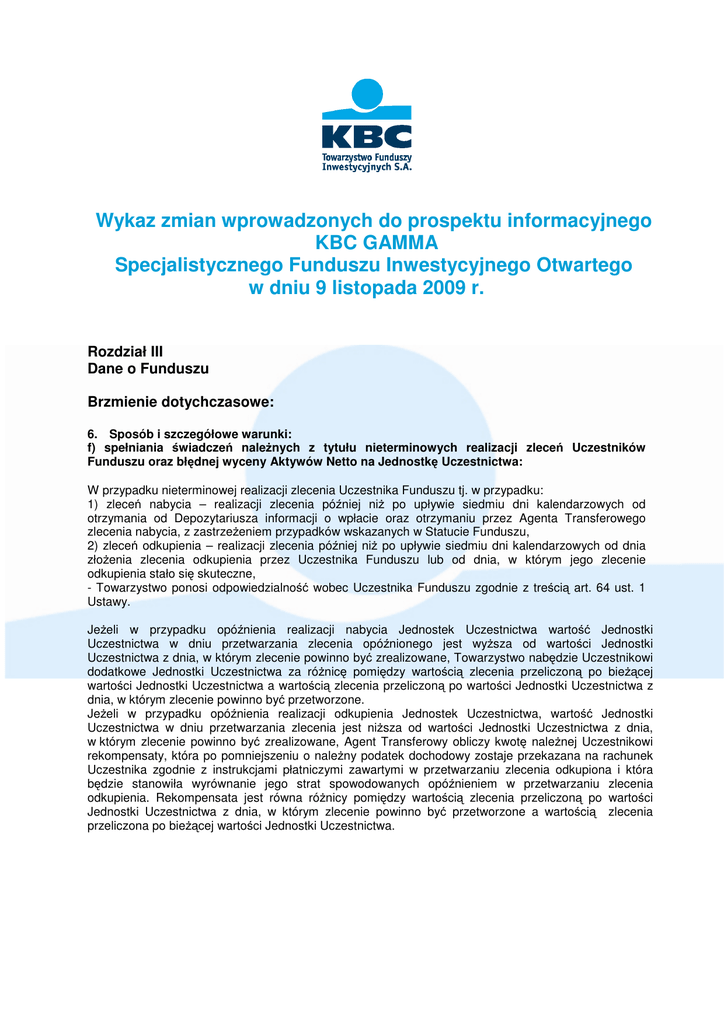 Wykaz zmian wprowadzonych do prospektu informacyjnego KBC GAMMA Specjalistycznego Funduszu Inwestycyjnego Otwartego w dniu 9 listopada 2009 r. Rozdział III Dane o Funduszu Brzmienie dotychczasowe: 6. Sposób i szczegółowe warunki: f) spełniania świadczeń należnych z tytułu nieterminowych realizacji zleceń Uczestników Funduszu oraz błędnej wyceny Aktywów Netto na Jednostkę Uczestnictwa: W przypadku nieterminowej realizacji zlecenia Uczestnika Funduszu tj. w przypadku: 1) zleceń nabycia – realizacji zlecenia później niż po upływie siedmiu dni kalendarzowych od otrzymania od Depozytariusza informacji o wpłacie oraz otrzymaniu przez Agenta Transferowego zlecenia nabycia, z zastrzeżeniem przypadków wskazanych w Statucie Funduszu, 2) zleceń odkupienia – realizacji zlecenia później niż po upływie siedmiu dni kalendarzowych od dnia złożenia zlecenia odkupienia przez Uczestnika Funduszu lub od dnia, w którym jego zlecenie odkupienia stało się skuteczne, - Towarzystwo ponosi odpowiedzialność wobec Uczestnika Funduszu zgodnie z treścią art. 64 ust. 1 Ustawy. Jeżeli w przypadku opóźnienia realizacji nabycia Jednostek Uczestnictwa wartość Jednostki Uczestnictwa w dniu przetwarzania zlecenia opóźnionego jest wyższa od wartości Jednostki Uczestnictwa z dnia, w którym zlecenie powinno być zrealizowane, Towarzystwo nabędzie Uczestnikowi dodatkowe Jednostki Uczestnictwa za różnicę pomiędzy wartością zlecenia przeliczoną po bieżącej wartości Jednostki Uczestnictwa a wartością zlecenia przeliczoną po wartości Jednostki Uczestnictwa z dnia, w którym zlecenie powinno być przetworzone. Jeżeli w przypadku opóźnienia realizacji odkupienia Jednostek Uczestnictwa, wartość Jednostki Uczestnictwa w dniu przetwarzania zlecenia jest niższa od wartości Jednostki Uczestnictwa z dnia, w którym zlecenie powinno być zrealizowane, Agent Transferowy obliczy kwotę należnej Uczestnikowi rekompensaty, która po pomniejszeniu o należny podatek dochodowy zostaje przekazana na rachunek Uczestnika zgodnie z instrukcjami płatniczymi zawartymi w przetwarzaniu zlecenia odkupiona i która będzie stanowiła wyrównanie jego strat spowodowanych opóźnieniem w przetwarzaniu zlecenia odkupienia. Rekompensata jest równa różnicy pomiędzy wartością zlecenia przeliczoną po wartości Jednostki Uczestnictwa z dnia, w którym zlecenie powinno być przetworzone a wartością zlecenia przeliczona po bieżącej wartości Jednostki Uczestnictwa. Brzmienie obecne: 6. Sposób i szczegółowe warunki: f) spełniania świadczeń należnych z tytułu nieterminowych realizacji zleceń Uczestników Funduszu oraz błędnej wyceny Aktywów Netto na Jednostkę Uczestnictwa: W przypadku nieterminowej realizacji zlecenia Uczestnika Funduszu tj. w przypadku: 1) zleceń nabycia – realizacji zlecenia później niż po upływie siedmiu dni kalendarzowych od otrzymania przez Fundusz od Depozytariusza informacji o wpłacie oraz otrzymaniu zlecenia nabycia, z zastrzeżeniem przypadków wskazanych w Statucie Funduszu, 2) zleceń odkupienia – realizacji zlecenia później niż po upływie siedmiu dni kalendarzowych od dnia złożenia zlecenia odkupienia przez Uczestnika Funduszu lub od dnia, w którym jego zlecenie odkupienia stało się skuteczne, - Towarzystwo ponosi odpowiedzialność wobec Uczestnika Funduszu zgodnie z treścią art. 64 ust. 1 Ustawy. Jeżeli w przypadku opóźnienia realizacji nabycia Jednostek Uczestnictwa wartość Jednostki Uczestnictwa w dniu przetwarzania zlecenia opóźnionego jest wyższa od wartości Jednostki Uczestnictwa z dnia, w którym zlecenie powinno być zrealizowane, Towarzystwo nabędzie Uczestnikowi dodatkowe Jednostki Uczestnictwa za różnicę pomiędzy wartością zlecenia przeliczoną po bieżącej wartości Jednostki Uczestnictwa a wartością zlecenia przeliczoną po wartości Jednostki Uczestnictwa z dnia, w którym zlecenie powinno być przetworzone. Jeżeli w przypadku opóźnienia realizacji odkupienia Jednostek Uczestnictwa, wartość Jednostki Uczestnictwa w dniu przetwarzania zlecenia jest niższa od wartości Jednostki Uczestnictwa z dnia, w którym zlecenie powinno być zrealizowane, Agent Transferowy obliczy kwotę należnej Uczestnikowi rekompensaty, która po pomniejszeniu o należny podatek dochodowy zostaje przekazana na rachunek Uczestnika zgodnie z instrukcjami płatniczymi zawartymi w przetwarzaniu zlecenia odkupiona i która będzie stanowiła wyrównanie jego strat spowodowanych opóźnieniem w przetwarzaniu zlecenia odkupienia. Rekompensata jest równa różnicy pomiędzy wartością zlecenia przeliczoną po wartości Jednostki Uczestnictwa z dnia, w którym zlecenie powinno być przetworzone a wartością zlecenia przeliczona po bieżącej wartości Jednostki Uczestnictwa. Brzmienie dotychczasowe: 8. Określenie terminów, w jakich najpóźniej nastąpi: a) zbycie przez Fundusz Jednostek Uczestnictwa po dokonaniu wpłaty na te Jednostki Nabycie Jednostek Uczestnictwa następuje w Dniu Wyceny, w którym Agent Transferowy dokonuje wpisania nabytych Jednostek Uczestnictwa do Rejestru, jednak nie później niż siedem dni kalendarzowych po dokonaniu wpłaty środków na Jednostki Uczestnictwa. Przez dzień dokonania wpłaty środków rozumie się dzień dokonania wpłaty środków u Dystrybutora lub dzień uznania wpłaty na rachunku bankowym Funduszu u Depozytariusza w przypadku dokonywania wpłat bezpośrednich na rachunek bankowy Funduszu. W przypadku, gdy Agent Transferowy otrzyma zlecenie nabycia Jednostek Uczestnictwa oraz rachunek Funduszu zostanie uznany środkami pieniężnymi na pokrycie zlecenie nie później niż o godzinie 14.00, Uczestnik nabywa Jednostki Uczestnictwa z tego Dnia Wyceny. W przypadku gdy Agent Transferowy otrzyma zlecenie nabycia Jednostek Uczestnictwa lub rachunek Funduszu zostanie uznany środkami pieniężnymi na pokrycie zlecenia po godzinie 14.00 Uczestnik nabywa Jednostki Uczestni