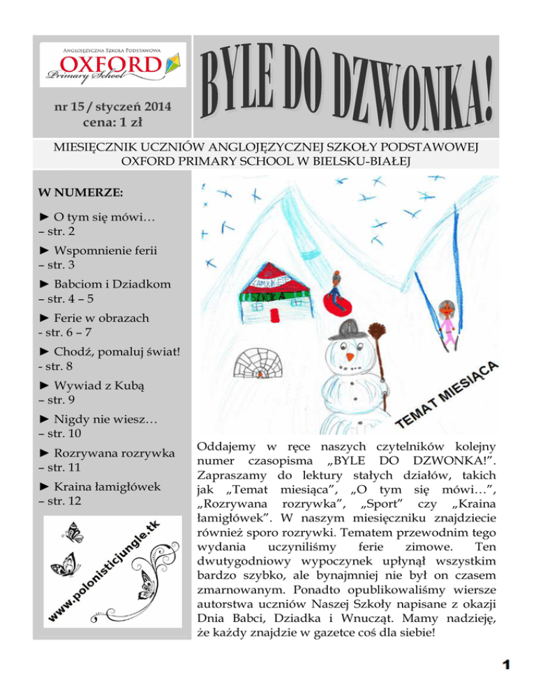 nr 15 / styczeń 2014 cena: 1 zł MIESIĘCZNIK UCZNIÓW ANGLOJĘZYCZNEJ SZKOŁY PODSTAWOWEJ OXFORD PRIMARY SCHOOL W BIELSKU-BIAŁEJ W NUMERZE: ► O tym się mówi… – str. 2 ► Wspomnienie ferii – str. 3 ► Babciom i Dziadkom – str. 4 – 5 ► Ferie w obrazach - str. 6 – 7 ► Chodź, pomaluj świat! - str. 8 ► Wywiad z Kubą – str. 9 ► Nigdy nie wiesz… – str. 10 ► Rozrywana rozrywka – str. 11 ► Kraina łamigłówek – str. 12 Oddajemy w ręce naszych czytelników kolejny numer czasopisma „BYLE DO DZWONKA!”. Zapraszamy do lektury stałych działów, takich jak „Temat miesiąca”, „O tym się mówi…”, „Rozrywana rozrywka”, „Sport” czy „Kraina łamigłówek”. W naszym miesięczniku znajdziecie również sporo rozrywki. Tematem przewodnim tego wydania uczyniliśmy ferie zimowe. Ten dwutygodniowy wypoczynek upłynął wszystkim bardzo szybko, ale bynajmniej nie był on czasem zmarnowanym. Ponadto opublikowaliśmy wiersze autorstwa uczniów Naszej Szkoły napisane z okazji Dnia Babci, Dziadka i Wnucząt. Mamy nadzieję, że każdy znajdzie w gazetce coś dla siebie! O TYM SIĘ MÓWI… Na drugiej stronie naszego czasopisma prezentujemy informacje na temat sukcesów uczniów Naszej Szkoły w różnych konkursach. Jednocześnie zachęcamy Was do udziału w kolejnych. Zapraszamy do udziału w konkursach organizowanych w ramach projektu Kajakowy Patrol Św. Franciszka: „ZATRZYMAJ RZEKĘ W KADRZE” – konkurs fotograficzny Należy samodzielnie wykonać ciekawą fotografię rzeki (o dowolnej porze roku). „OSZCZĘDZAJ WODĘ” – konkurs plastyczny Razem z rodzicami należy wykonać ciekawy projekt naklejki zachęcającej do oszczędzania wody. „WODNY TEATR” – konkurs filmowy Przedmiotem konkursu jest przygotowanie spektaklu przedstawiającego problem ochrony wód i gospodarki wodnej. teatralnego Dzięki dofinansowaniu Narodowego Funduszu Ochrony Środowiska i Gospodarki Wodnej na zwycięzców czekają bardzo atrakcyjne nagrody: kamery cyfrowe, aparaty fotograficzne, książki edukacyjne. Więcej o projekcie i konkursach na stronie internetowej www.kajakowypatrol.pl. Dodatkowych informacji udziela p. Grzegorz Wójtowicz. „MAM KOLEŻANKI I KOLEGÓW CUDZOZIEMCÓW. CO O NICH WIEM?” Organizatorem konkursu jest Szkoła Podstawowa nr 31 w Lublinie, Stowarzyszenie „Dla Ziemi” i Centrum Wolontariatu w Lublinie. Każdy uczeń może przedstawić jedną pracę w dowolnej formie literackiej w objętości nieprzekraczającej jednej strony standardowego wydruku komputerowego, która będzie realizacją powyższego tematu. Dodatkowych informacji udziela p. Grzegorz Wójtowicz. Jeżeli Twoją pasją jest dziennikarstwo, zapraszamy do współpracy. Wszystkie materiały można wysyłać drogą elektroniczną na nasz adres e-mail: [email protected]. WSPOMNIENIE FERII Dwa tygodnie minęły bardzo szybko i pełni sił możemy powrócić do naszych szkolnych obowiązków. Jesteście ciekawi, jak wygląda zimowa przerwa w innych krajach Europy? Zapraszamy do zapoznania się z poniższym artykułem. Znajdziecie w nim informacje o innych dniach wolnych od szkoły. Rekordziści mają w Europie ponad 17 tygodni wolnego z powodu wakacji, ferii i przerw świątecznych. W Polsce szkoły nie pracują jedynie przez 13 tygodni. Polskie szkoły mają wyjątkowo napięty grafik. Ich przerwy w nauce, wakacje i ferie zamykają się w 13 tygodniach i sześciu dniach świątecznych. W aż 18 krajach uczniowie i nauczyciele spędzają poza klasą o wiele więcej czasu – mają od 14 nawet do ponad 17 tygodni wolnego w roku szkolnym. Do prawdziwych rekordzistów należą Francja, Litwa i Łotwa, gdzie wolne dni dają aż 17 tygodni. Francuskie szkoły zamierają na całe dwa tygodnie aż cztery razy w roku: jesienią, w czasie przerwy bożonarodzeniowej, podczas ferii zimowych na przełomie lutego i marca oraz wiosennych na przełomie kwietnia i maja. Potem, 4 lipca, rozpoczynają się wakacje, które trwają 9 tygodni. 16 tygodniami wolnego mogą się cieszyć uczniowie z Rumunii i Islandii, a 15 – Belgii, Luksemburga, Cypru, Węgier i Turcji. Ale tyle samo dni wolnych od nauki ma także Finlandia. 14 tygodni w roku odpoczywają uczniowie w Hiszpanii, Austrii, Estonii, Irlandii, Grecji, Słowenii oraz na Węgrzech. W sześciu krajach sytuacja wygląda podobnie, jak u nas. W Czechach, Niemczech, Norwegii, Anglii, Szwecji i Lichtensteinie wolne trwa średnio od 12,5 do 13,5 tygodnia w zależności od regionu. A tylko w Danii i na Słowacji uczniowie mają o tydzień mniej wolnego, bo jedynie 12 tygodni. Warto się przyjrzeć tym kalendarzom bliżej. Okazuje się, że oprócz tradycyjnych letnich wakacji i zimowych ferii, a także przerw z okazji świąt, np. Bożego Narodzenia, w innych krajach popularne są dodatkowe przerwy, których u nas nie ma. To np. jesienne wakacje, które trwają tydzień w Belgii, Estonii, Austrii czy Finlandii lub dwa tygodnie jak w Lichtensteinie. BABCIOM I DZIADKOM! Maja Paszek MOI PRZYJACIELE Jacek Laszczak-Chodacki DO BABCI Moja Babcia mnie przytula, mego brata do snu lula, a gdy przyjdzie zima chłodna, pomaga mi, bym była pogodna. Gdy Babcia spokojnie szydełkuje, to dziadek w kotłowni majsterkuje i dają mi słodyczy wiele, bo to moi Przyjaciele! Babciu, Dziadku, troszczycie się o mnie, więc za nic w świecie o Was nie zapomnę! Babciu! Życzę Ci dużo zdrowia i niech spokojna będzie Twoja głowa. Doceniasz moje talenty i dajesz mi często prezenty. Za to bardzo Ci dziękuję i te życzenia do Ciebie kieruję. Michalina Klapp KOCHAM WAS Droga Babciu, dobrze mi radzisz i tajemnicy mojej nie zdradzisz. A Ty, Dziadku, skoki oglądasz w fotelu i znasz zawodników wielu. Kocham Was, Babciu i Dziadku, szczerze i Wy mnie również, w co mocno wierzę. Kacper Gellner BABCIA Ty, Babciu, robisz taki pyszny chleb i sam nie wiem, co w nim takiego jest. Ty śpiewasz jak ptak i pachniesz jak piękny kwiat. Niedługo przeprowadzisz mnie 