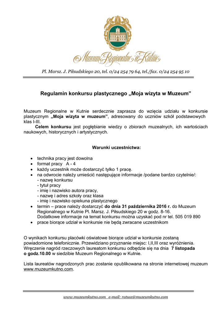 Pl. Marsz. J. Piłsudskiego 20, tel. 0/24 254 79 64, tel./fax. 0/24 254 95 10 Regulamin konkursu plastycznego „Moja wizyta w Muzeum” Muzeum Regionalne w Kutnie serdecznie zaprasza do wzięcia udziału w konkursie plastycznym „Moja wizyta w muzeum”, adresowany do uczniów szkół podstawowych klas I-III. Celem konkursu jest pogłębianie wiedzy o zbiorach muzealnych, ich wartościach naukowych, historycznych i artystycznych. Warunki uczestnictwa: technika pracy jest dowolna format pracy A - 4 każdy uczestnik może dostarczyć tylko 1 pracę. na odwrocie należy umieścić następujące informacje /podane bardzo czytelnie/: - nazwę konkursu - tytuł pracy - imię i nazwisko autora pracy, - nazwę i adres szkoły oraz klasa - imię i nazwisko opiekuna plastycznego termin – prace należy dostarczyć do dnia 31 października 2016 r. do Muzeum Regionalnego w Kutnie Pl. Marsz. J. Piłsudskiego 20 w godz. 8-16. Dodatkowe informacje na temat konkursu można uzyskać pod nr tel. 505 019 890 prace biorące udział w konkursie nie będą zwracane uczestnikom O wynikach konkursu placówki oświatowe biorące udział w konkursie zostaną powiadomione telefonicznie. Przewidziano przyznanie miejsc: I,II,III oraz wyróżnienia. Wręczenie nagród rzeczowych laureatom konkursu odbędzie się na dnia 7 listopada o godz.10.00 w siedzibie Muzeum Regionalnego w Kutnie. Lista laureatów nagrodzonych prac zostanie opublikowana na stronie internetowej muzeum www.muzeumkutno.com. www.muzeumkutno.com e-mail: [email protected]