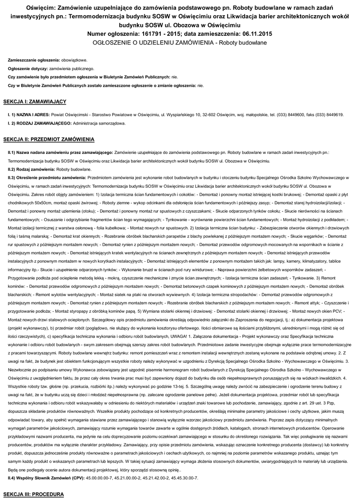 Oświęcim: Zamówienie uzupełniające do zamówienia podstawowego pn. Roboty budowlane w ramach zadań inwestycyjnych pn.: Termomodernizacja budynku SOSW w Oświęcimiu oraz Likwidacja barier architektonicznych wokół budynku SOSW ul. Obozowa w Oświęcimiu Numer ogłoszenia: 161791 - 2015; data zamieszczenia: 06.11.2015 OGŁOSZENIE O UDZIELENIU ZAMÓWIENIA - Roboty budowlane Zamieszczanie ogłoszenia: obowiązkowe. Ogłoszenie dotyczy: zamówienia publicznego. Czy zamówienie było przedmiotem ogłoszenia w Biuletynie Zamówień Publicznych: nie. Czy w Biuletynie Zamówień Publicznych zostało zamieszczone ogłoszenie o zmianie ogłoszenia: nie. SEKCJA I: ZAMAWIAJĄCY I. 1) NAZWA I ADRES: Powiat Oświęcimski - Starostwo Powiatowe w Oświęcimiu, ul. Wyspiańskiego 10, 32-602 Oświęcim, woj. małopolskie, tel. (033) 8449600, faks (033) 8449619. I. 2) RODZAJ ZAMAWIAJĄCEGO: Administracja samorządowa. SEKCJA II: PRZEDMIOT ZAMÓWIENIA II.1) Nazwa nadana zamówieniu przez zamawiającego: Zamówienie uzupełniające do zamówienia podstawowego pn. Roboty budowlane w ramach zadań inwestycyjnych pn.: Termomodernizacja budynku SOSW w Oświęcimiu oraz Likwidacja barier architektonicznych wokół budynku SOSW ul. Obozowa w Oświęcimiu. II.2) Rodzaj zamówienia: Roboty budowlane. II.3) Określenie przedmiotu zamówienia: Przedmiotem zamówienia jest wykonanie robot budowlanych w budynku i otoczeniu budynku Specjalnego Ośrodka Szkolno Wychowawczego w Oświęcimiu, w ramach zadań inwestycyjnych: Termomodernizacja budynku SOSW w Oświęcimiu oraz Likwidacja barier architektonicznych wokół budynku SOSW ul. Obozowa w Oświęcimiu. Zakres robót objęty zamówieniem: 1) Izolacja termiczna ścian fundamentowych i cokołów: - Demontaż i ponowny montaż istniejącej kostki brukowej; - Demontaż opaski z płyt chodnikowych 50x50cm, montaż opaski żwirowej; - Roboty ziemne - wykop odcinkami dla odsłonięcia ścian fundamentowych i późniejszy zasyp; - Demontaż starej hydroizolacji/izolacji; Demontaż i ponowny montaż uziemienia (otoku); - Demontaż i ponowny montaż rur spustowych z czyszczakami; - Skucie odparzonych tynków cokołu; - Skucie nierówności na ścianach fundamentowych; - Osuszanie i odgrzybianie fragmentów ścian tego wymagających; - Tynkowanie - wyrównanie powierzchni ścian fundamentowych; - Montaż hydroizolacji z podkładem; Montaż izolacji termicznej z warstwa osłonową - folia kubełkowa; - Montaż nowych rur spustowych. 2) Izolacja termiczna ścian budynku: - Zabezpieczenie otworów okiennych i drzwiowych folią i taśmą malarską; - Demontaż krat okiennych; - Rozebranie obróbek blacharskich parapetów z blachy powlekanej z późniejszym montażem nowych; - Skucie węgarków; - Demontaż rur spustowych z późniejszym montażem nowych; - Demontaż rynien z późniejszym montażem nowych; - Demontaż przewodów odgromowych mocowanych na wspornikach w ścianie z późniejszym montażem nowych; - Demontaż istniejących kratek wentylacyjnych na ścianach zewnętrznych z późniejszym montażem nowych; - Demontaż istniejących przewodów instalacyjnych z ponownym montażem w nowych korytkach instalacyjnych; - Demontaż istniejących elementów z ponownym montażem takich jak: lampy, kamery, klimatyzatory, tablice informacyjny itp.- Skucie i uzupełnienie odparzonych tynków; - Wykonanie bruzd w ścianach pod rury winidurowe; - Naprawa powierzchni żelbetowych wsporników zadaszeń; Przygotowanie podłoża pod ocieplenie metodą lekką - mokrą, czyszczenie mechaniczne i zmycie ścian zewnętrznych; - Izolacja termiczna ścian zadaszeń; - Tynkowanie. 3) Remont kominów: - Demontaż przewodów odgromowych z późniejszym montażem nowych; - Demontaż betonowych czapek kominowych z późniejszym montażem nowych; - Demontaż obróbek blacharskich; - Remont wylotów wentylacyjnych; - Montaż siatek na ptaki na otworach wywiewnych. 4) Izolacja termiczna stropodachów: - Demontaż przewodów odgromowych z późniejszym montażem nowych; - Demontaż rynien z późniejszym montażem nowych; - Rozebranie obróbek blacharskich z późniejszym montażem nowych; - Remont attyk; - Czyszczenie i przygotowanie podłoża; - Montaż styropapy z obróbką kominów papą. 5) Wymiana stolarki okiennej i drzwiowej: - Demontaż stolarki okiennej i drzwiowej; - Montaż nowych okien PCV; Montaż nowych drzwi stalowych ocieplonych. Szczegółowy opis przedmiotu zamówienia określają odpowiednio załączniki do Zaproszenia do negocjacji, tj.: a) dokumentacja projektowa (projekt wykonawczy), b) przedmiar robót (poglądowo, nie służący do wykonania kosztorysu ofertowego. Ilości obmiarowe są ilościami przybliżonymi, uśrednionymi i mogą różnić się od ilości rzeczywistych), c) specyfikacja techniczna wykonania i odbioru robót budowlanych, UWAGA! 1. Załączona dokumentacja - Projekt wykonawczy oraz Specyfikacja techniczna wykonanie i odbioru robót budowlanych - swym zakresem obejmują szerszy zakres robót budowlanych. Przedmiotowe zadanie inwestycyjne obejmuje wyłącznie prace termomodernizacyjne z pracami towarzyszącymi. Roboty budowlane wewnątrz budynku: remont pomieszczeń wraz z remontem instalacji wewnętrznych zostaną wykonane na podstawie odrębnej umowy. 2. Z uwagi na fakt, że budynek jest obiektem funkcjonującym wszystkie roboty należy wykonywać w uzgodnieniu z Dyrekcją Specjalnego Ośrodka Szkolno - Wychowawczego w Oświęcimiu. 3. Niezwłocznie po podpisaniu umowy Wykonawca zobowiązany jest uzgodnić pisemnie harmonogram robót budowlanych z Dyrekcją Specjalnego Ośrodka Szkolno - Wychowawczego w Oświęcimiu z uwzględnieniem faktu, że przez cały okres trwania prac musi być zapewniony dojazd do budynku dla osób niepełnosprawnych poruszających się na wózkach inwalidzkich. 4. Wszystkie roboty tzw. głośne (np. przekucia, rozbiórki itp.) należy wykonywać po godzinie 13-tej. 5. Szczególną uwagę należy zwrócić na zabezpieczenie i ogrod