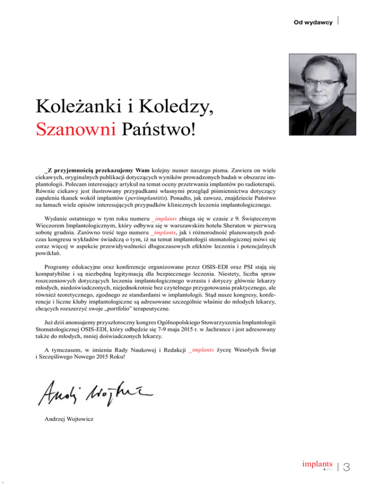 Od wydawcy Koleżanki i Koledzy, Szanowni Państwo! _Z przyjemnością przekazujemy Wam kolejny numer naszego pisma. Zawiera on wiele ciekawych, oryginalnych publikacji dotyczących wyników prowadzonych badań w obszarze implantologii. Polecam interesujący artykuł na temat oceny przetrwania implantów po radioterapii. Równie ciekawy jest ilustrowany przypadkami własnymi przegląd piśmiennictwa dotyczący zapalenia tkanek wokół implantów (periimplantitis). Ponadto, jak zawsze, znajdziecie Państwo na łamach wiele opisów interesujących przypadków klinicznych leczenia implantologicznego. Wydanie ostatniego w tym roku numeru _implants zbiega się w czasie z 9. Świątecznym Wieczorem Implantologicznym, który odbywa się w warszawskim hotelu Sheraton w pierwszą sobotę grudnia. Zarówno treść tego numeru _implants, jak i różnorodność planowanych podczas kongresu wykładów świadczą o tym, iż na temat implantologii stomatologicznej mówi się coraz więcej w aspekcie przewidywalności długoczasowych efektów leczenia i potencjalnych powikłań. Programy edukacyjne oraz konferencje organizowane przez OSIS-EDI oraz PSI stają się kompatybilne i są niezbędną legitymacją dla bezpiecznego leczenia. Niestety, liczba spraw roszczeniowych dotyczących leczenia implantologicznego wzrasta i dotyczy głównie lekarzy młodych, niedoświadczonych, niejednokrotnie bez czytelnego przygotowania praktycznego, ale również teoretycznego, zgodnego ze standardami w implantologii. Stąd nasze kongresy, konferencje i liczne kluby implantologiczne są adresowane szczególnie właśnie do młodych lekarzy, chcących rozszerzyć swoje „portfolio” terapeutyczne. Już dziś anonsujemy przyszłoroczny kongres Ogólnopolskiego Stowarzyszenia Implantologii Stomatologicznej OSIS-EDI, który odbędzie się 7-9 maja 2015 r. w Jachrance i jest adresowany także do młodych, mniej doświadczonych lekarzy. A tymczasem, w imieniu Rady Naukowej i Redakcji _implants życzę Wesołych Świąt i Szczęśliwego Nowego 2015 Roku! Andrzej Wojtowicz implants 4_2014 3