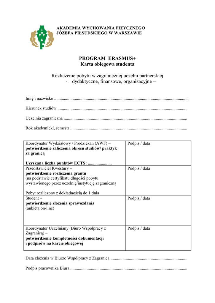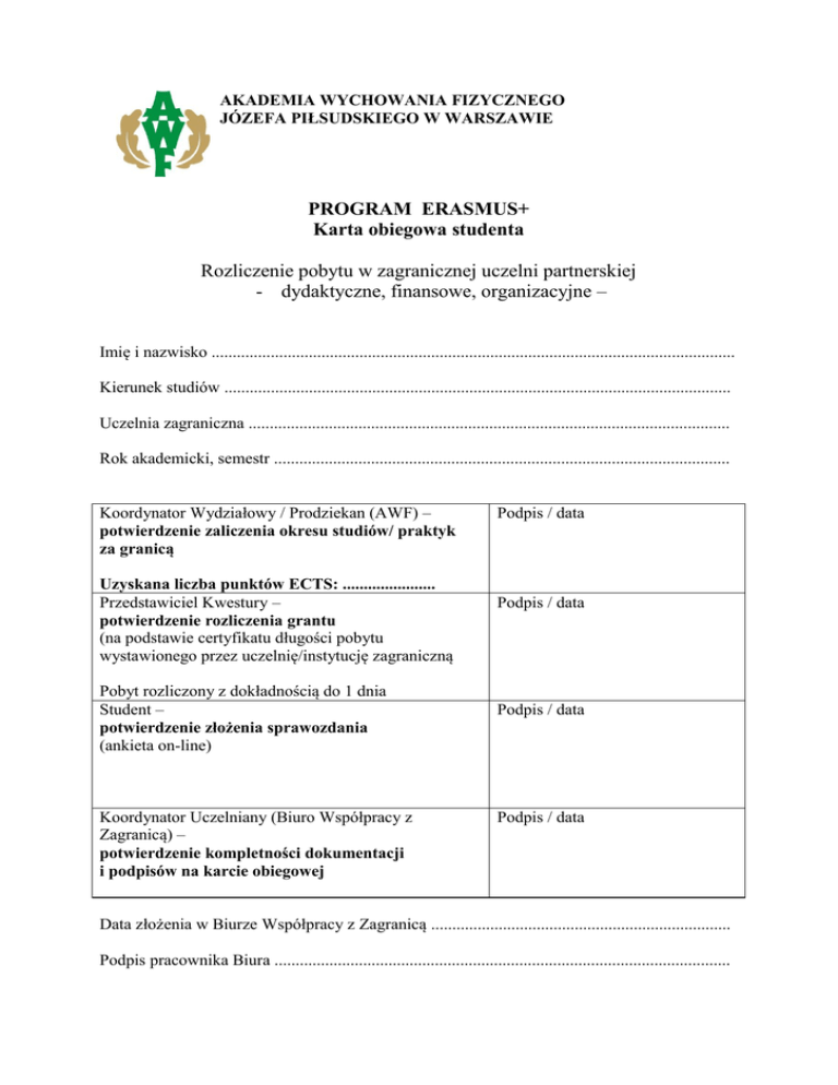 AKADEMIA WYCHOWANIA FIZYCZNEGO JÓZEFA PIŁSUDSKIEGO W WARSZAWIE PROGRAM ERASMUS+ Karta obiegowa studenta Rozliczenie pobytu w zagranicznej uczelni partnerskiej - dydaktyczne, finansowe, organizacyjne – Imię i nazwisko ............................................................................................................................ Kierunek studiów ........................................................................................................................ Uczelnia zagraniczna .................................................................................................................. Rok akademicki, semestr ............................................................................................................ Koordynator Wydziałowy / Prodziekan (AWF) – potwierdzenie zaliczenia okresu studiów/ praktyk za granicą Uzyskana liczba punktów ECTS: ...................... Przedstawiciel Kwestury – potwierdzenie rozliczenia grantu (na podstawie certyfikatu długości pobytu wystawionego przez uczelnię/instytucję zagraniczną Pobyt rozliczony z dokładnością do 1 dnia Student – potwierdzenie złożenia sprawozdania (ankieta on-line) Koordynator Uczelniany (Biuro Współpracy z Zagranicą) – potwierdzenie kompletności dokumentacji i podpisów na karcie obiegowej Podpis / data Podpis / data Podpis / data Podpis / data Data złożenia w Biurze Współpracy z Zagranicą ....................................................................... Podpis pracownika Biura ............................................................................................................
