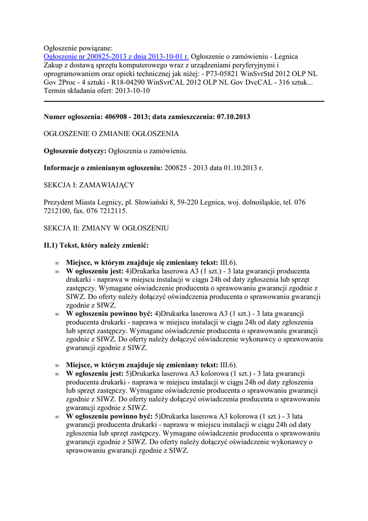Ogłoszenie powiązane: Ogłoszenie nr 200825-2013 z dnia 2013-10-01 r. Ogłoszenie o zamówieniu - Legnica Zakup z dostawą sprzętu komputerowego wraz z urządzeniami peryferyjnymi i oprogramowaniem oraz opieki technicznej jak niŜej: - P73-05821 WinSvrStd 2012 OLP NL Gov 2Proc - 4 sztuki - R18-04290 WinSvrCAL 2012 OLP NL Gov DvcCAL - 316 sztuk... Termin składania ofert: 2013-10-10 Numer ogłoszenia: 406908 - 2013; data zamieszczenia: 07.10.2013 OGŁOSZENIE O ZMIANIE OGŁOSZENIA Ogłoszenie dotyczy: Ogłoszenia o zamówieniu. Informacje o zmienianym ogłoszeniu: 200825 - 2013 data 01.10.2013 r. SEKCJA I: ZAMAWIAJĄCY Prezydent Miasta Legnicy, pl. Słowiański 8, 59-220 Legnica, woj. dolnośląskie, tel. 076 7212100, fax. 076 7212115. SEKCJA II: ZMIANY W OGŁOSZENIU II.1) Tekst, który naleŜy zmienić: • • • • • • Miejsce, w którym znajduje się zmieniany tekst: III.6). W ogłoszeniu jest: 4)Drukarka laserowa A3 (1 szt.) - 3 lata gwarancji producenta drukarki - naprawa w miejscu instalacji w ciągu 24h od daty zgłoszenia lub sprzęt zastępczy. Wymagane oświadczenie producenta o sprawowaniu gwarancji zgodnie z SIWZ. Do oferty naleŜy dołączyć oświadczenia producenta o sprawowaniu gwarancji zgodnie z SIWZ. W ogłoszeniu powinno być: 4)Drukarka laserowa A3 (1 szt.) - 3 lata gwarancji producenta drukarki - naprawa w miejscu instalacji w ciągu 24h od daty zgłoszenia lub sprzęt zastępczy. Wymagane oświadczenie producenta o sprawowaniu gwarancji zgodnie z SIWZ. Do oferty naleŜy dołączyć oświadczenie wykonawcy o sprawowaniu gwarancji zgodnie z SIWZ. Miejsce, w którym znajduje się zmieniany tekst: III.6). W ogłoszeniu jest: 5)Drukarka laserowa A3 kolorowa (1 szt.) - 3 lata gwarancji producenta drukarki - naprawa w miejscu instalacji w ciągu 24h od daty zgłoszenia lub sprzęt zastępczy. Wymagane oświadczenie producenta o sprawowaniu gwarancji zgodnie z SIWZ. Do oferty naleŜy dołączyć oświadczenia producenta o sprawowaniu gwarancji zgodnie z SIWZ. W ogłoszeniu powinno być: 5)Drukarka laserowa A3 kolorowa (1 szt.) - 3 lata gwarancji producenta drukarki - naprawa w miejscu instalacji w ciągu 24h od daty zgłoszenia lub sprzęt zastępczy. Wymagane oświadczenie producenta o sprawowaniu gwarancji zgodnie z SIWZ. Do oferty naleŜy dołączyć oświadczenie wykonawcy o sprawowaniu gwarancji zgodnie z SIWZ.