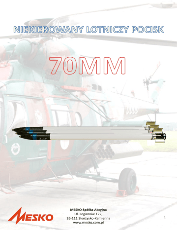 MESKO Spółka Akcyjna Ul. Legionów 122, 26-111 Skarżysko-Kamienna www.mesko.com.pl 1 PRZEZNACZENIE PRODUKTU 70 mm niekierowany pocisk rakietowy przeznaczony jest do zwalczania szerokiego zakresu celów nawodnych i naziemnych, w tym statków, lekko opancerzonych pojazdów i infrastruktury. PODSTAWOWE DANE I PARAMETRY TECHNICZNE Części składowe pocisku NLPR-70: • głowica bojowa RA 79 HEISAP MODA1 lub RA 79 HEISAP • zapalnik odłamkowo-burzący Nordic Ammunition Company Nammo; • układ napędowy z dwubazowym paliwem rakietowym produkcji MESKO S.A. Masa pocisku Masa głowicy bojowej Długośd pocisku 11,6 kg 6,015 kg 1360 ÷ 1362,5 mm Prędkośd początkowa pocisku Prędkośd maksymalna V0 ≥ 45 m/s Vmax = 650 m/s Zasięg skutecznego działania Zasięg minimalny Zasięg balistyczny (kąt rzutu 43°) ≥ 2000 m 400 m LB ≥ 10,2 km Maksymalne ciśnienie w komorze spalania układu napędowego: Pmax.najw. 15,5 MPa MESKO Spółka Akcyjna Ul. Legionów 122, 26-111 Skarżysko-Kamienna www.mesko.com.pl 2 MESKO Spółka Akcyjna Ul. Legionów 122, 26-111 Skarżysko-Kamienna www.mesko.com.pl 3 NSN (NATO STOCK NUMBER) 1340 43 000 9664 PRZEZNACZENIE PRODUKTU 122 mm pocisk rakietowy M-21 FHE „Feniks” jest przeznaczony do przenoszenia głowic odłamkowoburzących na odległośd do 42km. Odległośd strzelania 122mm pociskami z głowicami odłamkowo-burzącymi ustalana jest kątem podniesienia wyrzutni oraz poprzez stosowanie pierścieni hamujących. Jego głównym zadaniem jest niszczenie umocnieo, sprzętu wojskowego oraz siły żywej. 122 mm pocisk rakietowy M-21 FHE „Feniks” może byd wystrzeliwany z następujących wyrzutni: BM-21; RM-70; WR-40 Langusta. PODSTAWOWE DANE I PARAMETRY TECHNICZNE Części składowe pocisku: • silnik rakietowy; • głowica odłamkowo-burząca.; • zapalnik MRW-U/T. Masa zaelaborowanego pocisku Długośd pocisku z zapalnikiem MRW-U/T Maksymalna donośnośd pocisku Minimalna donośnośd pocisku Prędkośd maksymalna pocisku 60,9 ± 0,7 kg 2690 mm 42 km 14 km 1250 m/s MESKO Spółka Akcyjna Ul. Legionów 122, 26-111 Skarżysko-Kamienna www.mesko.com.pl 4