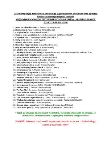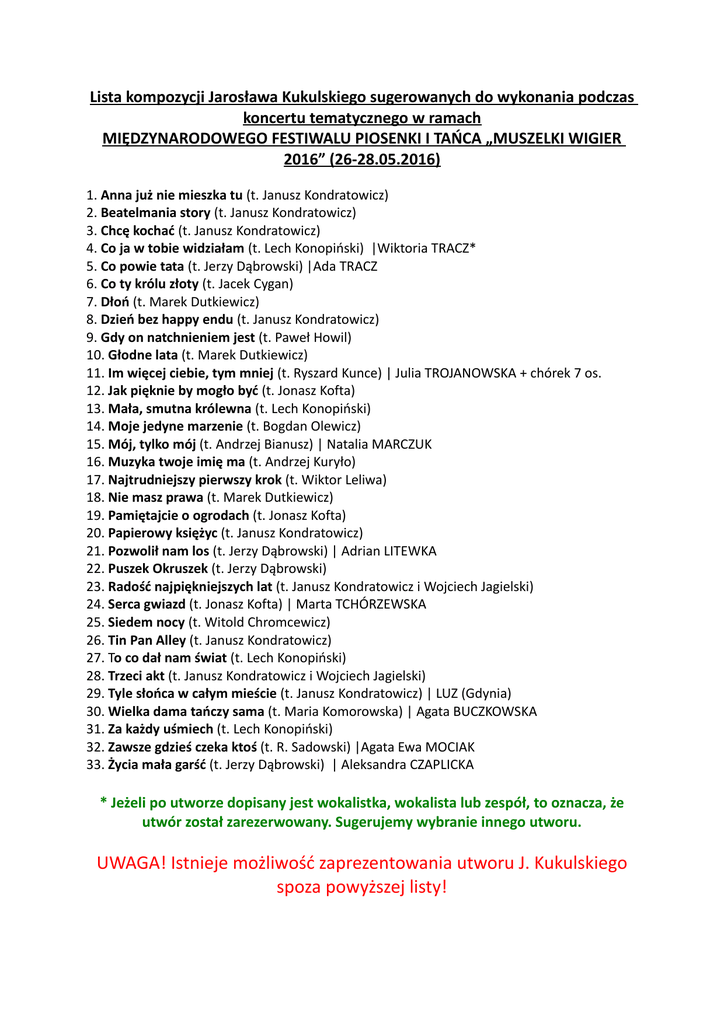 Lista kompozycji Jarosława Kukulskiego sugerowanych do wykonania podczas koncertu tematycznego w ramach MIĘDZYNARODOWEGO FESTIWALU PIOSENKI I TAŃCA „MUSZELKI WIGIER 2016” (26-28.05.2016) 1. Anna już nie mieszka tu (t. Janusz Kondratowicz) 2. Beatelmania story (t. Janusz Kondratowicz) 3. Chcę kochać (t. Janusz Kondratowicz) 4. Co ja w tobie widziałam (t. Lech Konopiński) |Wiktoria TRACZ* 5. Co powie tata (t. Jerzy Dąbrowski) |Ada TRACZ 6. Co ty królu złoty (t. Jacek Cygan) 7. Dłoń (t. Marek Dutkiewicz) 8. Dzień bez happy endu (t. Janusz Kondratowicz) 9. Gdy on natchnieniem jest (t. Paweł Howil) 10. Głodne lata (t. Marek Dutkiewicz) 11. Im więcej ciebie, tym mniej (t. Ryszard Kunce) | Julia TROJANOWSKA + chórek 7 os. 12. Jak pięknie by mogło być (t. Jonasz Kofta) 13. Mała, smutna królewna (t. Lech Konopiński) 14. Moje jedyne marzenie (t. Bogdan Olewicz) 15. Mój, tylko mój (t. Andrzej Bianusz) | Natalia MARCZUK 16. Muzyka twoje imię ma (t. Andrzej Kuryło) 17. Najtrudniejszy pierwszy krok (t. Wiktor Leliwa) 18. Nie masz prawa (t. Marek Dutkiewicz) 19. Pamiętajcie o ogrodach (t. Jonasz Kofta) 20. Papierowy księżyc (t. Janusz Kondratowicz) 21. Pozwolił nam los (t. Jerzy Dąbrowski) | Adrian LITEWKA 22. Puszek Okruszek (t. Jerzy Dąbrowski) 23. Radość najpiękniejszych lat (t. Janusz Kondratowicz i Wojciech Jagielski) 24. Serca gwiazd (t. Jonasz Kofta) | Marta TCHÓRZEWSKA 25. Siedem nocy (t. Witold Chromcewicz) 26. Tin Pan Alley (t. Janusz Kondratowicz) 27. To co dał nam świat (t. Lech Konopiński) 28. Trzeci akt (t. Janusz Kondratowicz i Wojciech Jagielski) 29. Tyle słońca w całym mieście (t. Janusz Kondratowicz) | LUZ (Gdynia) 30. Wielka dama tańczy sama (t. Maria Komorowska) | Agata BUCZKOWSKA 31. Za każdy uśmiech (t. Lech Konopiński) 32. Zawsze gdzieś czeka ktoś (t. R. Sadowski) |Agata Ewa MOCIAK 33. Życia mała garść (t. Jerzy Dąbrowski) | Aleksandra CZAPLICKA * Jeżeli po utworze dopisany jest wokalistka, wokalista lub zespół, to oznacza, że utwór został zarezerwowany. Sugerujemy wybranie innego utworu. UWAGA! Istnieje możliwość zaprezentowania utworu J. Kukulskiego spoza powyższej listy!
