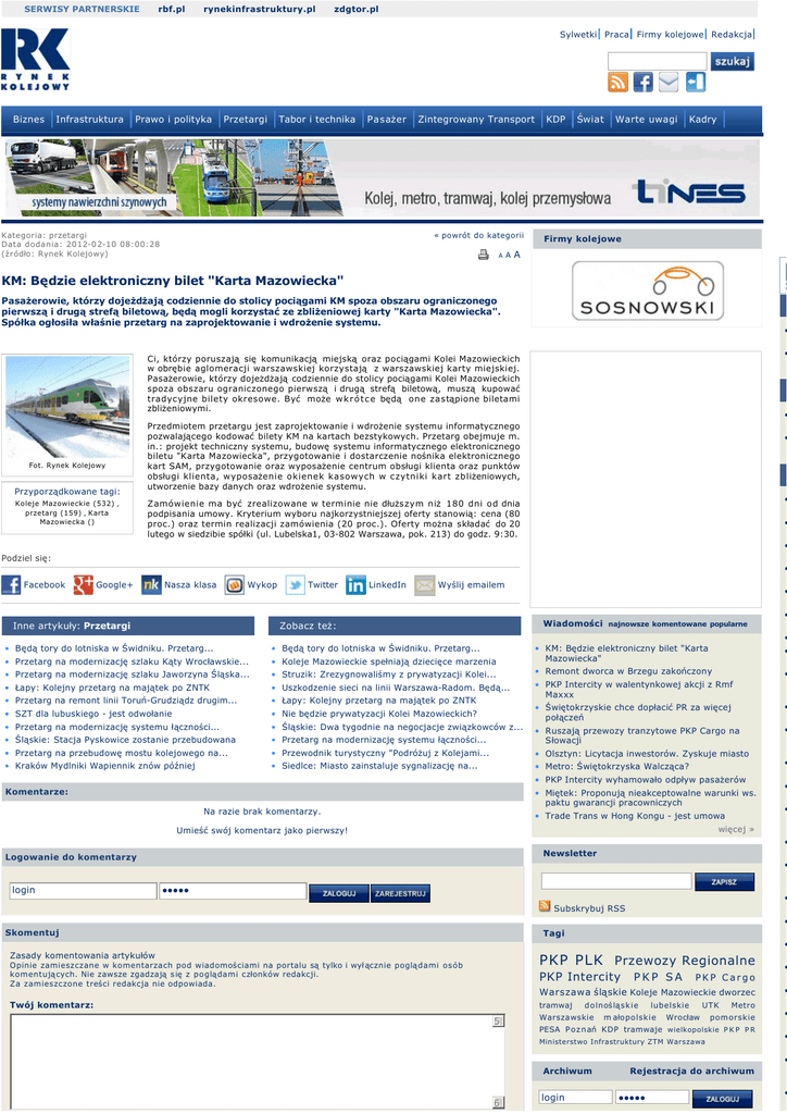 SERWISY PARTNERSKIE rbf.pl rynekinfrastruktury.pl zdgtor.pl Sylwetki Praca Firmy kolejowe Redakcja Biznes Infrastruktura Prawo i polityka Przetargi Tabor i technika Pasażer Kategoria: przetargi Data dodania: 2012-0 2-10 08:00:28 (źródło: Rynek Kolejowy) Zintegrowany Transport « powrót do kategorii A A KDP Warte uwagi Świat Kadry Firmy kolejowe A KM: Będzie elektroniczny bilet "Karta Mazowiecka" Pasażerowie, którzy dojeżdżają codziennie do stolicy pociągami KM spoza obszaru ograniczonego pierwszą i drugą strefą biletową, będą mogli korzystać ze zbliżeniowej karty "Karta Mazowiecka". Spółka ogłosiła właśnie przetarg na zaprojektowanie i wdrożenie systemu. P • • Ci, którzy poruszają się komunikacją miejską oraz pociągami Kolei Mazowieckich w obrębie aglomeracji warszawskiej korzystają z warszawskiej karty miejskiej. Pasażerowie, którzy dojeżdżają codziennie do stolicy pociągami Kolei Mazowieckich spoza obszaru ograniczonego pierwszą i drugą strefą biletową, muszą kupować tradycyjne bilety okresowe. Być może w k r ó t c e będą one zastąpione biletami zbliżeniowymi. Fot. Rynek Kolejowy Przyporządkowane tagi: Koleje Mazowieckie (532) , przetarg (159) , Karta Mazowiecka () K • Przedmiotem przetargu jest zaprojektowanie i wdrożenie systemu informatycznego pozwalającego kodować bilety KM na kartach bezstykowych. Przetarg obejmuje m. in.: projekt techniczny systemu, budowę systemu informatycznego elektronicznego biletu "Karta Mazowiecka", przygotowanie i dostarczenie nośnika elektronicznego kart SAM, przygotowanie oraz wyposażenie centrum obsługi klienta oraz punktów obsługi klienta, wyposażenie okienek kasowych w czytniki kart zbliżeniowych, utworzenie bazy danych oraz wdrożenie systemu. • N • Zamówienie ma być zrealizowane w terminie nie dłuższym niż 180 dni od dnia podpisania umowy. Kryterium wyboru najkorzystniejszej oferty stanowią: cena (80 proc.) oraz termin realizacji zamówienia (20 proc.). Oferty można składać do 20 lutego w siedzibie spółki (ul. Lubelska1, 03-802 Warszawa, pok. 213) do godz. 9:30. • • Podziel się: • Facebook Google+ Nasza klasa Wykop Twitter LinkedIn Wyślij emailem • • Inne artykuły: Przetargi Wiadomości najnowsze komentowane popularne Zobacz też: • • Będą tory do lotniska w Świdniku. Przetarg... • Będą tory do lotniska w Świdniku. Przetarg... • • Koleje Mazowieckie spełniają dziecięce marzenia • KM: Będzie elektroniczny bilet "Karta Mazowiecka" • Przetarg na modernizację szlaku Kąty Wrocławskie... • Przetarg na modernizację szlaku Jaworzyna Śląska... • Struzik: Zrezygnowaliśmy z prywatyzacji Kolei... • Remont dworca w Brzegu zakończony • • Łapy: Kolejny przetarg na majątek po ZNTK • Uszkodzenie sieci na linii Warszawa-Radom. Będą... • Przetarg na remont linii Toruń-Grudziądz drugim... • Łapy: Kolejny przetarg na majątek po ZNTK • PKP Intercity w walentynkowej akcji z Rmf Maxxx • SZT dla lubuskiego - jest odwołanie • Nie będzie prywatyzacji Kolei Mazowieckich? • Przetarg na modernizację systemu łączności... • Śląskie: Dwa tygodnie na negocjacje związkowców z... • Śląskie: Stacja Pyskowice zostanie przebudowana • Świętokrzyskie chce dopłacić PR za więcej połączeń • • Ruszają przewozy tranzytowe PKP Cargo na Słowacji • • Przetarg na modernizację systemu łączności... • Przetarg na przebudowę mostu kolejowego na... • Przewodnik turystyczny "Podróżuj z Kolejami... • Olsztyn: Licytacja inwestorów. Zyskuje miasto • Kraków Mydlniki Wapiennik znów później • Siedlce: Miasto zainstaluje sygnalizację na... • Metro: Świętokrzyska Walcząca? • • PKP Intercity wyhamowało odpływ pasażerów Komentarze: • Miętek: Proponują nieakceptowalne warunki ws. paktu gwarancji pracowniczych Na razie brak komentarzy. • Trade Trans w Hong Kongu - jest umowa • więcej » Umieść swój komentarz jako pierwszy! • Newsletter Logowanie do komentarzy login • • ●●●●● • Subskrybuj RSS • Skomentuj Tagi • Zasady komentowania artykułów PKP PLK Przewozy Regionalne Opinie zamieszczane w komentarzach pod wiadomościami na portalu są tylko i wył ącznie poglądami osób komentujących. Nie zawsze zgadzają s ię z poglądami członków redakcji. Za zamieszczone treści redakcja nie odpowiada. PKP Intercity PKP SA Warszawa śląskie Koleje Mazowieckie dworzec Twój komentarz: tramwaj 5 dolnośląs k i e Warszawskie lubelskie m ałopolskie • PKP Cargo UTK Wrocław • Metro pomorskie PESA P o z n ań KDP tramwaje wielkopolskie P K P P R Ministerstwo Infrastruktury ZTM Warszawa • • • Archiwum 6 login Rejestracja do archiwum ●●●●● • Wpisz kod z obrazka: Autor: przypomnij hasło • • • Fotorelacje • • K 8 0-lecie WKD/EKD Transport Traxxów dla ITL Z a kłady EKK Wagon W i e d eńskie tramwaje P ię trusy przekazane Kolejom... • • Reklama w portalu | Reklama w miesię czniku | Miesię cznik Rynek Kolejowy | Prenumerata | Empik | Archiwum | Redakcja Wydawnictwo Rynek Kolejowy O wydawnictwie |Nasze portale |Konferencje |Pozostałe usługi Portal Rynek Kolejowy Biznes |Infrastruktura |Prawo i Polityka |Przetargi |Tabor i technika |Pasażer | Zintegrowany Transport |KDP |Świat |Warte uwagi |Kadry |Video |Euro 2012 | II Linia metra |Praca |Katalog Firm |Reklama Miesięcznik "Rynek Kolejowy" O miesięczniku |Prenumerata |Empik |Reklama |Dla Autorów |Felietoniści | Patronaty |Redakcja W najnowszym numerze W nowej odsłonie ukazał się najnowszy numer "Rynku Kolejowego". Serdecznie zapraszamy do sklepów Empik i do zaprenumerowania miesięcznika. Tematem przewodnim jest polskie cargo w Unii Europejskiej. W numerze znajdziecie też wiele cennych informacji dotyczących nowego rozkładu jazdy, inwestycji kolejowych prowadzonych wPolsce, a także konsekwencji zamrożenia budowy KDP w Polsce. Paprocki: Skradzione marzenia Kolej