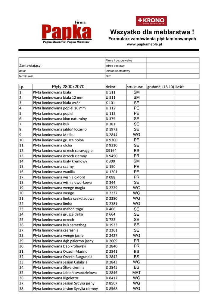 Wszystko dla meblarstwa ! Formularz zamówienia płyt laminowanych www.papkameble.pl Firma / os. prywatna Zamawiający: adres dostawy: data: telefon kontaktowy termin real. NIP Lp. 1. 2. 3. 4. 5. 6. 7. 8. 9. 10. 11. 12. 13. 14. 15. 16. 17. 18. 19. 20. 21. 22. 23. 24. 25. 26. 27. 28. 29. 30. 31. 32. 33. 34. 35. 36. 37. 38. Płyty 2800x2070: Płyta laminowana biała Płyta laminowana biała 12 mm Płyta laminowana biała wzór Płyta laminowana popiel 16 mm Płyta laminowana popiel Płyta laminowana klon naturalny Płyta laminowana buk Płyta laminowana jabłoń locarno Płyta laminowana Malibu Płyta laminowana grusza polna Płyta laminowana olcha Płyta laminowana orzech caravaggio Płyta laminowana orzech ciemny Płyta laminowana biały kremowy Płyta laminowana czarny Płyta laminowana wanilia Płyta laminowana wiśnia oxford Płyta laminowana wiśnia dworkowa Płyta laminowana wenge magia Płyta laminowana wenge Płyta laminowana limba czekoladowa Płyta laminowana limba Płyta laminowana mahoń togo Płyta laminowana grusza dzika Płyta laminowana orzech Płyta laminowana buk samerbeg Płyta laminowana czereśnia Płyta laminowana wenge jasne Płyta laminowana dąb palermo jasny Płyta laminowana Dąb królewski Płyta laminowana Orzech Marino Płyta laminowana Orzech Burgundia Płyta laminowana Jesion Calabria Płyta laminowana Śliwa ciemna Płyta laminowana Jabłoń twardzielowa Płyta laminowana Rigoletto Płyta laminowana Jesion Sycylia jasny Płyta laminowana Jesion Sycylia ciemny dekor: U 511 U 511 K 101 U 112 U 112 D 375 D 381 D 1972 D 2844 D 9300 D 9310 D9164 D 9450 K 300 U 190 U 1301 D 088 D 344 D 2229 D 2227 D 2380 D 2381 D 466 D 664 D 722 D 1923 D 2361 D 2427 D 2609 D 2840 D 2841 D 2842 D 2843 D 2845 D 2846 D 8417 D 8567 D 8568 struktura: SM SM SE PE PE SE SE SE WG PE SE BS PR SM PE PE PR SE WG WG WG WG SE SE SE SE SE WG PR PR BS BS WG BS MAT WG WG WG grubość: (18,10) ilość: 39. 40. 41. 42. 43. 44. 45. 46. 47. 48. 49. 50. 51. 52. 53. 54. 55. 56. 57. 58. 59. 60. 61. 62. 63. 64. 65. 66. 67. 68. 69. 70. 71. 72. 73. 74. 75. 76. 77. 78. 79. 80. 81. 82. 83. 84. 85. 86. 87. 88. Płyta laminowana śliwka węgierka Płyta laminowana orzech ecco Płyta laminowana jabłoń locarno jasna Płyta laminowana jabłoń goldos Płyta laminowana klon vancouver jasny Płyta laminowana grusza polna ciemna Płyta laminowana buk rotkern Płyta laminowana trawa morska Płyta laminowana wiśnia antyczna Płyta laminowana sosna antyczna Płyta laminowana dąb antyczny Płyta laminowana klon biały Płyta laminowana jesion messina Płyta laminowana orzech milano Płyta laminowana oliwka Płyta laminowana akacja Płyta laminowana dąb mleczny Płyta laminowana eliza Płyta laminowana dąb jasny Płyta laminowana mahoń Płyta laminowana zebrano afrykańskie Płyta laminowana zebrano ciemne Płyta laminowana macassar Płyta laminowana orzech toksania Płyta laminowana jabłoń torino Płyta laminowana royal Płyta laminowana śliwka Płyta laminowana dąb palermo ciemny Płyta laminowana kwiaty Płyta laminowana orzech california Płyta laminowana orzech california ciemny Płyta laminowana dąb jasny Płyta laminowana dąb windsor jasny Płyta laminowana dąb windsor ciemny Płyta laminowana buk bawaria Płyta laminowana buk mangfall jasny Płyta laminowana klon vancouver Płyta laminowana orzech bologna Płyta laminowana terra żółta Płyta laminowana metalik Płyta laminowana beż jasny Płyta laminowana niebieski jasny Płyta laminowana zielony Płyta laminowana oliwkowy Płyta laminowana jesion nokturn Płyta laminowana jesion etiuda Płyta laminowana jesion preludium Płyta laminowana jesion sonata Płyta laminowana jesion rapsodia Płyta laminowana jesion suita D 8880 D9163 D 9475 D 9476 D 440 D1625 D 2201 D 2298 D 2360 D2387 D2419 D 2460 D 2605 D 2611 D 2715 D7780 D9116 D 495 D 740 D 775 D 2296 D 2297 D2446 D2453 D 2606 D 2607 D 2608 D 2610 D 2612 D 2713 D 2714 D 9103 D 9118 D 9119 D 9200 D 9201 D 9352 D 9451 D 9610 D 881 U 119 U 121 U155 D 2724 D 2030 D 2039 D 2040 D 2041 D 2042 D 2043 BS BS SE BS SE PE SE MT BS PR PR MT MT BS BS PR SE PE SE SE MT WG SM BS BS SM BS PR SM BS BS PR SE SE PR PR SE SE PE PE PE PE PE PE SJ SJ SJ SJ SJ SJ