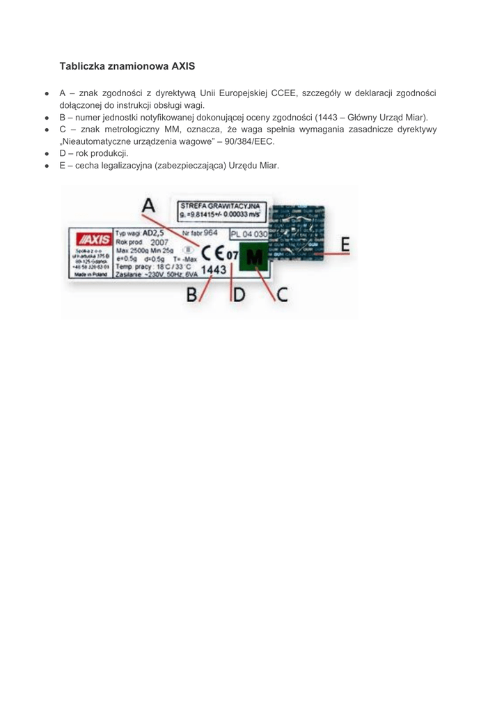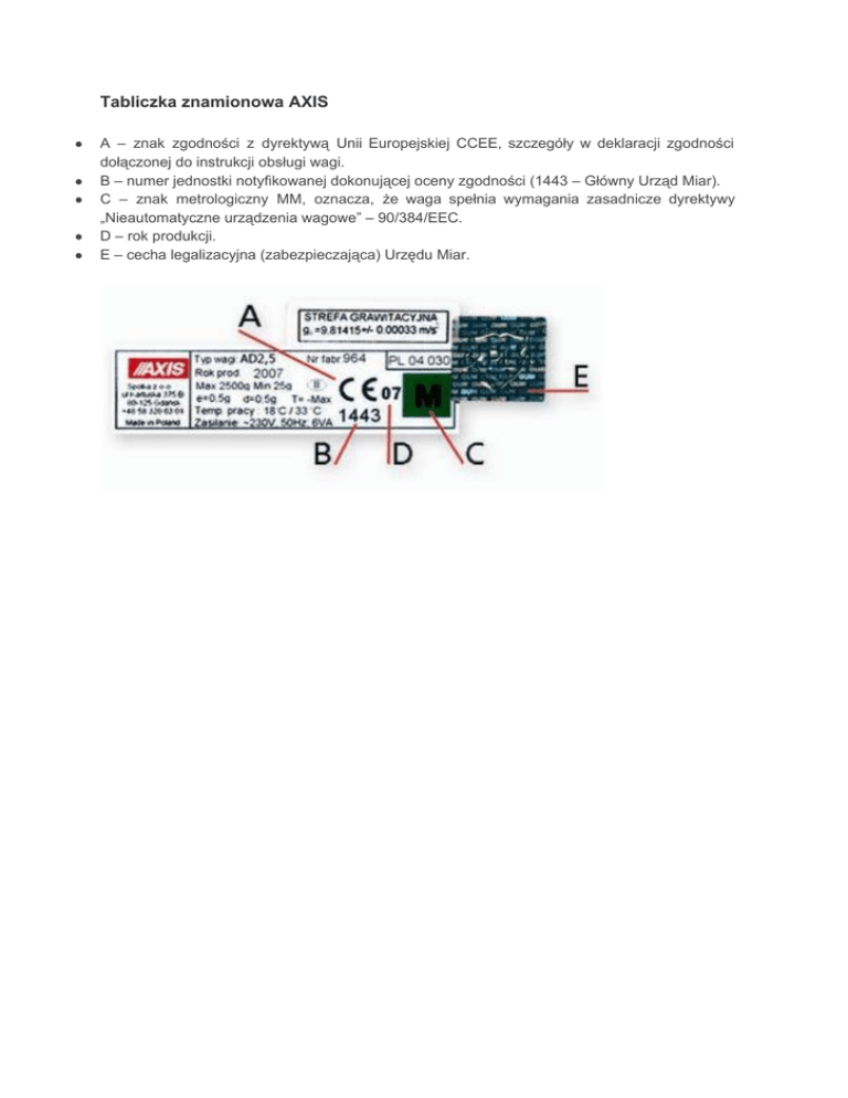 Tabliczka znamionowa AXIS ● ● ● ● ● A – znak zgodności z dyrektywą Unii Europejskiej CCEE, szczegóły w deklaracji zgodności dołączonej do instrukcji obsługi wagi. B – numer jednostki notyfikowanej dokonującej oceny zgodności (1443 – Główny Urząd Miar). C – znak metrologiczny MM, oznacza, że waga spełnia wymagania zasadnicze dyrektywy „Nieautomatyczne urządzenia wagowe” – 90/384/EEC. D – rok produkcji. E – cecha legalizacyjna (zabezpieczająca) Urzędu Miar.