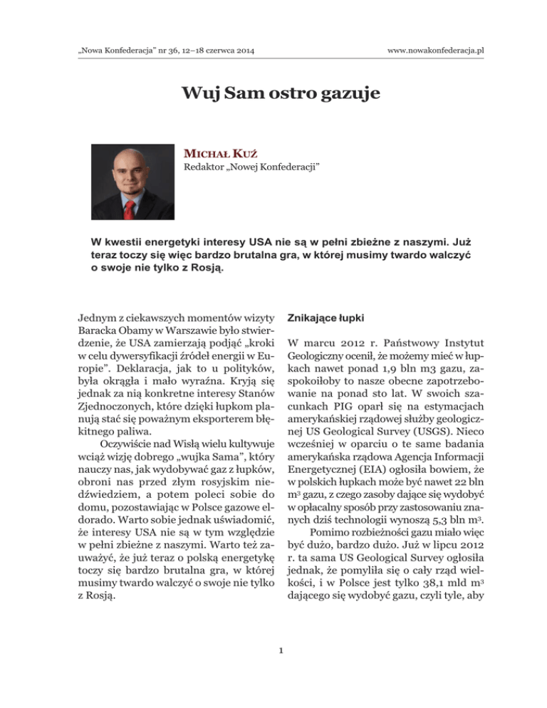 „Nowa Konfederacja” nr 36, 12–18 czerwca 2014 www.nowakonfederacja.pl Wuj Sam ostro gazuje Michał Kuź Redaktor „Nowej Konfederacji” W kwestii energetyki interesy USA nie są w pełni zbieżne z naszymi. Już teraz toczy się więc bardzo brutalna gra, w której musimy twardo walczyć o swoje nie tylko z Rosją. Znikające łupki Jednym z ciekawszych momentów wizyty Baracka Obamy w Warszawie było stwierdzenie, że USA zamierzają podjąć „kroki w celu dywersyfikacji źródeł energii w Europie”. Deklaracja, jak to u polityków, była okrągła i mało wyraźna. Kryją się jednak za nią konkretne interesy Stanów Zjednoczonych, które dzięki łupkom planują stać się poważnym eksporterem błękitnego paliwa. Oczywiście nad Wisłą wielu kultywuje wciąż wizję dobrego „wujka Sama”, który nauczy nas, jak wydobywać gaz z łupków, obroni nas przed złym rosyjskim niedźwiedziem, a potem poleci sobie do domu, pozostawiając w Polsce gazowe eldorado. Warto sobie jednak uświadomić, że interesy USA nie są w tym względzie w pełni zbieżne z naszymi. Warto też zauważyć, że już teraz o polską energetykę toczy się bardzo brutalna gra, w której musimy twardo walczyć o swoje nie tylko z Rosją. W marcu 2012 r. Państwowy Instytut Geologiczny ocenił, że możemy mieć w łupkach nawet ponad 1,9 bln m3 gazu, zaspokoiłoby to nasze obecne zapotrzebowanie na ponad sto lat. W swoich szacunkach PIG oparł się na estymacjach amerykańskiej rządowej służby geologicznej US Geological Survey (USGS). Nieco wcześniej w oparciu o te same badania amerykańska rządowa Agencja Informacji Energetycznej (EIA) ogłosiła bowiem, że w polskich łupkach może być nawet 22 bln m3 gazu, z czego zasoby dające się wydobyć w opłacalny sposób przy zastosowaniu znanych dziś technologii wynoszą 5,3 bln m3. Pomimo rozbieżności gazu miało więc być dużo, bardzo dużo. Już w lipcu 2012 r. ta sama US Geological Survey ogłosiła jednak, że pomyliła się o cały rząd wielkości, i w Polsce jest tylko 38,1 mld m3 dającego się wydobyć gazu, czyli tyle, aby 1 „Nowa Konfederacja” nr 36, 12–18 czerwca 2014 www.nowakonfederacja.pl pokryć polskie potrzeby na blisko 2,5 roku. Zdaniem prof. Andrzeja Kraszewskiego i wielu innych polskich ekspertów tak dużych rozbieżności nie da się tłumaczyć inaczej niż tym, że „informacje dotyczące zasobów gazu łupkowego podlegają marketingowi politycznemu i publikuje się takie dane, które mają przynieść określony efekt”. O jaki efekt chodzi? Cóż, chcąc coś kupić, np. polskie złoża, warto najpierw zaniżyć ich wartość. A chcąc coś sprzedawać, np. swój tworzący miejsca pracy w USA gaz, nie warto obniżać ceny produktu na globalnych rynkach. Stany Zjednoczone już teraz są zaś największym na świecie producentem błękitnego paliwa i jego ósmym eksporterem. Od kilku lat USA chcą zaś agresywnie zwiększyć swój udział w światowym rynku paliw. Już teraz powstaje sześć nowoczesnych gazoportów, które skroplone paliwo miałyby wysyłać na cały świat. Chevron pół roku temu podpisał zresztą memorandum w sprawie współpracy również z polskim PGNiG. W spółkach prowadzących poszukiwania gazu w Polsce widać też coraz większy wpływ mieszanego kapitału zagranicznego. George Soros ma np. aktywa aż 1/3 firm, które posiadają obecnie koncesję na wydobycie. Kiedy dwa lata temu z wydobycia łupków w Polsce wycofał się amerykański Exxon, USA uprawiały jeszcze rosyjski „reset”. Mogły więc zadecydować względy polityczne. Jak dość przytomnie zauważył Waldemar Pawlak, koncern miał poważne interesy w Federacji Rosyjskiej i krótko przed wycofaniem się z Polski zawarł strategiczny sojusz z Rostnieftem. Zajęcie Krymu zmieniło jednak znacząco klimat wokół łupków. Już w kwietniu tego roku Chevron rozpoczął więc kolejną turę poszukiwań gazu łupkowego w Rumunii. Przedtem zaś przy wsparciu rządu USA lobbował w Bukareszcie za zniesieniem moratorium na wydobycie. Co też naturalnie szybko uczyniono. Podatek od wydobycia wciąż zaś wynosi w Polsce tylko 1 proc., (20 proc. w USA). Więc inwestycje w polskie łupki są niezwykle kuszące pomimo sprzecznych sygnałów dotyczących dostępności złóż i ich jakości. Rząd wprawdzie pracuje nad zmianami opodatkowania eksploatacji polskich złóż, nie wiadomo jednak, kiedy miałyby one wejść w życie. Na razie zaś zarówno dla Polski, jak i dla Rumunii podstawowe pytanie brzmi: czy Chevron chce faktycznie nasze złoża eksploatować z korzyścią dla naszych gospodarek, czy tylko je kontrolować z korzyścią dla siebie? I czy niedojdzie do ponownych dramatycznych zmian strategii na tle politycznym? Stany Zjednoczone Po wizycie prezydenta Obamy o wydobyciu naszych łupków przy użyciu amerykańskich technologii jakoś się nie słyszy. Słyszy się za to, że już za trzy lata Polska może sprowadzać skroplony gaz z uSa Za, a nawet przeciw 2 „Nowa Konfederacja” nr 36, 12–18 czerwca 2014 www.nowakonfederacja.pl Niedobre są spółki są wszak obecnie w sytuacji podobnej do Rosji, są producentem. Co gorsza, nie ma gwarancji, że, jak sugeruje Jacek Bartosiak, na linii Waszyngton–Kreml nie dojdzie do kolejnego, wymierzonego w Chiny resetu. Swoistej „nowej Jałty”. Ciekawe jest np. to, że po wizycie prezydenta Obamy o wydobyciu naszych łupków przy użyciu amerykańskich technologii jakoś się nie słyszy. Słyszy się za to, że już za trzy lata Polska może sprowadzać skroplony gaz z USA. Okazuje się bowiem, że eksploatacja amerykańskich i kanadyjskich łupków jest na tyle korzystna, że nawet przy ogromnych kosztach transportu może on nadal mieć cenę konkurencyjną w stosunku do tej, którą oferują dziś Rosjanie. To naturalnie może zaś wymusić na Rosji obniżkę cen. Problem Polski polega jednak na tym, że wojny cenowe pomiędzy USA a Rosją mogą dla nas mieć tylko