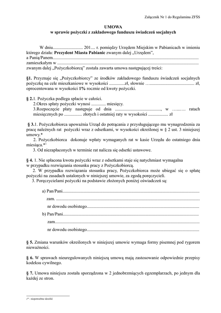 Załącznik Nr 1 do Regulaminu ZFŚS UMOWA w sprawie pożyczki z zakładowego funduszu świadczeń socjalnych W dniu........................... 201.... r. pomiędzy Urzędem Miejskim w Pabianicach w imieniu którego działa: Prezydent Miasta Pabianic zwanym dalej „Urzędem”, a Panią/Panem................................................................................................................................... zamieszkałym w ............................................................................................................................... zwanym dalej „Pożyczkobiorcą” została zawarta umowa następującej treści: §1. Przyznaje się „Pożyczkobiorcy” ze środków zakładowego funduszu świadczeń socjalnych pożyczkę na cele mieszkaniowe w wysokości ..............zł, słownie …........................................ zł, oprocentowana w wysokości 1% rocznie od kwoty pożyczki. § 2.1. Pożyczka podlega spłacie w całości. 2.Okres spłaty pożyczki wynosi ............. miesięcy. 3.Rozpoczęcie płaty następuje od dnia ........................................., w …...…. ratach miesięcznych po ................ złotych i ostatniej raty w wysokości .................. zł § 3.1. Pożyczkobiorca upoważnia Urząd do potrącania z przysługującego mu wynagrodzenia za pracę należnych rat pożyczki wraz z odsetkami, w wysokości określonej w § 2 ust. 3 niniejszej umowy.* 2. Pożyczkobiorca dokonuje wpłaty wymaganych rat w kasie Urzędu do ostatniego dnia miesiąca.*1 3. Od niezapłaconych w terminie rat nalicza się odsetki ustawowe. § 4. 1. Nie spłacona kwota pożyczki wraz z odsetkami staje się natychmiast wymagalna w przypadku rozwiązania stosunku pracy z Pożyczkobiorcą. 2. W przypadku rozwiązania stosunku pracy, Pożyczkobiorca może ubiegać się o spłatę pożyczki na zasadach ustalonych w niniejszej umowie, za zgodą poręczycieli. 3. Poręczycielami pożyczki na podstawie złożonych poniżej oświadczeń są: a) Pan/Pani........................................................................................................................... zam. ................................................................................................................................. nr dowodu osobistego..................................................................................................... b) Pan/Pani.......................................................................................................................... zam.................................................................................................................................. nr dowodu osobistego..................................................................................................... § 5. Zmiana warunków określonych w niniejszej umowie wymaga formy pisemnej pod rygorem nieważności. § 6. W sprawach nieuregulowanych niniejszą umową mają zastosowanie odpowiednie przepisy kodeksu cywilnego. § 7. Umowa niniejsza została sporządzona w 2 jednobrzmiących egzemplarzach, po jednym dla każdej ze stron. 1* - niepotrzebne skreślić Oświadczenia poręczycieli Oświadczamy, że w razie nieuregulowania w terminie pożyczki zaciągniętej przez Pożyczkobiorcę ze środków ZFŚS wyrażamy zgodę jako wspólnie odpowiedzialni za pokrycie należnej kwoty wraz z odsetkami. a) .......................................... podpis poręczyciela b) ......................................... podpis poręczyciela ........................................ Pożyczkobiorca Stwierdzam własnoręczność podpisów Pożyczkobiorcy i poręczycieli. ............................................................ data, podpis i pieczęć pracownika ds. socjalnych Zapisy umowy zgodne z wnioskiem. ........................................................ data, pieczęć Komisji i podpisy ..................................................... Urząd Załącznik Nr 2 do Regulaminu ZFŚS ................................................................... (nazwisko i imię) ................................................................... (adres zamieszkania) …............................................................... (nr telefonu) KOMISJA ZAKŁADOWEGO FUNDUSZU ŚWIADCZEŃ SOCJALNYCH przy Urzędzie Miejskim w Pabianicach WNIOSEK O KORZYSTANIE ZE ŚWIADCZEŃ Z ZAKŁADOWEGO FUNDUSZU ŚWIADCZEŃ SOCJALNYCH. (ZFŚS) Zwracam się z prośbą o umożliwienie mi korzystania ze świadczeń ZFŚS przy Urzędzie Miejskim w Pabianicach . Oświadczam, że od dnia .............................. przebywam na zasiłku przedemerytalnym oraz, że ostatnim moim miejscem pracy był Urząd Miejski w Pabianicach. ................................................. ..... (podpis wnioskodawcy) Wniosek przyjęto dnia ...................................... ...................................................... (podpis pracownika ds. socjalnych) Komisja Zakładowego Funduszu Świadczeń Socjalnych na posiedzeniu dniu................................. dopisała wnioskodawcę do listy osób uprawnionych do korzystania z Funduszu. Pieczęć i podpisy Komisji: w Załącznik Nr 3 do Regulaminu ZFŚS ZFŚS.2410.5. ............ . 201...... …....................... ….................... (data wpływu) (podpis) KPM-III.2410. ..... . ............ . 201...... -------------------------------------------------------------------------------------------------------------------------------------------- A. Wniosek o dofinansowanie wypoczynku (wypełnia wnioskodawca) Pabianice, dnia ...............201.....r. ............................................................................ (imię i nazwisko wnioskodawcy) ......................................./...................................... (komórka organizacyjna Urzędu /telefon kontaktowy) .............................................../............................ (data zatrudnienia / wielkość etatu ) KOMISJA ZAKŁADOWEGO FUNDUSZU ŚWIADC