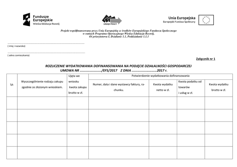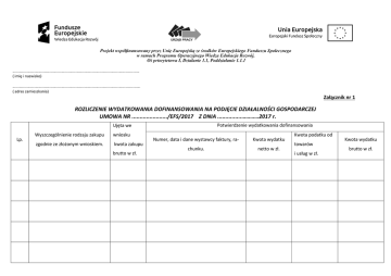 …………………………………………………………………………………………………………………… ( imię i nazwisko) ……………………………………………………………………………………………………………………. ( adres zamieszkania) Załącznik nr 1 ROZLICZENIE WYDATKOWANIA DOFINANSOWANIA NA PODJĘCIE DZIAŁALNOŚCI GOSPODARCZEJ UMOWA NR ....................../EFS/2017 Z DNIA ...............…………2017 r. Potwierdzenie wydatkowania dofinansowania Ujęta we Lp. Wyszczególnienie rodzaju zakupu wniosku zgodnie ze złożonym wnioskiem. kwota zakupu brutto w zł. Numer, data i dane wystawcy faktury, ra- Kwota wydatku chunku. netto w zł. Kwota podatku od towarów i usług w zł. Kwota wydatku brutto w zł. Razem wydatki: Oświadczam, iż przysługuje / nie przysługuje* mi prawo do obniżenia kwoty podatku należnego o kwotę podatku naliczonego zawartego w wykazanych wydatkach lub prawo do zwrotu podatku naliczonego. *niepotrzebne skreślić ……………………………………………………………… ( data i podpis biorcy) Załączniki: 1. Kopie wymienionych w zestawieniu faktur, rachunków wraz z potwierdzeniem zapłaty (oryginały do wglądu). 2. Deklaracja ZUS ZUA wraz z potwierdzeniem przyjęcia deklaracji przez ZUS. 3. ............................................................................................................................................................................................. Weryfikację przeprowadził : ................................................................................................ (data i podpis pracownika PUP)