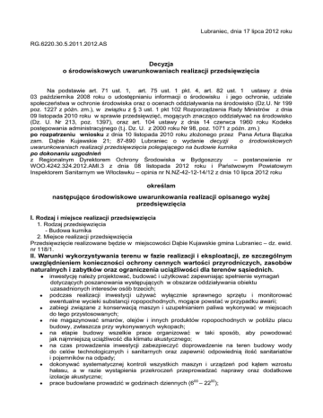 Lubraniec, dnia 17 lipca 2012 roku RG.6220.30.5.2011.2012.AS Decyzja o środowiskowych uwarunkowaniach realizacji przedsięwzięcia Na podstawie art. 71 ust. 1, art. 75 ust. 1 pkt. 4, art. 82 ust. 1 ustawy z dnia 03 października 2008 roku o udostępnianiu informacji o środowisku i jego ochronie, udziale społeczeństwa w ochronie środowiska oraz o ocenach oddziaływania na środowisko (Dz.U. Nr 199 poz. 1227 z późn. zm.), w związku z § 3 ust. 1 pkt 102 Rozporządzenia Rady Ministrów z dnia 09 listopada 2010 roku w sprawie przedsięwzięć, mogących znacząco oddziaływać na środowisko (Dz. U. Nr 213, poz. 1397), oraz art. 104 ustawy z dnia 14 czerwca 1960 roku Kodeks postępowania administracyjnego (t.j. Dz. U. z 2000 roku Nr 98, poz. 1071 z późn. zm.) po rozpatrzeniu wniosku z dnia 10 listopada 2010 roku złożonego przez Pana Artura Bączka zam. Dąbie Kujawskie 21; 87-890 Lubraniec o wydanie decyzji o środowiskowych uwarunkowaniach realizacji przedsięwzięcia polegającego na budowie kurnika po dokonaniu uzgodnień z Regionalnym Dyrektorem Ochrony Środowiska w Bydgoszczy – postanowienie nr WOO.4242.324.2012.AMI.3 z dnia 08 listopada 2012 roku i Państwowym Powiatowym Inspektorem Sanitarnym we Włocławku – opinia nr N.NZ-42-12-14/12 z dnia 10 lipca 2012 roku określam następujące środowiskowe uwarunkowania realizacji opisanego wyżej przedsięwzięcia I. Rodzaj i miejsce realizacji przedsięwzięcia 1. Rodzaj przedsięwzięcia - Budowa kurnika 2. Miejsce realizacji przedsięwzięcia Przedsięwzięcie realizowane będzie w miejscowości Dąbie Kujawskie gmina Lubraniec – dz. ewid. nr 118/1. II. Warunki wykorzystywania terenu w fazie realizacji i eksploatacji, ze szczególnym uwzględnieniem konieczności ochrony cennych wartości przyrodniczych, zasobów naturalnych i zabytków oraz ograniczenia uciążliwości dla terenów sąsiednich. ● inwestycję należy projektować, budować i użytkować zapewniając spełnienie wymagań dotyczących poszanowania występujących w obszarze oddziaływania obiektu uzasadnionych interesów osób trzecich; podczas realizacji inwestycji używać wyłącznie sprawnego sprzętu i monitorować ewentualne wycieki substancji ropopochodnych, mogące powstać w przypadku awarii; zabiegi związane z konserwacją maszyn i uzupełnianiem paliwa wykonywać w miejscach do tego przystosowanych; nie magazynować smarów, olejów i innych produktów ropopochodnych w pobliżu placu budowy, zwłaszcza przy wykonywanych wykopach; na etapie budowy wszelkie prace organizować w taki sposób, aby powodować jak najmniejszą uciążliwość dla klimatu akustycznego; na czas prowadzenia inwestycji zabezpieczyć doprowadzenie na teren budowy wody do celów technologicznych i sanitarnych oraz zapewnić odpowiednią ilość sanitariatów i pojemników na odpady; dokonywać systematycznej kontroli wszystkich maszyn i urządzeń pod kątem wzrostu hałasu, a w razie wystąpienia przekroczeń przeprowadzać naprawy oraz dodatkowe izolacje akustyczne; prace budowlane prowadzić w godzinach dziennych (600 – 2200); na etapie realizacji inwestycji wyznaczyć miejsca tymczasowego gromadzenia odpadów i sukcesywnie przekazywać je do zagospodarowania lub unieszkodliwiania; obszar niezajęty trwale pod inwestycję, zrekultywować po zakończeniu prac; odpady segregować i składować w wydzielonym miejscu, w pojemnikach, zapewniając ich regularny odbiór przez uprawnione podmioty. Odpady niebezpieczne segregować celem wywozu do specjalistycznych przedsiębiorstw zajmujących się ich unieszkodliwianiem. Miejsca ich gromadzenia zabezpieczyć przed skażeniem środowiska; odpady zawierające składniki niebezpieczne magazynować w wydzielonych i przystosowanych miejscach w sposób uniemożliwiający przedostanie się substancji niebezpiecznych do środowiska i przekazywać je odbiorcom posiadającym stosowne pozwolenia; odpady z produkcji zwierzęcej (sztuki padłe) przechowywać w szczelnych plastikowych kontenerach, zlokalizowanych w sąsiedztwie obiektów produkcyjnych, do czasu przekazania odbiorcom do unieszkodliwiania w wyspecjalizowanych zakładach utylizacyjnych; nawozy naturalne wykorzystywać w celach rolniczych z zachowaniem przepisów szczegółowych w tym zakresie, zgodnie z dobrymi praktyki rolniczymi i planem nawożenia. pomiot kurzy niezagospodarowany jako nawóz naturalny traktować jako odpad i postępować z nim zgodnie z przepisami ustawy z dnia 27 kwietnia 2001 r. o odpadach (Dz. U. z 2010 r. Nr 185, poz. 1243 z późn. zm); transport samochodowy na terenie fermy prowadzić wyłącznie w godzinach dziennych (600-2200); zastosować odpowiednie metody żywieniowe polegające na modyfikacji składu paszy lub suplementu w celu ograniczenia wydalania azotu i związków odorotwórczych; utrzymywać wysoki poziom higieny pomieszczeń inwentarskich, w celu ograniczenia emisji gazów, substancji złowonnych oraz areozoli bakteryjnych; prowadzić okresowe przeglądy instalacji wentylacyjnej oraz instalacji związanych z przygotowaniem i rozprowadzaniem pasz; każdorazowo po zakończonym cyklu produkcyjnym kontrolować i czyścić systemy wentylacyjne; zastosować urządzenia wentylacyjne oraz technologiczne charakteryzujące się niskim poziomem dźwięku lub ograniczyć emisję hałasu projektowanych urządzeń poprzez odpowiednie adaptacje akustyczne; urządzenia i instalacje powodujące nadmierną uciążliwość akustyczną wyposażyć w obudowy dźwiękochłonne. wykonywanie wykopów ziemnych musi odbywać się ze szczególną ostrożnością, aby uniemożliwić penetrację zanieczyszczeń wód opadowych do warstwy wodonośnej, zaś materiały wykorzystane do budowy nie mogą wchodzić w reakcje, które powodowałyby zanieczyszczenia wód podziemnych. III. Wymagania dotyczące ochrony środowiska konieczne do uwzględnienia w dokumentacji wymaganej do wydania decyzji, o których mowa w art. 72 ust. 1, w szczególności w projekcie budowlanym