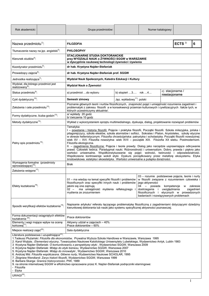 Grupa przedmiotów: Rok akademicki: Numer katalogowy: ECTS 2) Nazwa przedmiotu1): FILOZOFIA Tłumaczenie nazwy na jęz. angielski3): PHILOSOPHY Kierunek studiów4): STACJONARNE STUDIA DOKTORANCKIE przy WYDZIALE NAUK o ŻYWNOŚCI SGGW w WARSZAWIE w dyscyplinie naukowej technologii żywności i żywienia Koordynator przedmiotu5): 6) dr hab. Krystyna Najder-Stefaniak Prowadzący zajęcia : dr hab. Krystyna Najder-Stefaniak prof. SGGW Jednostka realizująca7): Wydział Nauk Społecznych, Katedra Edukacji i Kultury Wydział, dla którego przedmiot jest realizowany8): Wydział Nauk o Żywności Status przedmiotu9): a) przedmiot …do wyboru 10) Cykl dydaktyczny : Założenia i cele przedmiotu12): Formy dydaktyczne, liczba godzin13): 6 Semestr zimowy b) stopień …3…. rok …4… c) stacjonarne / niestacjonarne 11) Jęz. wykładowy : polski Poznanie głównych teorii i nurtów filozoficznych, znajomość pojęć i umiejętność rozumienia zagadnień i problematyki z zakresu filozofii a w konsekwencji przemian kulturowych i cywilizacyjnych /także tych, w których uczestniczymy aktualnie/. a/ wykłady 20 godz b/ ćwiczenia 10 godz Metody dydaktyczne14): Wykład z wykorzystaniem sprzętu multimedialnego, dyskusja, dialog, projektowanie rozwiązań problemów Pełny opis przedmiotu15): Tematyka: I – powstanie i historia filozofii: Pojęcie i praktyka filozofii, Początki filozofii. Szkoła milezyjska, jońska i pitagorejczycy, szkoła eleatów, szkoła atomistów i sofiści, Sokrates i Platon, Arystoteles, szkoły etyczne w okresie hellenistycznym. Filozofia chrześcijańska: patrystyka i scholastyka. Początki filozofii nowożytnej: wiek XV – XVI. Filozofia nowożytna: wiek XVII – początek XIX. Filozofia XX wieku. Postmodernizm. Filozofia ekologiczna. II. – zagadnienia filozoficzne: Pojęcia i teorie prawdy. Dialog jako narzędzie usprawniające odkrywanie prawd. Człowiek twórca. Paradygmat nauki. Różnorodność i uniwersalizm. Dobro, prawda i piękno jako wartości uniwersalne. Współkonstytuowanie się pojęć: wolność, twórczość i odpowiedzialność. Współczesne kontrowersje wokół etyki. Dyskurs porządkowany przez metaforę ekosystemu. Etyka środowiskowa. estetyka i ekoestetyka. Wartości uniwersalne a pułapka doraźności. Wymagania formalne (przedmioty wprowadzające)16): Brak Założenia wstępne17): 03 – rozumie podstawowe pojęcia, teorie i nurty w filozofii związane z rozumieniem człowieka i jego aktywności 04 – posiada kompetencje w zakresie dostrzegania i uwzględniania zagadnień filozoficznych i etycznych w prowadzonych badaniach i rozwiązywanych problemach Efekty kształcenia18): 01 – ma wiedzę na temat specyfiki filozofii i problemów filozoficznych oraz specyfiki innych nauk i problemów jakimi się one zajmują 02 – ma umiejętność myślenia refleksyjnego i myślenia ze zrozumieniem Sposób weryfikacji efektów kształcenia19): Napisanie artykułu/ referatu łączącego problematykę filozoficzną z zagadnieniami dotyczącymi dziedziny kierunkowej doktoranta lub nauki jako systemu specyficznej aktywności poznawczej. Forma dokumentacji osiągniętych efektów Prace doktorantów kształcenia 20): Elementy i wagi mające wpływ na ocenę Aktywny udział w zajęciach – 40% końcową21): Prace doktorantów – 60% Miejsce realizacji zajęć22): Sala dydaktyczna Literatura podstawowa i uzupełniająca23): 1.Tadeusz Płużański: Filozofia dla ekonomistów, Prywatna Wyższa Szkoła Handlowa w Warszawie, Warszawa 1995 2. Karol Wojtyła.: Elementarz etyczny, Towarzystwo Naukowe Katolickiego Uniwersytetu Lubelskiego, Wydawnictwo Antyk, Lublin 1983 3 Krystyna Najder-Stefaniak: O komunikowaniu z perspektywy etyki , Wydawnictwo SGGW, Warszawa 2009 4. Krystyna Najder-Stefaniak: Wstęp do etyki biznesu, Wydawnictwo SGGW, Warszawa 2007 5. Krystyna Najder-Stefaniak: Wstęp do innowatyki , Wydawnictwo SGGW, Warszawa 2010 6. Andrzej Miś: Filozofia współczesna. Główne nurty, Wydawnictwo Naukowe SCHOLAR, 1995 7. Zbigniew Wendland: Zarys historii filozofii, Wydawnictwo SGGW, Warszawa 1999 8. Barbara Skarga: Granice historyczności, PIW, 1989 9. na stronie internetowej SGGW w eRolnictwo opracowane przez K. Najder-Stefaniak podręczniki elarningowe: - Filozofia - Etyka UWAGI24): 1 Wskaźniki ilościowe charakteryzujące moduł/przedmiot 25) : Szacunkowa sumaryczna liczba godzin pracy studenta (kontaktowych i pracy własnej) niezbędna dla osiągnięcia zakładanych efektów kształcenia18) - na tej podstawie należy wypełnić pole ECTS2: Łączna liczba punktów ECTS, którą student uzyskuje na zajęciach wymagających bezpośredniego udziału nauczycieli akademickich: Łączna liczba punktów ECTS, którą student uzyskuje w ramach zajęć o charakterze praktycznym, takich jak zajęcia laboratoryjne, projektowe, itp.: Tabela zgodności kierunkowych efektów kształcenia efektami przedmiotu Nr /symbol efektu 01 02 03 04 …150…. h …3……. ECTS …3…. ECTS 26) Wymienione w wierszu efekty kształcenia: ma wiedzę na temat specyfiki filozofii i problemów filozoficznych oraz specyfiki innych nauk i problemów jakimi się one zajmują ma umiejętność myślenia refleksyjnego i myślenia ze zrozumieniem rozumie podstawowe pojęcia, teorie i nurty w filozofii związane z rozumieniem człowieka i jego aktywności posiada kompetencje w zakresie dostrzegania i uwzględniania zagadnień filozoficznych i etycznych w prowadzonych badaniach i rozwiązywanych problemach Odniesienie do efektów dla programu kształcenia na kierunku SD_W05; SD_U11 SD_W05; SD_U11 SD_W05; SD_U11 SD_K01; SD_ K04; 2
