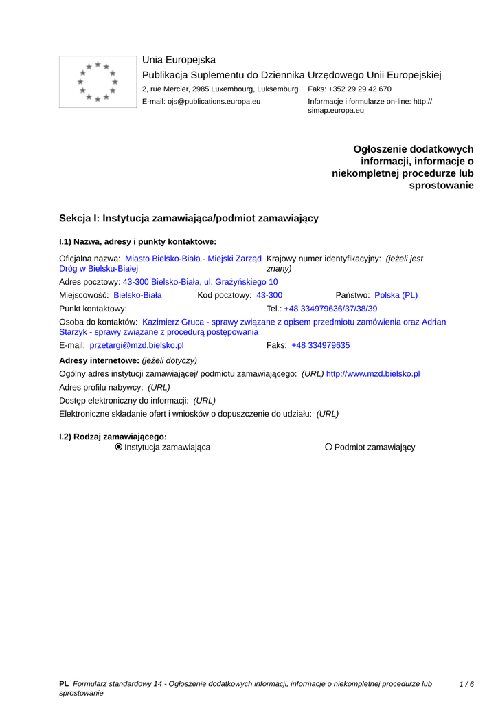 Unia Europejska Publikacja Suplementu do Dziennika Urzędowego Unii Europejskiej 2, rue Mercier, 2985 Luxembourg, Luksemburg Faks: +352 29 29 42 670 E-mail: [email protected] Informacje i formularze on-line: http:// simap.europa.eu Ogłoszenie dodatkowych informacji, informacje o niekompletnej procedurze lub sprostowanie Sekcja I: Instytucja zamawiająca/podmiot zamawiający I.1) Nazwa, adresy i punkty kontaktowe: Oficjalna nazwa: Miasto Bielsko-Biała - Miejski Zarząd Krajowy numer identyfikacyjny: (jeżeli jest Dróg w Bielsku-Białej znany) _____ Adres pocztowy: 43-300 Bielsko-Biała, ul. Grażyńskiego 10 Miejscowość: Bielsko-Biała Kod pocztowy: 43-300 Punkt kontaktowy: _____ Państwo: Polska (PL) Tel.: +48 334979636/37/38/39 Osoba do kontaktów: Kazimierz Gruca - sprawy związane z opisem przedmiotu zamówienia oraz Adrian Starzyk - sprawy związane z procedurą postępowania E-mail: [email protected] Faks: +48 334979635 Adresy internetowe: (jeżeli dotyczy) Ogólny adres instytucji zamawiającej/ podmiotu zamawiającego: (URL) http://www.mzd.bielsko.pl Adres profilu nabywcy: (URL) _____ Dostęp elektroniczny do informacji: (URL) _____ Elektroniczne składanie ofert i wniosków o dopuszczenie do udziału: (URL) _____ I.2) Rodzaj zamawiającego: Instytucja zamawiająca Podmiot zamawiający PL Formularz standardowy 14 - Ogłoszenie dodatkowych informacji, informacje o niekompletnej procedurze lub sprostowanie 1/6 Sekcja II: Przedmiot zamówienia II.1.1) Nazwa nadana zamówieniu: Pełnienie funkcji Inżyniera Kontraktu w trakcie realizacji inwestycji pn.: „Rozbudowa ul. Cieszyńskiej w BielskuBiałej” w ramach zadania inwestycyjnego „Rozbudowa odcinka drogi wojewódzkiej nr 942 w Bielsku-Białej”. II.1.2) Krótki opis zamówienia lub zakupu: (podano w pierwotnym ogłoszeniu) Przedmiotem zamówienia jest pełnienie funkcji Inżyniera Kontraktu w trakcie realizacji inwestycji pn.: „Rozbudowa ul. Cieszyńskiej w Bielsku-Białej” w ramach zadania inwestycyjnego „Rozbudowa odcinka drogi wojewódzkiej nr 942 w Bielsku-Białej” Zamówienie obejmuje swoim zakresem w szczególności nadzorowanie robót Wykonawcy KONTRAKTU i zatwierdzanie wszelkich materiałów, techniki i technologii budowlanej oraz jakości wykonania zgodnie z Dokumentacją Projektową oraz KONTRAKTEM na wszystkich robotach nim objętych, w tym w szczególności: - robotach drogowych; - robotach mostowych; - robotach wodno-kanalizacyjnych; - robotach elektrycznych; - robotach telekomunikacyjnych; - robotach gazowych; - robotach innych (wg potrzeb), a także weryfikację dokumentacji projektowej i koordynowanie robót w pasie drogowym z gestorami sieci, wykonującymi inne roboty we własnym zakresie. KONTRAKT obejmuje w szczególności następujący zakres robót: rozbudowa ulicy Cieszyńskiej na odcinku 4034,00 m, budowa dwóch rond turbinowych w zadłuż ulicy Cieszyńskiej w km ~1+060,00 oraz ~1+525,00, przebudowa istniejącego ronda Niemena w km ~3+270,00, przebudowa istniejących skrzyżowań ul. Cieszyńskiej z ul. Średnią, Jagienki, Zniczową, Jaworzańską, Regera, Wapienicką, Skrzydlewskiego, Nasienną, Spółdzielców, Saperów, Stawową, Szarotki, Klonową, Wrzosową, Jesionową, Agrestową, Rodzińskiego, Kwiatową, likwidacja istniejących skrzyżowań ul. Cieszyńskiej z ul. Dzwonkową, Regera, Zapłocie Duże, Wierzbową i Krzywą, przebudowa/rozbudowa ulicy Dzwonkowej – włączenie w skrzyżowanie z ulicą Średnią w km ~0,100,00, przebudowa/rozbudowa ulicy Zagajnik – połączenie z nowoprojektowaną ul. Międzyrzecką (wg odrębnego opracowania) przebudowa/rozbudowa ulicy Regera – włączenie do nowoprojektowanego ronda na ul. Cieszyńskiej – w km ~1+060,00. przebudowa/rozbudowa ulicy Międzyrzeckiej (stary przebieg) – włączenie w skrzyżowanie z ulicą Regera (nowy przebieg), przebudowa/rozbudowa ulicy Jaworzańskiej – włączenie do nowoprojektowanego ronda na ul. Cieszyńskiej – w km ~1+060,00. przebudowa/rozbudowa ulicy Słowiańskiej – włączenie do ulicy Jaworzańskiej, przebudowa/rozbudowa ulicy Celtyckiej – włączenie do ulicy Słowiańskiej, budowa nowego połączenia od ronda w km ~1+525,00 do istniejącej ulicy Tańskiego, rozbudowa ulicy Wapienickiej wraz z budową mini ronda i obsługą terenów przyległych, budowa ul. Nowogościnnej w km ~2+060,00 wraz z rondem i pętlą autobusową, przebudowa/rozbudowa ulic Klonowa, Begonii i Szarotki, PL Formularz standardowy 14 - Ogłoszenie dodatkowych informacji, informacje o niekompletnej procedurze lub sprostowanie 2/6 budowa dróg dojazdowych, przebudowa wlotu na rondzie Hulanka w km ~4+000,00, rozbudowa istniejących obiektów inżynierskich w tym mostu na potoku Wapiennickim w km ~1+325,00 oraz przebudowa/budowa przepustów (13 szt.), budowa murów oporowych, wyburzenie budynków oraz obiektów tymczasowych, przebudowa istniejących zjazdów indywidualnych i publicznych, budowa/rozbudowa przejść podziemnych w rejonie skrzyżowania z ul. Smolną oraz ul. Jaworzańską, rozbudowa/budowa chodników, przebudowa/budowa zatok autobusowych, budowa ścieżki rowerowej wzdłuż ulicy Cieszyńskiej wraz z połączeniem jej do istniejących i projektowanych ścieżek rowerowych w obrębie ulicy Cieszyńskiej, budowa kanalizacji deszczowej w ciągu ul. Cieszyńskiej, na drogach poprzecznych, na drogach serwisowych i nowoprojektowanych łącznikach wraz z terenami przyległymi z odprowadzeniem do istniejących cieków wodnych, przebudowa istniejących cieków wodnych i rowów w rejonie obiektów inżynierskich i w rejonie wylotów kanalizacji deszczowych, budowa elementów ochrony środowiska tj. ekranów akustycznych, budowa urządzeń bezpieczeństwa ruchu drogowego tj. bariery ochronne, balustrady, sygnalizacje świetlne, itp., budowa kanału technologicznego dla sieci szerokopasmowej, przebudowa/budowa lub zabezpieczenie kolidującej infrastruktury technicznej, w szczególności: sieci energetycznej (w tym oświet