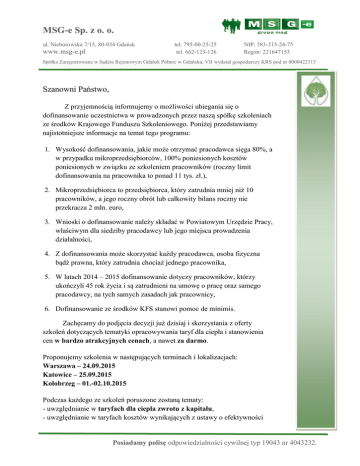 MSG-e Sp. z o. o. ul. Nieborowska 7/15, 80-034 Gdańsk www.msg-e.pl tel. 795-00-25-25 tel. 662-123-126 NIP: 583-315-24-75 Regon: 221647153 Spółka Zarejestrowana w Sądzie Rejonowym Gdańsk Północ w Gdańsku, VII wydział gospodarczy KRS pod nr 0000422313 Szanowni Państwo, Z przyjemnością informujemy o możliwości ubiegania się o dofinansowanie uczestnictwa w prowadzonych przez naszą spółkę szkoleniach ze środków Krajowego Funduszu Szkoleniowego. Poniżej przedstawiamy najistotniejsze informacje na temat tego programu: 1. Wysokość dofinansowania, jakie może otrzymać pracodawca sięga 80%, a w przypadku mikroprzedsiębiorców, 100% poniesionych kosztów poniesionych w związku ze szkoleniem pracowników (roczny limit dofinansowania na pracownika to ponad 11 tys. zł.), 2. Mikroprzedsiębiorca to przedsiębiorca, który zatrudnia mniej niż 10 pracowników, a jego roczny obrót lub całkowity bilans roczny nie przekracza 2 mln. euro, 3. Wnioski o dofinansowanie należy składać w Powiatowym Urzędzie Pracy, właściwym dla siedziby pracodawcy lub jego miejsca prowadzenia działalności, 4. Z dofinansowania może skorzystać każdy pracodawca, osoba fizyczna bądź prawna, który zatrudnia chociaż jednego pracownika, 5. W latach 2014 – 2015 dofinansowanie dotyczy pracowników, którzy ukończyli 45 rok życia i są zatrudnieni na umowę o pracę oraz samego pracodawcy, na tych samych zasadach jak pracownicy, 6. Dofinansowanie ze środków KFS stanowi pomoc de minimis. Zachęcamy do podjęcia decyzji już dzisiaj i skorzystania z oferty szkoleń dotyczących tematyki opracowywania taryf dla ciepła i stanowienia cen w bardzo atrakcyjnych cenach, a nawet za darmo. Proponujemy szkolenia w następujących terminach i lokalizacjach: Warszawa – 24.09.2015 Katowice – 25.09.2015 Kołobrzeg – 01.-02.10.2015 Podczas każdego ze szkoleń poruszone zostaną tematy: - uwzględnianie w taryfach dla ciepła zwrotu z kapitału, - uwzględnianie w taryfach kosztów wynikających z ustawy o efektywności Posiadamy polisę odpowiedzialności cywilnej typ 19043 nr 4043232. MSG-e Sp. z o. o. ul. Nieborowska 7/15, 80-034 Gdańsk www.msg-e.pl tel. 795-00-25-25 tel. 662-123-126 NIP: 583-315-24-75 Regon: 221647153 Spółka Zarejestrowana w Sądzie Rejonowym Gdańsk Północ w Gdańsku, VII wydział gospodarczy KRS pod nr 0000422313 energetycznej (białe certyfikaty – opłata zastępcza), - umieszczanie w kalkulacji brakujących uprawnień CO2, - najnowsze praktyki Urzędu Regulacji Energetyki w postępowaniach taryfowych, - bieżące wyzwania na rynku ciepłowniczym, wynikające ze zmiany przepisów, m. in. Ustawa o Odnawialnych Źródłach Energii Po wybraniu interesującego Państwa szkolenia, kolejność działań w ramach istniejącej procedury jest następująca: 1. Przesyłacie Państwo do nas informację o dokonanym wyborze, 2. Przesyłamy Państwu wniosek o dofinansowanie i pomagamy go wypełnić, 3. Składacie Państwo wniosek we właściwym Powiatowym Urzędzie Pracy, 4. Po akceptacji wniosku, podpisujecie Państwo umowę z PUP, 5. Podpisujecie Państwo umowę szkoleniową z naszą spółką, 6. Odbieracie Państwo dofinansowanie, 7. Uczestniczycie Państwo w organizowanym przez naszą spółkę szkoleniu, 8. Rozliczacie Państwo otrzymane dofinansowanie w PUP W razie wątpliwości prosimy o kontakt telefoniczny (tel. 795-00-25-25) bądź mailowy ([email protected]). Postaramy się odpowiedzieć na wszystkie Państwa pytania. Z poważaniem Zespół MSG-e sp. z o.o. Posiadamy polisę odpowiedzialności cywilnej typ 19043 nr 4043232.
