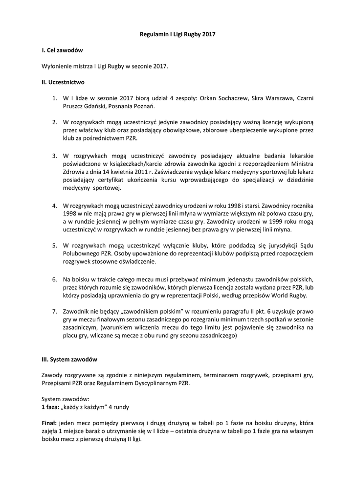 Regulamin I Ligi Rugby 2017 I. Cel zawodów Wyłonienie mistrza I Ligi Rugby w sezonie 2017. II. Uczestnictwo 1. W I lidze w sezonie 2017 biorą udział 4 zespoły: Orkan Sochaczew, Skra Warszawa, Czarni Pruszcz Gdański, Posnania Poznań. 2. W rozgrywkach mogą uczestniczyć jedynie zawodnicy posiadający ważną licencję wykupioną przez właściwy klub oraz posiadający obowiązkowe, zbiorowe ubezpieczenie wykupione przez klub za pośrednictwem PZR. 3. W rozgrywkach mogą uczestniczyć zawodnicy posiadający aktualne badania lekarskie poświadczone w książeczkach/karcie zdrowia zawodnika zgodni z rozporządzeniem Ministra Zdrowia z dnia 14 kwietnia 2011 r. Zaświadczenie wydaje lekarz medycyny sportowej lub lekarz posiadający certyfikat ukończenia kursu wprowadzającego do specjalizacji w dziedzinie medycyny sportowej. 4. W rozgrywkach mogą uczestniczyć zawodnicy urodzeni w roku 1998 i starsi. Zawodnicy rocznika 1998 w nie mają prawa gry w pierwszej linii młyna w wymiarze większym niż połowa czasu gry, a w rundzie jesiennej w pełnym wymiarze czasu gry. Zawodnicy urodzeni w 1999 roku mogą uczestniczyć w rozgrywkach w rundzie jesiennej bez prawa gry w pierwszej linii młyna. 5. W rozgrywkach mogą uczestniczyć wyłącznie kluby, które poddadzą się jurysdykcji Sądu Polubownego PZR. Osoby upoważnione do reprezentacji klubów podpiszą przed rozpoczęciem rozgrywek stosowne oświadczenie. 6. Na boisku w trakcie całego meczu musi przebywać minimum jedenastu zawodników polskich, przez których rozumie się zawodników, których pierwsza licencja została wydana przez PZR, lub którzy posiadają uprawnienia do gry w reprezentacji Polski, według przepisów World Rugby. 7. Zawodnik nie będący „zawodnikiem polskim” w rozumieniu paragrafu II pkt. 6 uzyskuje prawo gry w meczu finałowym sezonu zasadniczego po rozegraniu minimum trzech spotkań w sezonie zasadniczym, (warunkiem wliczenia meczu do tego limitu jest pojawienie się zawodnika na placu gry, wliczane są mecze z obu rund gry sezonu zasadniczego) III. System zawodów Zawody rozgrywane są zgodnie z niniejszym regulaminem, terminarzem rozgrywek, przepisami gry, Przepisami PZR oraz Regulaminem Dyscyplinarnym PZR. System zawodów: 1 faza: „każdy z każdym” 4 rundy Finał: jeden mecz pomiędzy pierwszą i drugą drużyną w tabeli po 1 fazie na boisku drużyny, która zajęła 1 miejsce baraż o utrzymanie się w I lidze – ostatnia drużyna w tabeli po 1 fazie gra na własnym boisku mecz z pierwszą drużyną II ligi. IV. Klasyfikacja i punktacja O końcowej klasyfikacji na każdym etapie rozgrywek decydują w kolejności: 1) większa liczba zdobytych dużych punktów łącznie z bonusowymi, 2) rezultaty bezpośrednich spotkań pomiędzy zainteresowanymi (mała tabela), 3) korzystniejszy stosunek małych punktów, 4) większa liczba zdobytych małych punktów, 5) mniejsza liczba wykluczeń, 6) mniejsza liczba upomnień, 7) losowanie. W meczach finałowych, w przypadku remisu zarządza się dogrywkę (2 x 10 minut, przerwa 5 minut). Jeśli dogrywka nie przyniesie rozstrzygnięcie, zarządza się rzuty karne wykonywane wedle następującego klucza: pierwsza faza: 5 prób dla każdej drużyny z linii 22 metrów. druga faza: po jednej próbie, na zmianę aż do skutku z linii 22 metrów. O kolejności kopów decyduje losowanie. W próbach uczestniczą jedynie ci zawodnicy, którzy ukończyli mecz na boisku. W każdej fazie jeden zawodnik może wykonać tylko jedną próbę. Zawodnik może wykonać drugą próbę jeżeli wszyscy zawodnicy z jego drużyny wykonali już próbę. Punktacja : 1) za zwycięstwo drużyna otrzymuje 4 lub 5 (4+1) punktów w przypadku, gdy 2) wywalczy bonus, 3) za remis drużyna otrzymuje 2 lub 3 (2+1) punkty w przypadku, gdy wywalczy bonus, 4) za porażkę drużyna otrzymuje 0 lub 1 punkt w przypadku, gdy wywalczy bonus, 5) za porażkę walkowerem drużyna karana jest minus jeden punkt, w małych 6) punktach 0:25, 7) za zwycięstwo walkowerem zespół otrzymuje 5 punktów, w małych punktach 25:0, 8) za zdobycie w meczu 4 lub więcej przyłożeń zespół otrzymuje dodatkowo 1 punkt bonusowy, 9) za przegranie meczu siedmioma i mniej punktami zespół otrzymuje dodatkowo 1 punkt bonusowy, 10) zespół może otrzymać tylko jeden punkt bonusowy w danym meczu. V. Kontrola antydopingowa 1. Kluby uczestniczące w rozgrywkach Ekstraligi mają bezwzględny obowiązek podawania informacji na temat miejsca i terminów zorganizowanego treningu zawodników w sposób określony przez Komisję do Zwalczania Dopingu w Sporcie (drogą elektroniczną, za pomocą udostępnionych loginów i haseł). Informacje te będą cały czas traktowane, jako poufne i wykorzystywane wyłącznie w celach planowania, koordynowania i przeprowadzania badań antydopingowych oraz zostaną zniszczone, gdy stracą swoją przydatność do wyżej określonych celów. 2. Kluby uczestniczące w rozgrywkach Ekstraligi będą podawać informacje o miejscu i terminach treningów zawodników z góry, co najmniej na okres następnego miesiąca. Informacje te przekazywane będą nie później niż na 7 dni przed rozpoczęciem tego miesiąca. W przypadku konieczności zmiany wcześniej wprowadzonych danych, klub ma obowiązek bezzwłocznego ich skorygowania 3. W przypadku naruszenia obowiązku przekazywania danych organizator rozgrywek nałoży na klub następujące kary: pierwsze naruszenia obowiązku w ciągu sezonu 2017 - nagana i podanie do publicznej wiadomości informacji o utrudnianiu przez klub planowania kontroli antydopingowych, drugie naruszenie obowiązku w ciągu sezonu 2017 - odebranie 5 punktów w tabeli rozgrywek Ekstraligi na koniec aktualnie trwającej fazy rozgrywek, trzecie naruszenie obowiązku w ciągu sezonu 2017 - kara finansowa przewidziana regulaminem dyscyplinarnym za rażące naruszenie podstawowych obowiązków oraz degradacja do niższej klasy rozgrywkowej po zakończeniu sezonu 2017 bez względu na zaj