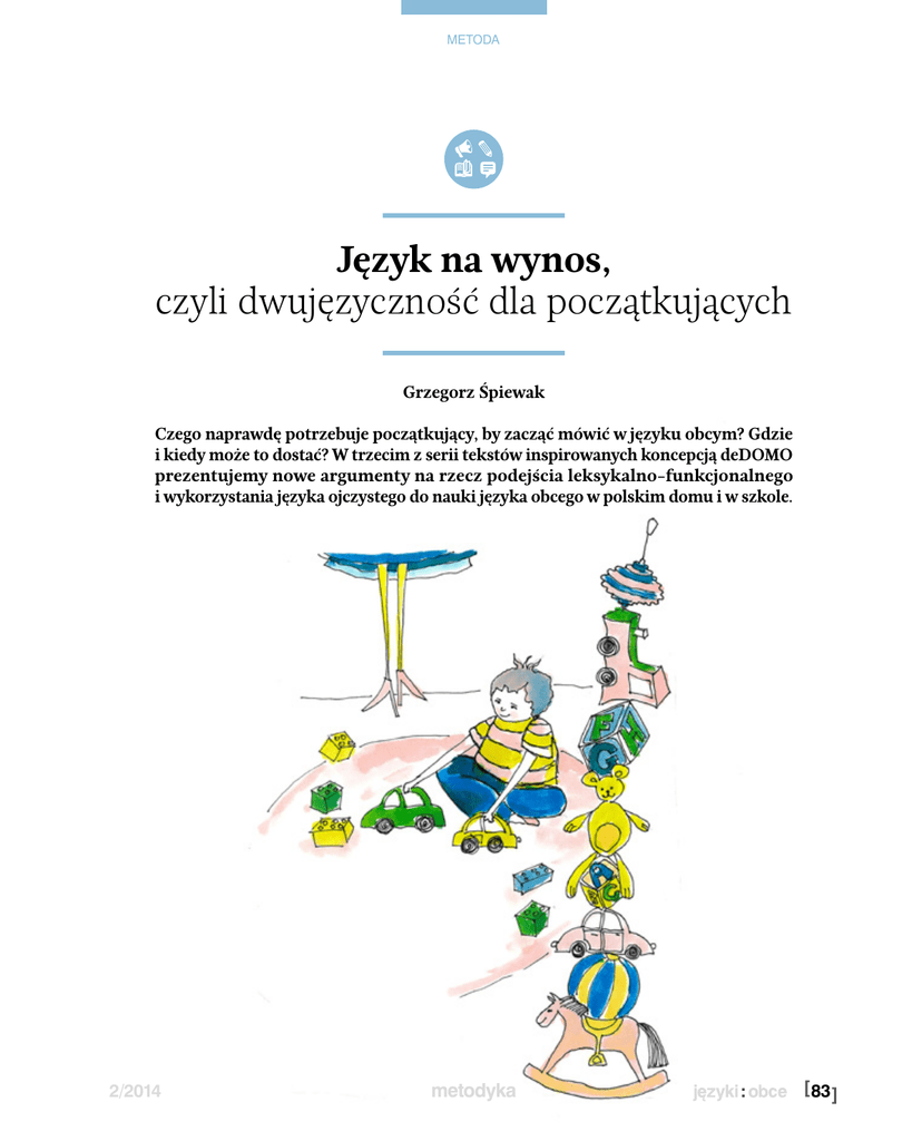 metoda Język na wynos, czyli dwujęzyczność dla początkujących Grzegorz Śpiewak Czego naprawdę potrzebuje początkujący, by zacząć mówić w języku obcym? Gdzie i kiedy może to dostać? W trzecim z serii tekstów inspirowanych koncepcją deDOMO prezentujemy nowe argumenty na rzecz podejścia leksykalno-funkcjonalnego i wykorzystania języka ojczystego do nauki języka obcego w polskim domu i w szkole. 2/2014 metodyka [ 83 ] metoda N a wynos – prześledźmy na wstępie najczęstsze konotacje tego określenia: gotowe do użytku, raczej do szybkiej konsumpcji, zapakowane. Odnoszą się one oczywiście do jedzenia. A jaki rodzaj języka obcego można by tak określić? Na początku zaznaczmy jedynie, że jest to z pewnością język, o którym początkujący mogą jedynie pomarzyć. Bo język obcy u początkującego jest radykalnie rozpakowany na poszczególne dźwięki, słówka i reguły gramatyczne – składniki mało przydatne tu i teraz. Po co jednak początkującemu gotowe danie, można by zapytać, skoro znajduje się on daleko od miejsca i sytuacji, w których mógłby swoje językowe umiejętności skonsumować? Czy nie lepiej powoli i cierpliwie uczyć się, jak łączyć ze sobą komunikacyjne składniki, nie ryzykując zakalca (czyli błędu) czy – co gorsza – zatrucia pokarmowego (wpadki, ośmieszenia itp.)? Odpowiadam innym pytaniem: czy uczącego się, który marzy o językowej sprawności na miarę kulinarnych wyczynów Jamiego Oliviera, naprawdę może zadowolić (i zmotywować do dalszych starań) cierpliwe stanie na komunikacyjnym zmywaku na zapleczu restauracji?! Mówiąc poważnie, nic tak nie cieszy, zwłaszcza na początku procesu uczenia się języka, jak poczucie sensowności naszych wysiłków. Co zaś jest bardziej sensowne dla przeciętnego początkującego, praktycznie niezależnie od wieku: poprawnie rozwiązać ćwiczenie gramatyczne, wyrecytować z pamięci kilka słówek, czy raczej np. umieć poprosić albo zapytać o coś, choćby z kiepskim akcentem i bez tej czy innej końcówki? Pisałem o tym już w pierwszym tekście z serii Język obcy udomowiony (Śpiewak 2012). Przedstawiłem tam koncepcję alternatywnego mechanizmu motywacyjnego, który może uczącemu się pomóc przezwyciężyć początkowe poczucie braku przydatności języka obcego1, pozwalając odczuć realną satysfakcję z podejmowania pierwszych prób użycia go do rzeczywistego celu komunikacyjnego, zwłaszcza jako instrumentu do realizacji istotnej, życiowej potrzeby. Szczególnie w sytuacji, gdy te ważne potrzeby mogą zrealizować osoby, które władają tym samym językiem ojczystym, co uczący się, a zatem komunikacyjna potrzeba użycia języka obcego 1 To poczucie braku przydatności komunikacyjnej nazwaliśmy, za Henrym Widdowsonem, obcością języka obcego. Konieczność pokonania tej obcości to jeden z zasadniczych tematów, powracający wielokrotnie w pracach Widdowsona; stosunkowo niedawno (1994:284) pisał: You are proficient in language to the extent you possess it, make it your own, bend it to your will […] rather than simply submit to the dictates of its form […] [podkr. autora]. [ 84 ] Oczywiście bardzo łatwo zdławić entuzjazm do podejmowania wczesnych prób komunikacyjnych, skupiając uwagę uczącego się nie na komunikacyjnym sukcesie, choćby częściowym, lecz na formalnojęzykowych niedostatkach, czyli na błędach. właściwie w ogóle się nie pojawia, o ile nie stworzymy szczególnych warunków2. Oczywiście bardzo łatwo zdławić entuzjazm do podejmowania takich wczesnych prób komunikacyjnych (z konieczności niedoskonałych pod względem formy), skupiając uwagę uczącego się nie na komunikacyjnym sukcesie, choćby częściowym, lecz na wspomnianych już powyżej zakalcach – formalnojęzykowych niedostatkach, czyli na błędach. O tym, jak wielkie niesie to ryzyko i jak można próbować go uniknąć, pisałem w tekście drugim z tej serii (Śpiewak 2013). Apelowałem w nim, by – na przekór pedagogicznym przyzwyczajeniom i odruchom – zaakceptować błąd językowy jako nie tylko nieodłączny, ale wręcz pożądany objaw uczenia się, zwłaszcza jeśli uwaga ucznia skupia się tam, gdzie właściwie powinna, czyli na treści komunikatu raczej niż na jego poprawności. Inspiracją dla obydwu tych tekstów jest refleksja nad proedukacyjnymi zachowaniami rodziców wobec swoich dzieci oraz nad pewnymi cechami domowych interakcji, które pozostają, moim zdaniem, niedoceniane na gruncie nauczania języka obcego. Z tych właśnie obserwacji zrodziło się 2 Jak stworzyć takie sprzyjające warunki i sam mechanizm motywacyjny w polskim domu, wyjaśniam szczegółowo rodzicom w publikacji popularyzatorskiej Angielski dla rodziców deDOMO. Przewodnik metodyczny; jak to osiągnąć w polskim przedszkolu, a nawet (po części) w polskiej szkole, pisałem w JOwS 4/2012. metodyka 2/2014 metoda podejście deDOMO i koncepcja udomawiania języka obcego. Nie tylko w warunkach domowych, z udziałem rodziców i dzieci, dla których deDOMO prymarnie powstało, ale także jako (potencjalnie) atrakcyjne wzmocnienie3 i urealnienie metodologii głównego nurtu, w tym szczególnie podejścia komunikacyjnego. O niedostatkach tego ostatniego pisałem również obszernie w poprzednich tekstach. O czym więc warto jeszcze mówić? Językowy szybkowar Odpowiedzią na to pytanie jest właśnie tytuł tego tekstu, ściślej zaś, jego pierwszy człon. Ma on zwrócić uwagę na sam komunikat, przy czym interesować nas tym razem będzie nie tyle jego efekt czy skuteczność przekazu, ale sam dobór środków językowych, który powoduje, że dany ciąg wyrazów w ogóle ma jakąś wartość komunikacyjną. Zwłaszcza w przypadku, gdy zakres tych środków językowych jest ogólnie mocno ograniczony. Mówiąc wprost, warto zastanowić się nad tym, czego najbardziej potrzebuje początkujący, aby mieć jakąkolwiek szansę zrozumieć albo przekazać sen