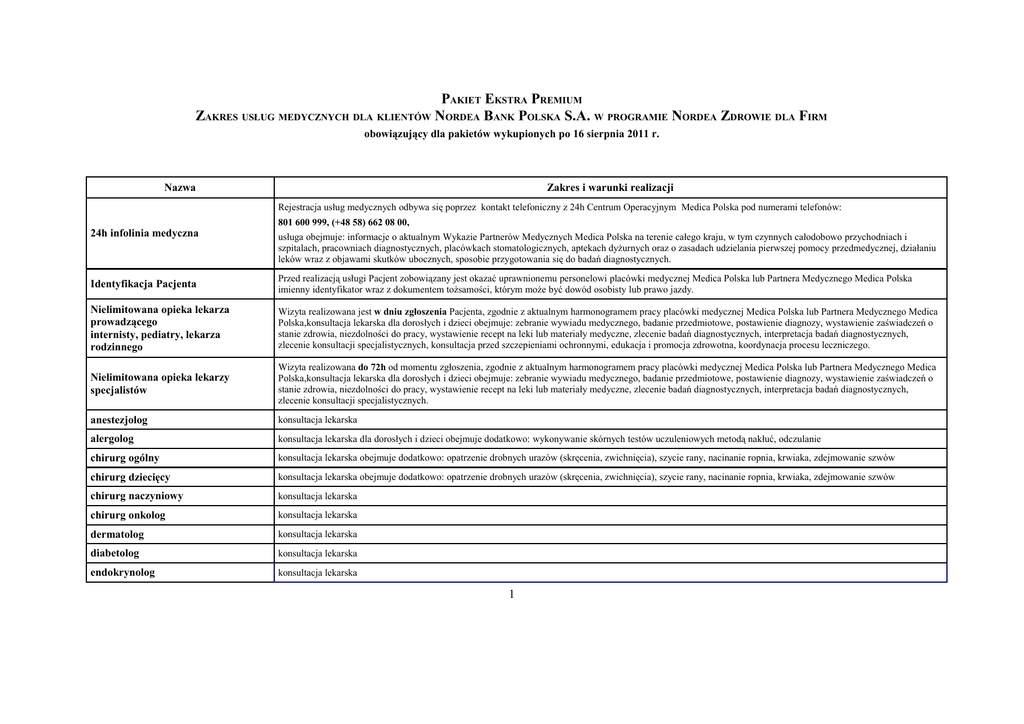 PAKIET EKSTRA PREMIUM ZAKRES USŁUG MEDYCZNYCH DLA KLIENTÓW NORDEA BANK POLSKA S.A. W PROGRAMIE NORDEA ZDROWIE DLA FIRM obowiązujący dla pakietów wykupionych po 16 sierpnia 2011 r. Nazwa Zakres i warunki realizacji Rejestracja usług medycznych odbywa się poprzez kontakt telefoniczny z 24h Centrum Operacyjnym Medica Polska pod numerami telefonów: 24h infolinia medyczna 801 600 999, (+48 58) 662 08 00, usługa obejmuje: informacje o aktualnym Wykazie Partnerów Medycznych Medica Polska na terenie całego kraju, w tym czynnych całodobowo przychodniach i szpitalach, pracowniach diagnostycznych, placówkach stomatologicznych, aptekach dyżurnych oraz o zasadach udzielania pierwszej pomocy przedmedycznej, działaniu leków wraz z objawami skutków ubocznych, sposobie przygotowania się do badań diagnostycznych. Identyfikacja Pacjenta Przed realizacją usługi Pacjent zobowiązany jest okazać uprawnionemu personelowi placówki medycznej Medica Polska lub Partnera Medycznego Medica Polska imienny identyfikator wraz z dokumentem tożsamości, którym może być dowód osobisty lub prawo jazdy. Nielimitowana opieka lekarza prowadzącego internisty, pediatry, lekarza rodzinnego Wizyta realizowana jest w dniu zgłoszenia Pacjenta, zgodnie z aktualnym harmonogramem pracy placówki medycznej Medica Polska lub Partnera Medycznego Medica Polska,konsultacja lekarska dla dorosłych i dzieci obejmuje: zebranie wywiadu medycznego, badanie przedmiotowe, postawienie diagnozy, wystawienie zaświadczeń o stanie zdrowia, niezdolności do pracy, wystawienie recept na leki lub materiały medyczne, zlecenie badań diagnostycznych, interpretacja badań diagnostycznych, zlecenie konsultacji specjalistycznych, konsultacja przed szczepieniami ochronnymi, edukacja i promocja zdrowotna, koordynacja procesu leczniczego. Nielimitowana opieka lekarzy specjalistów Wizyta realizowana do 72h od momentu zgłoszenia, zgodnie z aktualnym harmonogramem pracy placówki medycznej Medica Polska lub Partnera Medycznego Medica Polska,konsultacja lekarska dla dorosłych i dzieci obejmuje: zebranie wywiadu medycznego, badanie przedmiotowe, postawienie diagnozy, wystawienie zaświadczeń o stanie zdrowia, niezdolności do pracy, wystawienie recept na leki lub materiały medyczne, zlecenie badań diagnostycznych, interpretacja badań diagnostycznych, zlecenie konsultacji specjalistycznych. anestezjolog konsultacja lekarska alergolog konsultacja lekarska dla dorosłych i dzieci obejmuje dodatkowo: wykonywanie skórnych testów uczuleniowych metodą nakłuć, odczulanie chirurg ogólny konsultacja lekarska obejmuje dodatkowo: opatrzenie drobnych urazów (skręcenia, zwichnięcia), szycie rany, nacinanie ropnia, krwiaka, zdejmowanie szwów chirurg dziecięcy konsultacja lekarska obejmuje dodatkowo: opatrzenie drobnych urazów (skręcenia, zwichnięcia), szycie rany, nacinanie ropnia, krwiaka, zdejmowanie szwów chirurg naczyniowy konsultacja lekarska chirurg onkolog konsultacja lekarska dermatolog konsultacja lekarska diabetolog konsultacja lekarska endokrynolog konsultacja lekarska 1 Nazwa gastroenterolog ginekolog Zakres i warunki realizacji konsultacja lekarska konsultacja lekarska dla dorosłych i dzieci obejmuje dodatkowo: cytologię ginekologiczną prowadzenie ciąży hematolog konsultacja lekarska dla dorosłych i dzieci kardiolog konsultacja lekarska dla dorosłych i dzieci laryngolog konsultacja lekarska dla dorosłych i dzieci obejmuje dodatkowo: płukanie uszu, przedmuchiwanie trąbki słuchowej, usuwanie ciała obcego z przewodu słuchowego, nosa, gardła, opatrunek uszny z lekiem, postępowanie zachowawcze przy krwawieniu z nosa nefrolog konsultacja lekarska dla dorosłych i dzieci neurochirurg konsultacja lekarska dla dorosłych i dzieci neurolog konsultacja lekarska dla dorosłych i dzieci okulista konsultacja lekarska obejmuje dodatkowo: pomiar ciśnienia śródgałkowego, komputerowe badanie wzroku, badanie ostrości widzenia, badanie pola widzenia, płukanie dróg łzowych onkolog konsultacja lekarska ortopeda konsultacja dla dorosłych i dzieci obejmuje dodatkowo: unieruchomienie kończyn i stawów, wykonanie iniekcji dostawowej, założenie opatrunku gipsowego proktolog konsultacja lekarska pulmonolog konsultacja lekarska reumatolog konsultacja lekarska urolog konsultacja lekarska obejmuje dodatkowo: zakładanie cewników do pęcherza moczowego 24h pomoc ambulatoryjna Usługa realizowana w wybranych miejscowościach na terenie kraju, konsultacja lekarska obejmuje: zebranie wywiadu medycznego, badanie przedmiotowe, postawienie diagnozy, wystawienie zaświadczeń o stanie zdrowia, niezdolności do pracy, wystawienie recept na leki lub materiały medyczne, zlecenie badań diagnostycznych, interpretacja badań diagnostycznych, zlecenie konsultacji specjalistycznych. 24h lekarskie wizyty wyjazdowe Usługa realizowana w wybranych miejscowościach na terenie kraju wyłącznie ze wskazań medycznych, uniemożliwiających dotarcie Pacjenta do placówki medycznej Medica Polska lub Partnera Medycznego Medica Polska, konsultacja lekarska obejmuje: zebranie wywiadu medycznego, badanie przedmiotowe, postawienie diagnozy, wystawienie zaświadczeń o stanie zdrowia, niezdolności do pracy, wystawienie recept na leki lub materiały medyczne, zlecenie badań diagnostycznych, interpretacja badań diagnostycznych, zlecenie konsultacji specjalistycznych. Ambulatoryjna opieka pielęgniarska Usługa realizowana/koordynowana w placówce medycznej prowadzącej leczenie, wyłącznie po skierowaniu lekarza prowadzącego lub specjalisty, wynikającego ze wskazań medycznych, obejmuje: dożylny wlew kroplowy, iniekcje domięśniowe, dożylne, podskórne, badanie moczu metodą paskową, pomiar ciśnienia tętniczego, próbę uczuleniową na lek, założenie lub zmianę prostego opatrunku. Badania diagnostyczne Usługa realizowana/koordynowana w placówce medycznej prowadzącej leczenie lub wskazanej przez 24h infolinię medyczną, wyłączn