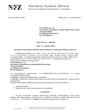Gdańsk, dnia 14 grudnia 2010 r. znak: WO-ZRP/1200-D PALLMED sp. z o.o. prowadząca Niepubliczny Zakład Opieki Zdrowotnej „Dom Sue Rider” ul. Wilhelma Roentgena 3 85-796 Bydgoszcz DECYZJA nr 428/2010 z dnia 14 grudnia 2010 r. Dyrektora Pomorskiego Oddziału Wojewódzkiego Narodowego Funduszu Zdrowia Działając na podstawie art. 154 ust. 3 w zw. z art. 107 ust. 5 pkt 8 oraz art. 142 ust. 5 pkt 1 w zw. z art. 148 ust. 1 i 2 oraz art. 134 i art. 140 ust. 2 pkt 1 oraz art. 149 ust. 1 ustawy z dnia 27 sierpnia 2004 r. o świadczeniach opieki zdrowotnej finansowanych ze środków publicznych (tekst jednolity Dz. U. Nr 164 z 2008r.; poz. 1027 ze zm.) – zwanej dalej „ustawą” po rozpatrzeniu odwołania złożonego przez: PALLMED sp. z o.o. prowadząca Niepubliczny Zakład Opieki Zdrowotnej „Dom Sue Rider” ul. Wilhelma Roentgena 3 85-796 Bydgoszcz od rozstrzygnięcia postępowania: 11-11-000066/SPO/14/1/14.2140.026.04/1 na terenie województwa pomorskiego w rodzaju: świadczenia pielęgnacyjne i opiekuńcze w zakresie: świadczenia zespołu długoterminowej opieki domowej dla pacjentów wentylowanych mechanicznie Dyrektor Pomorskiego Oddziału Wojewódzkiego Narodowego Funduszu Zdrowia 1. Oddala odwołanie. 2. Nadaje decyzji rygor natychmiastowej wykonalności. Uzasadnienie W dniu 15.09.2010r. Dyrektor Pomorskiego Oddziału Wojewódzkiego NFZ ogłosił konkurs ofert poprzedzający zawarcie umów o udzielanie świadczeń opieki zdrowotnej na lata 01.01.2011 r. – 31.12.2013 r. w rodzaju: świadczenia pielęgnacyjne i opiekuńcze w zakresie: świadczenia zespołu długoterminowej opieki domowej dla pacjentów wentylowanych mechanicznie dla obszaru województwa pomorskiego Postępowanie konkursowe zostało ogłoszone na kwotę 3.150.680 zł. W ogłoszeniu wskazano obowiązujące przepisy dotyczące zarówno wymogów, jakie muszą być spełnione przez podmioty składające oferty, jak i przepisy dotyczące kryteriów oceny ofert w postępowaniu w sprawie zawarcia umowy o udzielanie świadczeń opieki zdrowotnej. W postępowaniu konkursowym oferty złożyło 6 oferentów, w tym Odwołujący się. Oferent do złożonej oferty załączył oświadczenie z dnia 06.10.2010r., że zapoznał się z warunkami postępowania oraz warunkami zawierania umów i nie zgłasza do nich zastrzeżeń oraz że przyjmuje je do wykonania. Komisja konkursowa dnia 13 października 2010 roku, wezwała Odwołującego do usunięcia braków formalnych złożonej oferty. Braki formalne zostały uzupełnione do dnia 15 października 2010 roku, tj. w wyznaczonym przez POW NFZ terminie. Pismem z dnia 23 listopada 2010 r. komisja konkursowa poprosiła o wyjaśnienie zasad spełniania warunków realizacji świadczeń gwarantowanych z zakresu świadczeń pielęgnacyjnych i opiekuńczych w ramach opieki długoterminowej określonych w cz. II pkt 3 zał. nr 4 do rozporządzenia Ministra Zdrowia w sprawie świadczeń gwarantowanych w zakresu świadczeń pielęgnacyjnych i opiekuńczych w ramach opieki długoterminowej. Dnia 23 listopada 2010 r. wpłynęło wyjaśnienie oferenta, które nie zostało przyjęte przez komisję konkursową. Po sprawdzeniu oferty pod względem spełnienia warunków formalno-prawnych oraz analizie oferty w aspekcie spełnienia wymagań określonych w przepisach, oferta została odrzucona z powodu niespełnienia wymaganych warunków określonych przez Prezesa Funduszu na podstawie art. 146 ust. 1 pkt 3 ustawy. Tym samym oferta nie była brana pod uwagę w dalszym toku postępowania konkursowego. Dnia 01.12.2010 r. komisja konkursowa rozstrzygnęła postępowanie nie dokonując wyboru Odwołującego. W terminie wynikającym z art. 154 ust.1 ustawy wpłynęło do NFZ POW odwołanie od rozstrzygnięcia postępowania nr 11-11-000066/SPO/14/1/14.2140.026.04/1 Zgodnie z art. 10 § 1 kodeksu postępowania administracyjnego oferent został poinformowany o tym, że posiada prawo do czynnego udziału na każdym etapie postępowania, a przed wydaniem decyzji przez Dyrektora Oddziału w przedmiotowej sprawie, istnieje możliwość wypowiedzenia się co do zebranych w Oddziale dowodów i materiałów oraz zgłoszonych żądań. Odwołanie złożone przez Oferenta nie zasługuje na uwzględnienie. W złożonym odwołaniu Oferent zarzucił, naruszenie interesu prawnego NZOZ Dom Sue Rider w szczególności poprzez niezasadne zastosowanie art. 149 ust. 1 pkt 7 w zw. z art. 146 ust. 1 pkt 3 ustawy i sprzeczne z prawem i stanem faktycznym przyjęcie, że oferta podlega odrzuceniu z powodu rzekomego niespełniania wymaganych warunków określonych w przepisach prawa oraz określonych przez Prezesa Funduszu na podstawie art. 146 ust. 1 pkt 3 ustawy. W uzasadnieniu odwołania Oferent wskazał, iż w dniu 11.10.2010 roku zgodnie z ogłoszeniem o konkursie odbyło się otwarcie ofert. Po ich otwarciu Oferent został wezwany do usunięcia braków formalnych i zgodnie z zaleceniami komisji konkursowej do dnia 18.10.2010 r. dokonano usunięcia braków formalnych. Pismem z dnia 23 listopada 2010 r. komisja konkursowa poprosiła o wyjaśnienie zasad spełniania warunków realizacji świadczeń gwarantowanych z zakresu świadczeń pielęgnacyjnych i opiekuńczych w ramach opieki długoterminowej określonych w cz. II pkt 3 zał. nr 4 do rozporządzenia Ministra Zdrowia w sprawie świadczeń gwarantowanych w zakresu świadczeń pielęgnacyjnych i opiekuńczych w ramach opieki długoterminowej. Dnia 23 listopada 2010 r. wpłynęło wyjaśnienie oferenta. Odwołujący podkreślił, iż spełniał wymogi określone w rozporządzeniu Ministra Zdrowia w sprawie świadczeń gwarantowanych z zakresu świadczeń pielęgnacyjnych i opiekuńczych w ramach opieki długoterminowej. Zgodnie z ofertą, oferent dysponował sprzętem medycznym i pomocniczym, zgodnym z zapisami załącznika Nr 4 do rozporządzenia Ministra Zdrowia, co w opinii Odwołującego, zostało potwierdzone protokołami kontroli przeprowadzonej przez Komisję konkursow