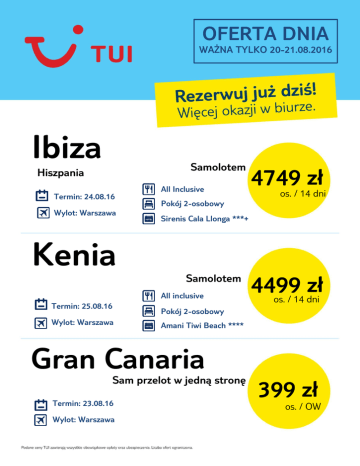 OFERTA DNIA WAŻNA TYLKO 20-21.08.2016 Ibiza Samolotem Hiszpania Hiszpania Termin: 24.08.16 Wylot: Warszawa Kenia All Inclusive os. / 14 dni Pokój 2-osobowy Sirenis Cala Llonga ***+ Samolotem All inclusive Termin: 25.08.16 4749 zł 4499 zł os. / 14 dni Pokój 2-osobowy Wylot: Warszawa Amani Tiwi Beach **** Gran Canaria Sam przelot w jedną stronę Termin: 23.08.16 Wylot: Warszawa 399 zł os. / OW