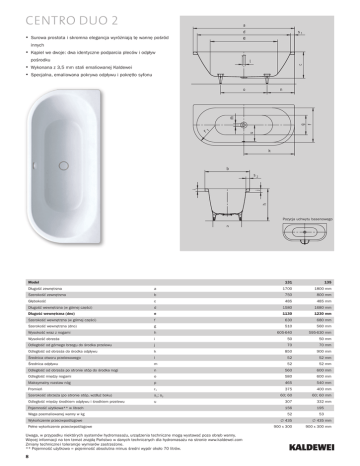 CENTRO DUO Centro Duo 2 ## a d s1 e Surowa prostota i skromna elegancja wyróżniają tę wannę pośród b innych i Kąpiel we dwoje: dwa identyczne podparcia pleców i odpływ pośrodku l ## Wykonana z 3,5 mm stali emaliowanej Kaldewei ## Specjalna, emaliowana pokrywa odpływu i pokrętło syfonu c ## o n p m CENTRO DUO 2 RUND g f a d b u r1 s1 e CENTRO DUO 2 RUND s2 b s2 M 1:20 Badewanne Modell-Nr.: EDV-Nr. Größe n Äußere Länge a Äußere Breite b Tiefe c d Innere Länge (oben) e Innere Länge (unten) f Innere Breite (oben) Innere Breite (unten) g p Höhe mit Füßen h Randhöhe i Abstand Oberkante bis Mitte Überlaufloch j Abstand Wannenrand (Fuß) bis Mitte Ablauflochk Durchmesser Überlaufloch l Durchmesser Ablaufloch m Abstand Fußseite Wannenrand bis Mitte Fuß n Abstand zwischen den Füßen o k Fußbreite max. p Äußerer Radius r Randbreite (Fußseite; Längsseite) s ;s Abstand Mitte Ab- bis Mitte Überlaufloch u Abstand Wannenrand bis mittlere Lochbohrung pa max. Überstand pb Wasserinhalt bis Überlauf in ltr. Gewicht der Rohwanne (ohne Zubehör) in kg 131 Gewicht Modell-Nr.: der emaillierten Wanne in kg o n Model Długość zewnętrzna 1 u r1 g f m u r1 g f o m h c l j i e h l s1 c a d j i k 1 k a M 1:20 Badewanne b EDV-Nr. Głębokość c Größe Długość wewnętrzna (w górnej części) d Äußere Länge a PR-376-00 Äußere Breite b Długość wewnętrzna (dno) e Tiefe c M 1:20 Badewanne Modell-Nr.: 131 Szerokość wewnętrzna (w górnej części) f Innere Länge (oben) d EDV-Nr. 2831.0001 Szerokość wewnętrzna (dno) g Innere Länge (unten) e Größe 1700x750 Innere Breite (oben) f Wysokość wraz z nogami Äußere Länge a h 1700 Innere Breite (unten) g b i 750 Wysokość obrzeża Äußere Breite Höhe mit Füßenc h Tiefe 485 Odległość od górnegoInnere brzeguLänge do środka (oben)przelewu d j 1580 Randhöhe i e k bis Mitte Überlaufloch Längeodpływu (unten) 1130 Abstand Oberkante j Odległość od obrzeżaInnere do środka Innere Breite (oben) f 630 Abstand Wannenrand (Fuß) bis Mitte Ablauflochk Średnica otworu przelewowego l g Innere Breite (unten) 510 Durchmesser Überlaufloch l h m 605-640 Średnica odpływu Höhe mit Füßen Durchmesser Ablaufloch m Randhöhe i 50 n Odległość od obrzeża po stronie stóp do środka nogi Abstand Fußseite nWannenrand bis Mitte Fuß Abstand Oberkante bis Mitte Überlaufloch j 70 Abstand zwischen den Füßen o Odległość między nogami Abstand Wannenrand (Fuß) bis Mitte Ablauflochk o 850 Fußbreite max.l p Durchmesser Überlaufloch 52 Maksymalny rozstaw nóg Äußerer Radiusm p Durchmesser Ablaufloch 52r1 Randbreite s1 ; s2 Promień Abstand Fußseite Wannenrand bis Mitte Fuß (Fußseite; n r1 Längsseite) 560 u Mitte Überlaufloch Abstand den boku) Füßen Abstand Mitte oAb-s1bis 580 Szerokość obrzeża (po stroniezwischen stóp, wzdłuż ; s2 Abstand Wannenrand bis mittlere Lochbohrung 465 pa Fußbreite max. p Odległość między środkiem odpływu i środkiem przelewu u max. Überstandr pb Äußerer Radius 375 Randbreite s ; sÜberlauf in ltr. 60; 60 Pojemność użytkowa** w litrach(Fußseite; Längsseite)Wasserinhalt bis Abstand Mitte Ab- bis Mitte Überlaufloch u Gewicht der Rohwanne (ohne Zubehör) in kg 307 Waga poemaliowanejAbstand wanny wWannenrand kg bis mittlereGewicht Lochbohrung pa 850 der emaillierten Wanne in kg Szerokość zewnętrzna 1 1 max. Überstand Wykończenie przeciwpoślizgowe 146 Wasserinhalt bis Überlauf in ltr. ? Pełne wykończenie przeciwpoślizgowe Gewicht der Rohwanne (ohne Zubehör) in kg ? PR-376-00 Gewicht der emaillierten Wanne in kg 51,4 Uwaga, w przypadku niektórych systemów hydromasażu, urządzenia techniczne mogą wystawać poza obręb wanny. Więcej informacji na ten temat znajdą Państwo w danych technicznych dla hydromasażu na stronie www.kaldewei.com Zmiany techniczne i tolerancje wymiarów zastrzeżone. PR-376-00 ** Pojemność użytkowa = pojemność absolutna minus średni wypór około 70 litrów. 8 pb 2 2 131 2831.0001 1700x750 p 1700 750 485 1580 1130 Pozycja uchwytu basenowego630 510 605-640 50 70 850 52 52 560 580 465 375 60; 60 307 850 131 135146 1700 1800 mm? ? 750 800 mm51,4 2831.0001 485 1700x750 1580 1700 750 1130 485 630 1580 1130 510 630 605-640 510 50 605-640 70 50 70 850 850 52 52 52 52 560 560 580 580 465 375 465 60; 60375 30760; 60 850 146 307 ? 156 ? 52 51,4 485 mm 1680 mm 1230 mm 680 mm 560 mm 595-630 mm 50 mm 70 mm 900 mm 52 mm 52 mm 600 mm 600 mm 540 mm 400 mm 60; 60 mm 332 mm 195 mm 53 mm ∅ 435 ∅ 435 mm 900 x 300 900 x 300 mm 02.09.2011 Gohr 02.09.2011 G
