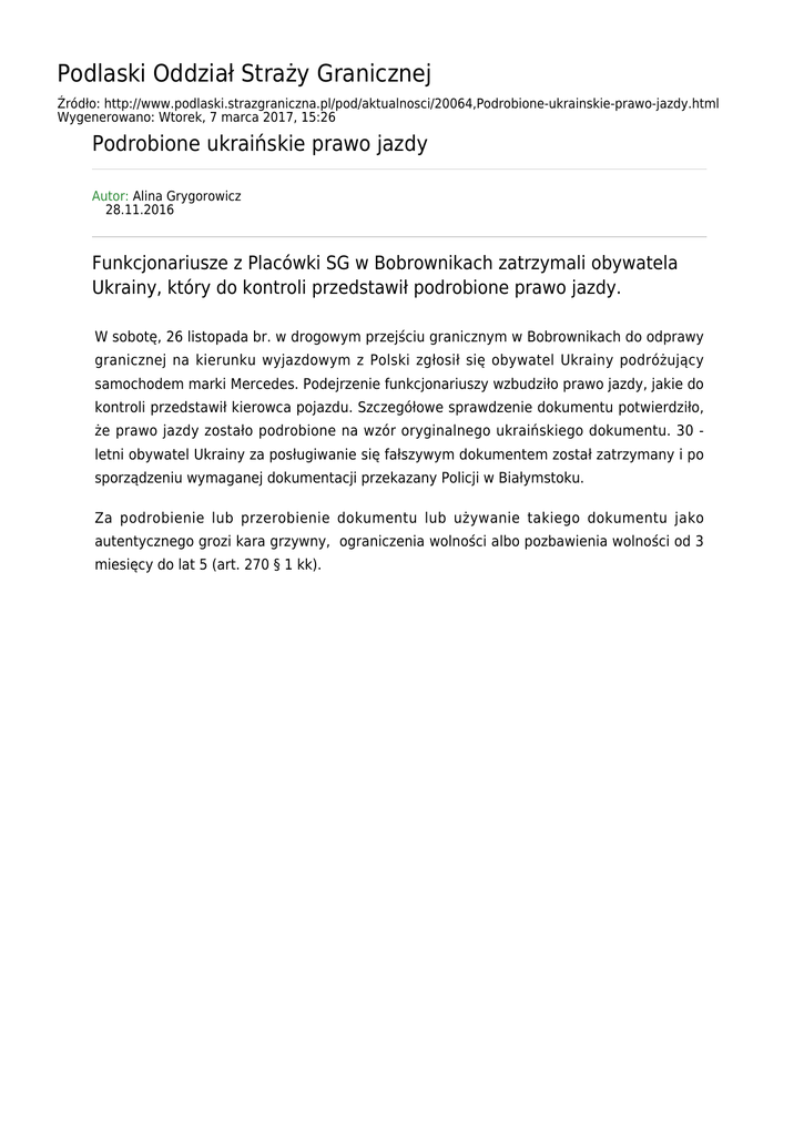 Podlaski Oddział Straży Granicznej Źródło: http://www.podlaski.strazgraniczna.pl/pod/aktualnosci/20064,Podrobione-ukrainskie-prawo-jazdy.html Wygenerowano: Wtorek, 7 marca 2017, 15:26 Podrobione ukraińskie prawo jazdy Autor: Alina Grygorowicz 28.11.2016 Funkcjonariusze z Placówki SG w Bobrownikach zatrzymali obywatela Ukrainy, który do kontroli przedstawił podrobione prawo jazdy. W sobotę, 26 listopada br. w drogowym przejściu granicznym w Bobrownikach do odprawy granicznej na kierunku wyjazdowym z Polski zgłosił się obywatel Ukrainy podróżujący samochodem marki Mercedes. Podejrzenie funkcjonariuszy wzbudziło prawo jazdy, jakie do kontroli przedstawił kierowca pojazdu. Szczegółowe sprawdzenie dokumentu potwierdziło, że prawo jazdy zostało podrobione na wzór oryginalnego ukraińskiego dokumentu. 30 letni obywatel Ukrainy za posługiwanie się fałszywym dokumentem został zatrzymany i po sporządzeniu wymaganej dokumentacji przekazany Policji w Białymstoku. Za podrobienie lub przerobienie dokumentu lub używanie takiego dokumentu jako autentycznego grozi kara grzywny, ograniczenia wolności albo pozbawienia wolności od 3 miesięcy do lat 5 (art. 270 § 1 kk).